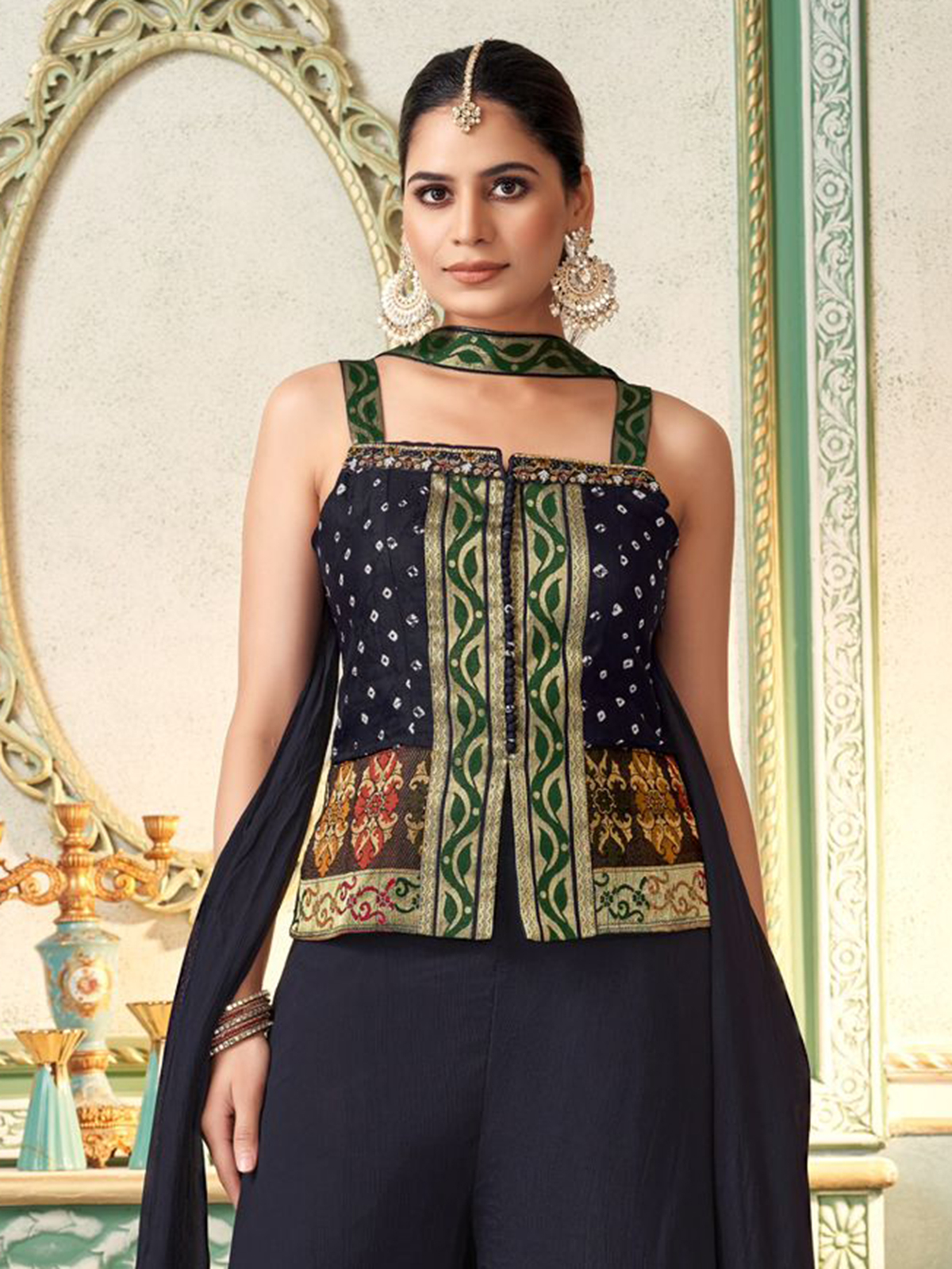 This navy chiffon palazzo suit showcases delicate thread and zari detailing that exudes festive refinement. Featuring a sleeveless square neckline, its modern cut balances traditional artistry. Paired with a printed dupatta, it becomes a versatile ensemble for weddings, Diwali evenings, and family festivities.