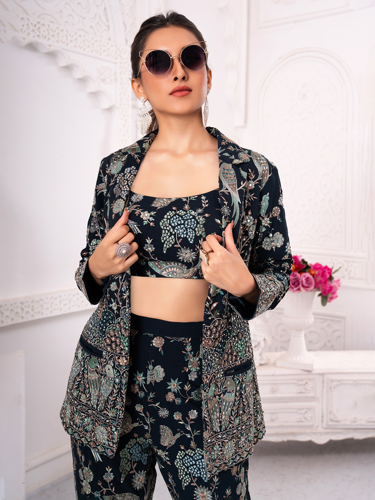 Refined and stylish, this navy cotton silk palazzo suit features a jacket-style silhouette with embroidery, resham, sequins, mirror and stone work. Ideal for wedding parties and upscale events.