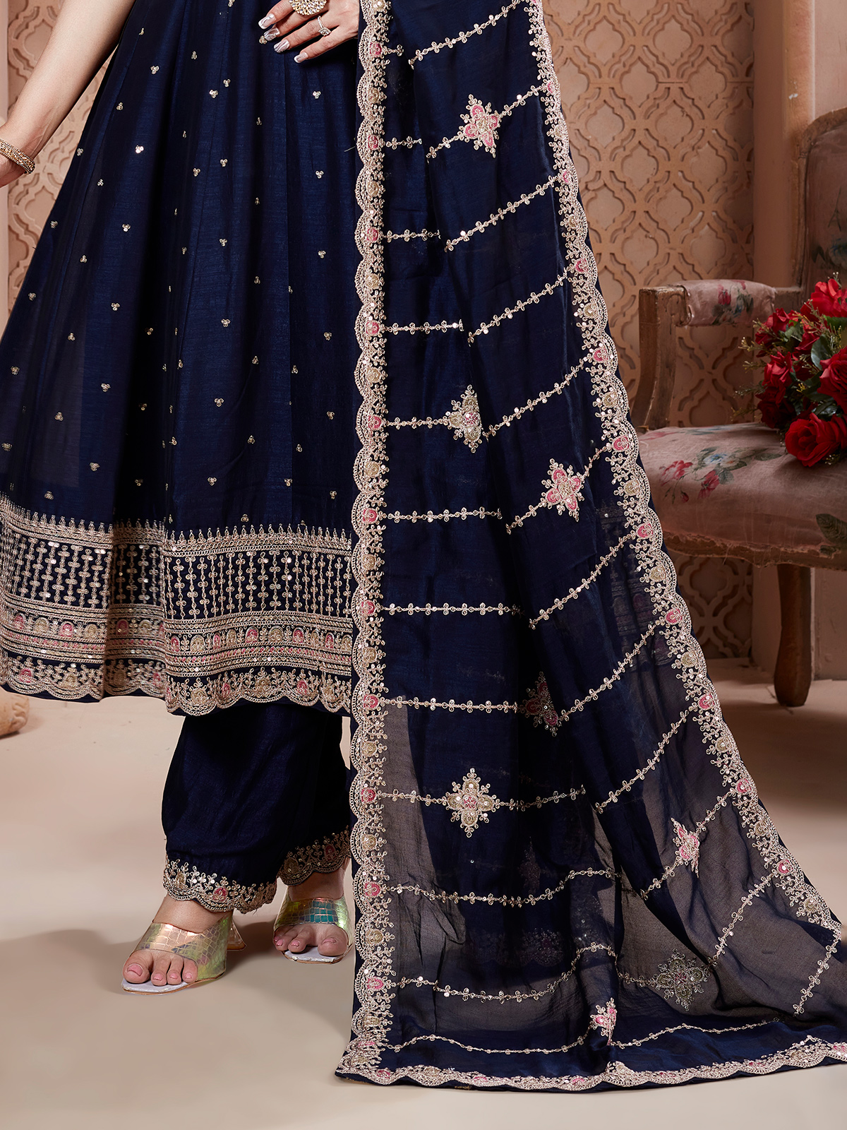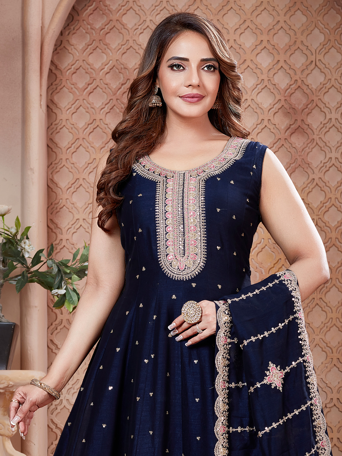 Stay stylish and comfortable in this navy cotton silk salwar suit, highlighted with resham, thread, and sequins. It features a round neckline, sleeveless style, and includes pants and a dupatta—perfect for day-long events.