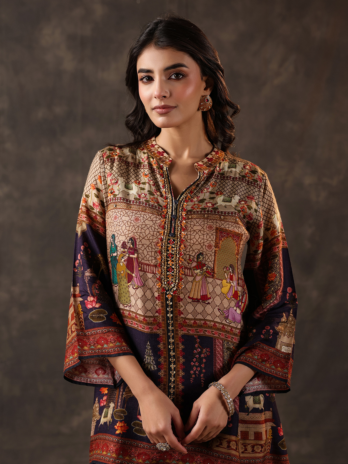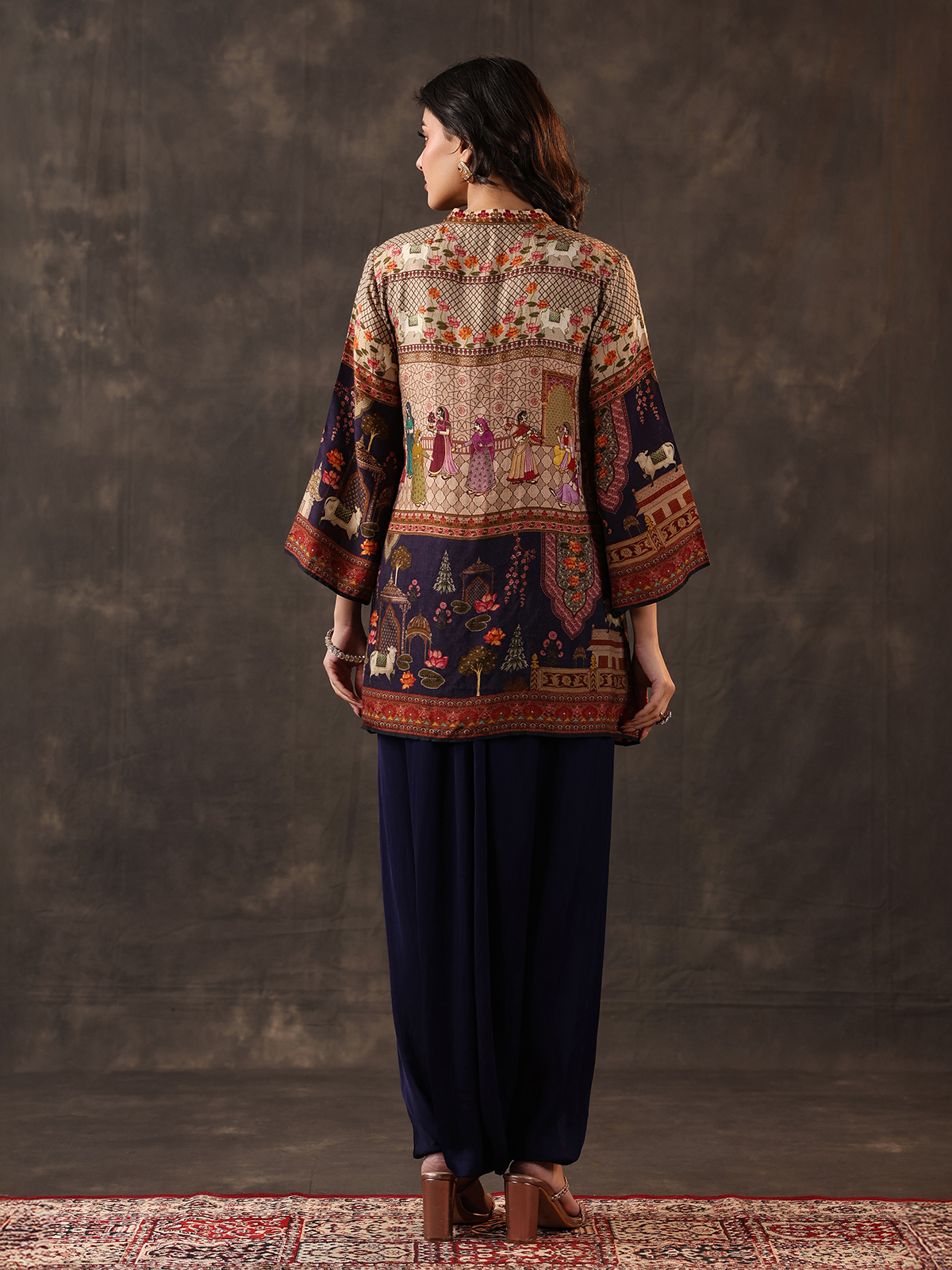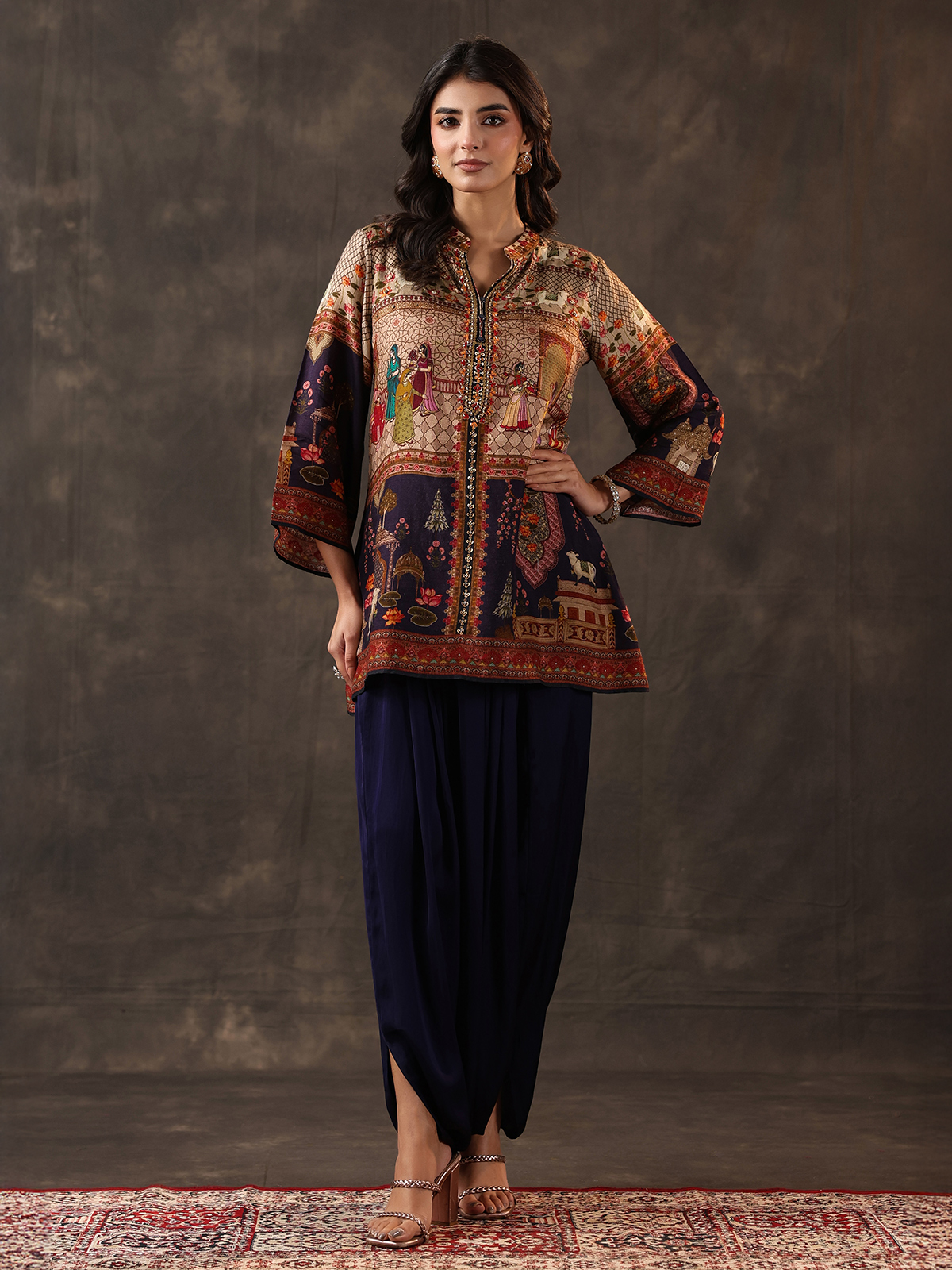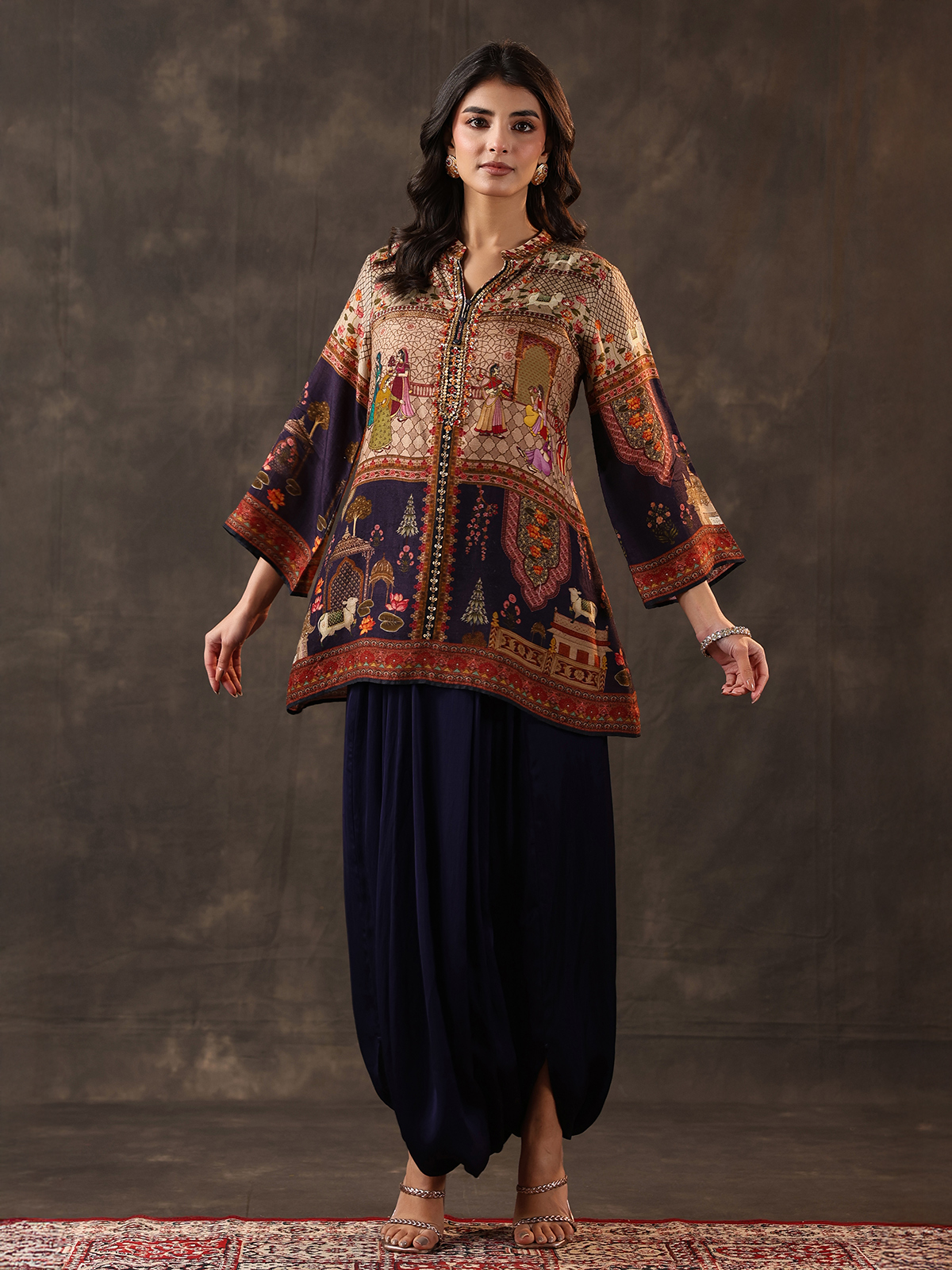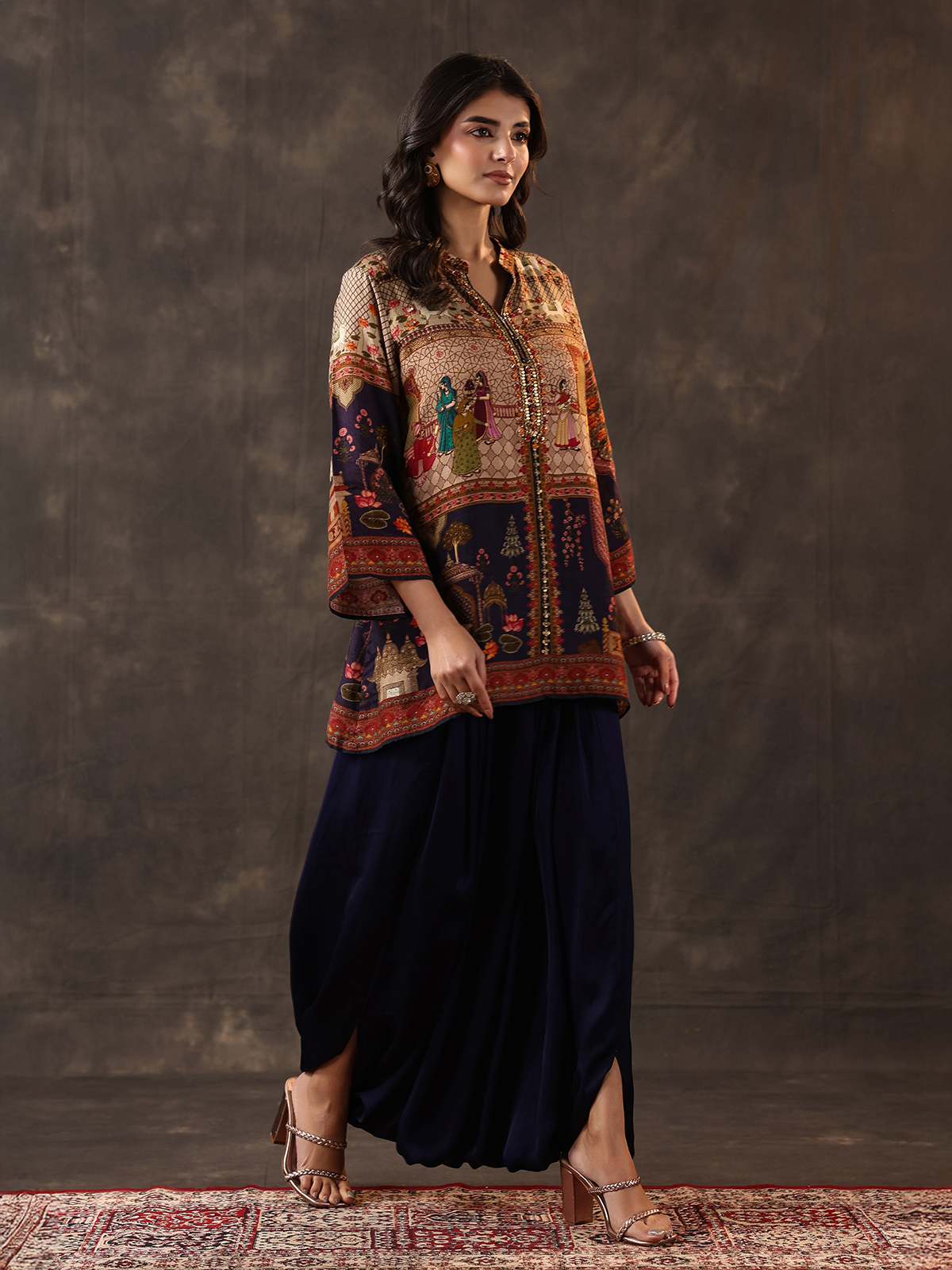 Deep navy tones bring refined elegance to this crepe silk dhoti suit designed for festive charm. Adorned with printed patterns enhanced by thread, beads and sequin work. It reflects subtle shimmer. The stand collar and quarter sleeves add structure. While the dhoti style bottom creates a stylish and contemporary ethnic appeal.