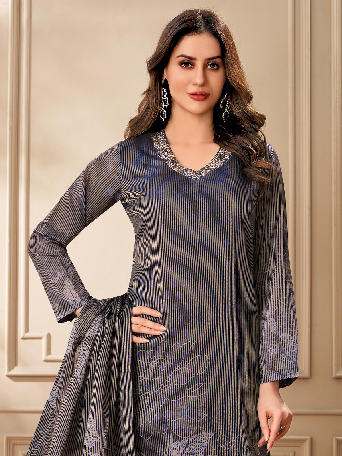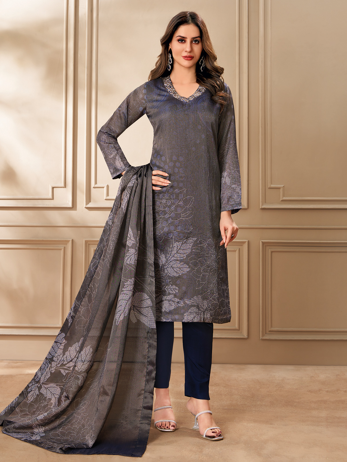 Elevate your festive wardrobe with this navy organza salwar suit. The lustrous fabric is adorned with delicate threadwork and sparkling sequins, creating a luminous effect. A sophisticated V-neckline and full sleeves add to its refined silhouette, while the pant and dupatta with ornate borders complete the look with striking charm.