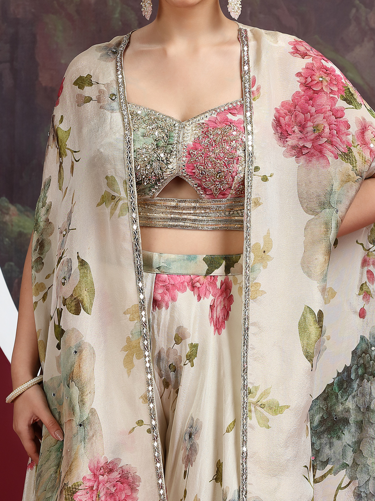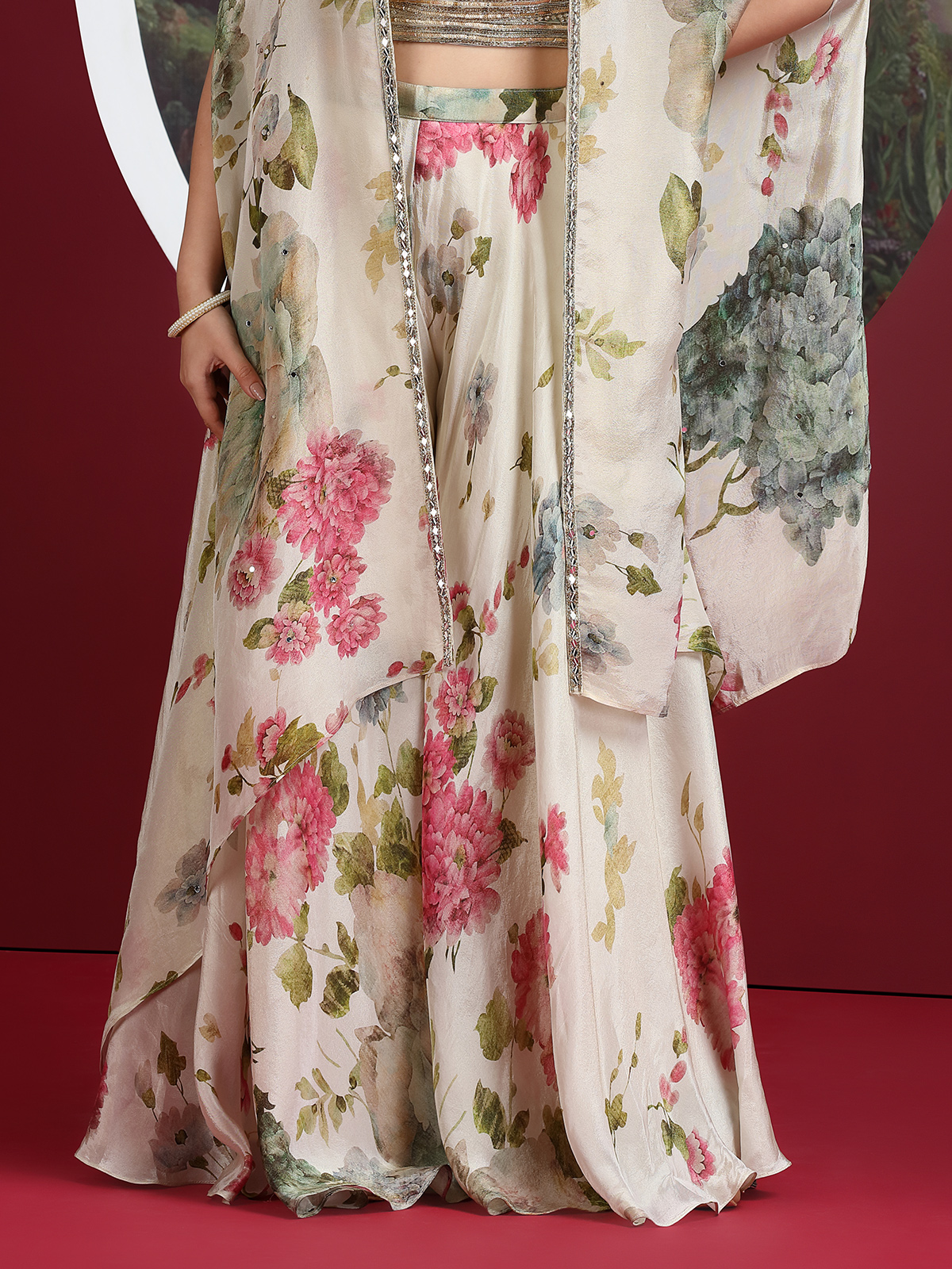 Styled in soft off white crepe silk, this salwar suit features a floral printed long jacket-style silhouette enhanced with mirror, cutdana, and sequin detailing. Paired with a matching palazzo, it offers refined designer elegance, making it ideal for weddings, festive occasions, and reception celebrations.