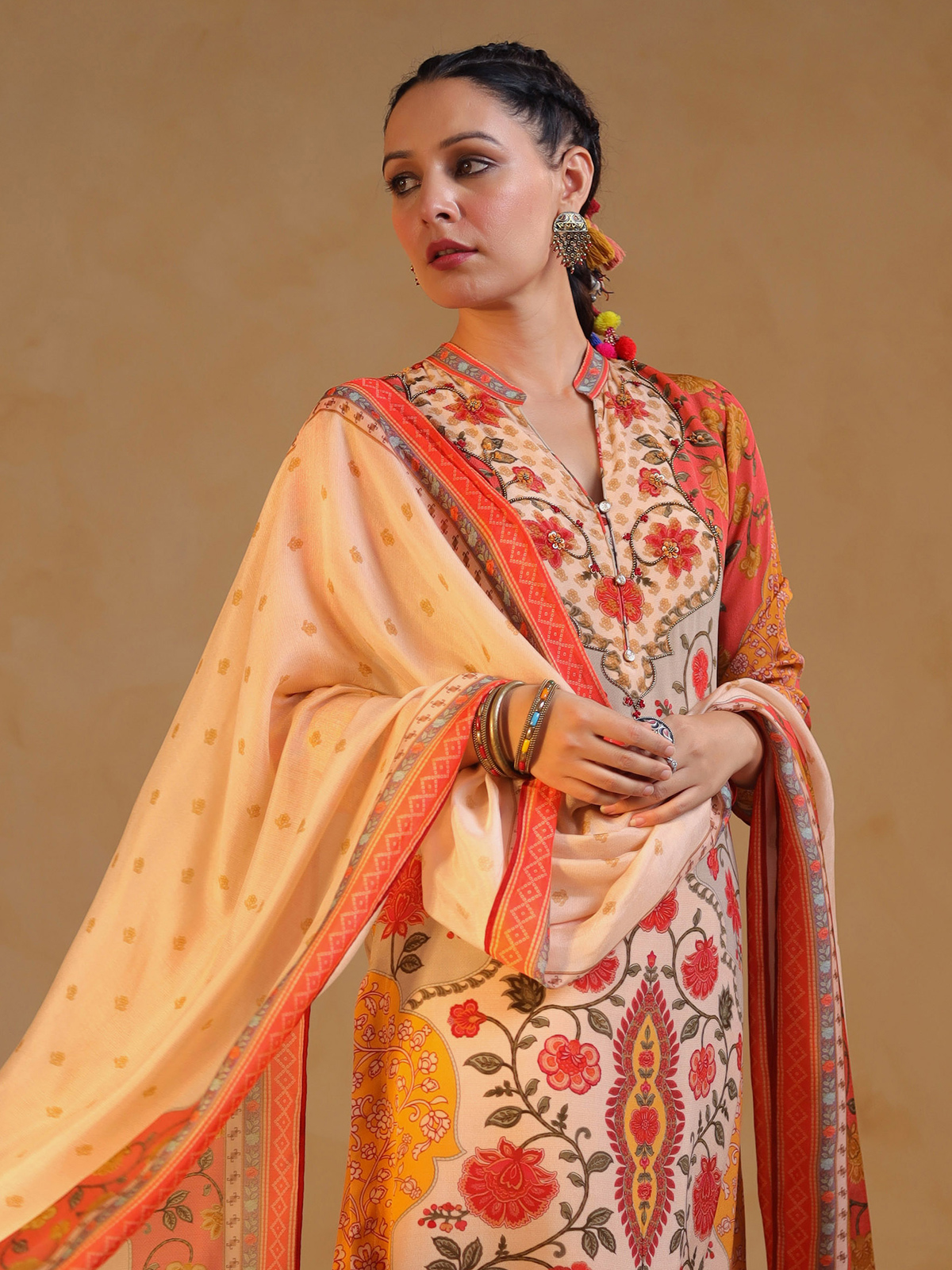 This off-white and orange silk printed suit sparkles with sequins and beads. Finished with a stand neckline and quarter sleeves, paired with pant and dupatta, it makes a vibrant festive look filled with joyful contrast and sophistication.
