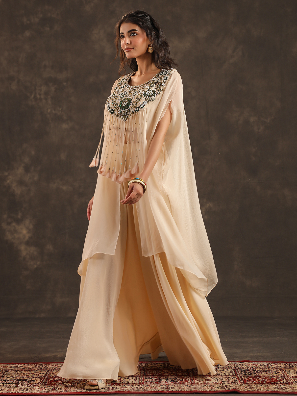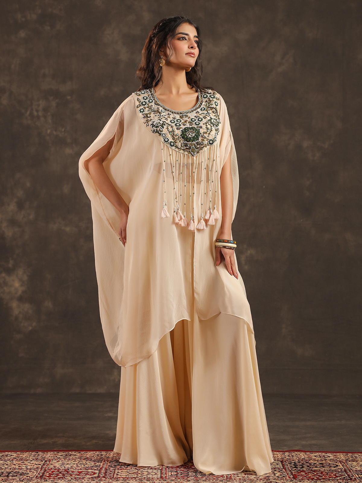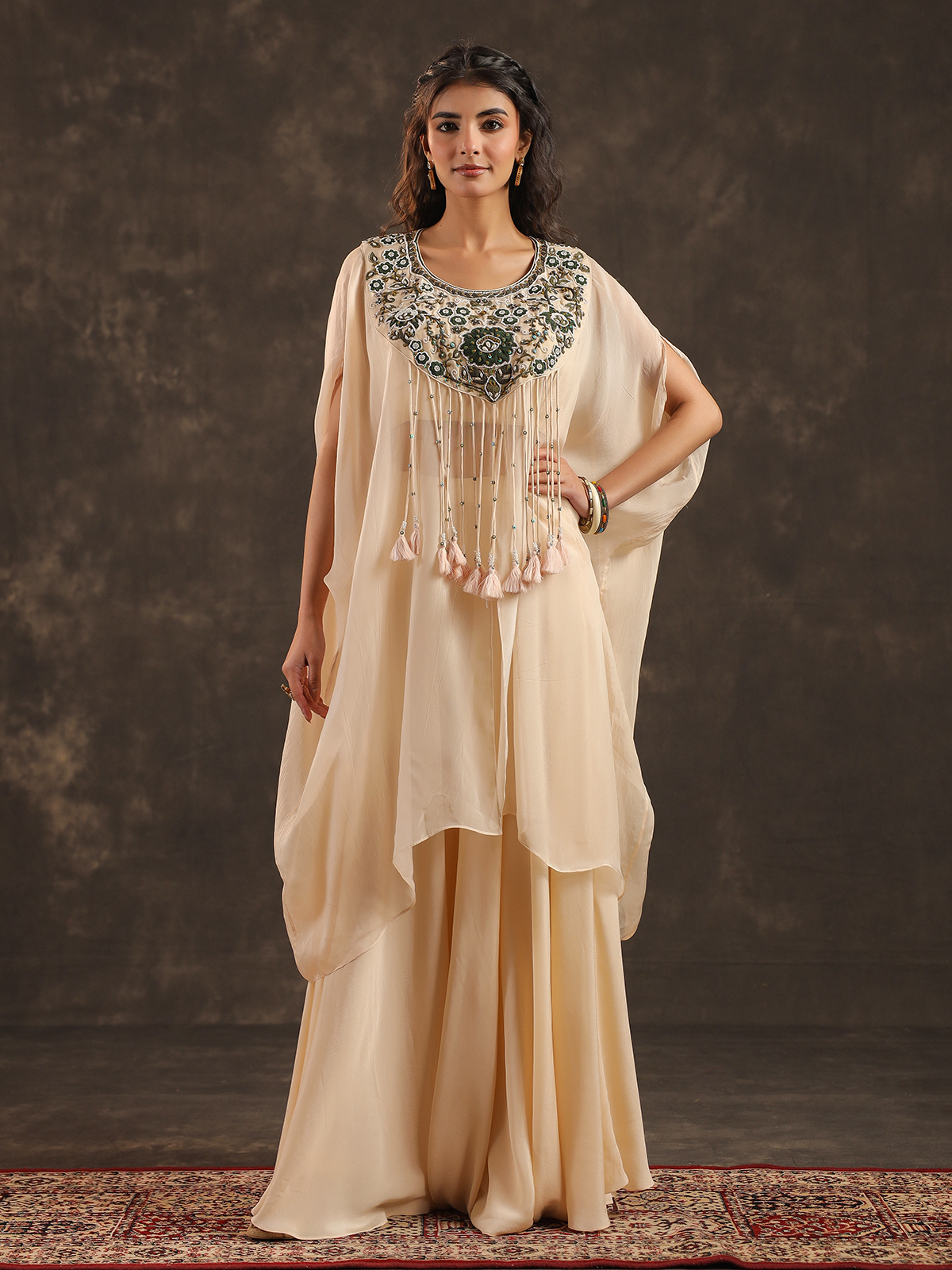 Off White Organza Kaftan Palazzo Suit With Zardosi Embellishments
