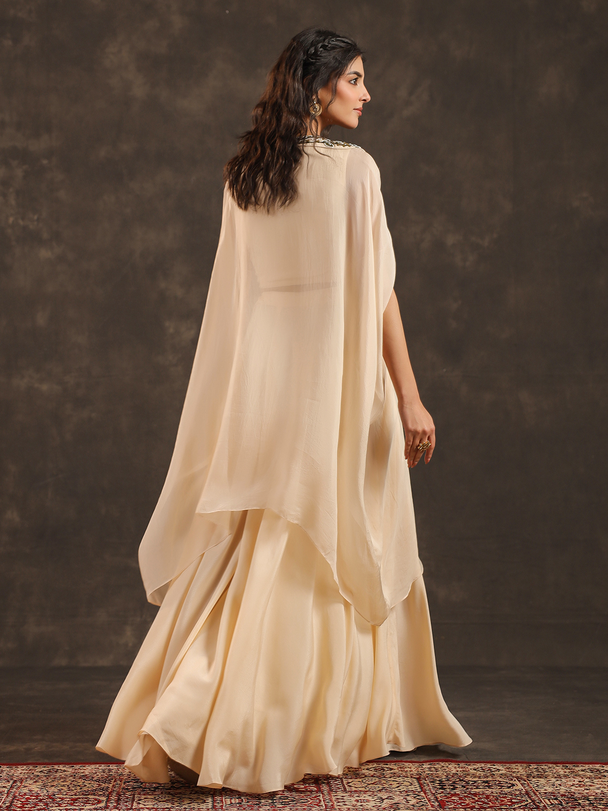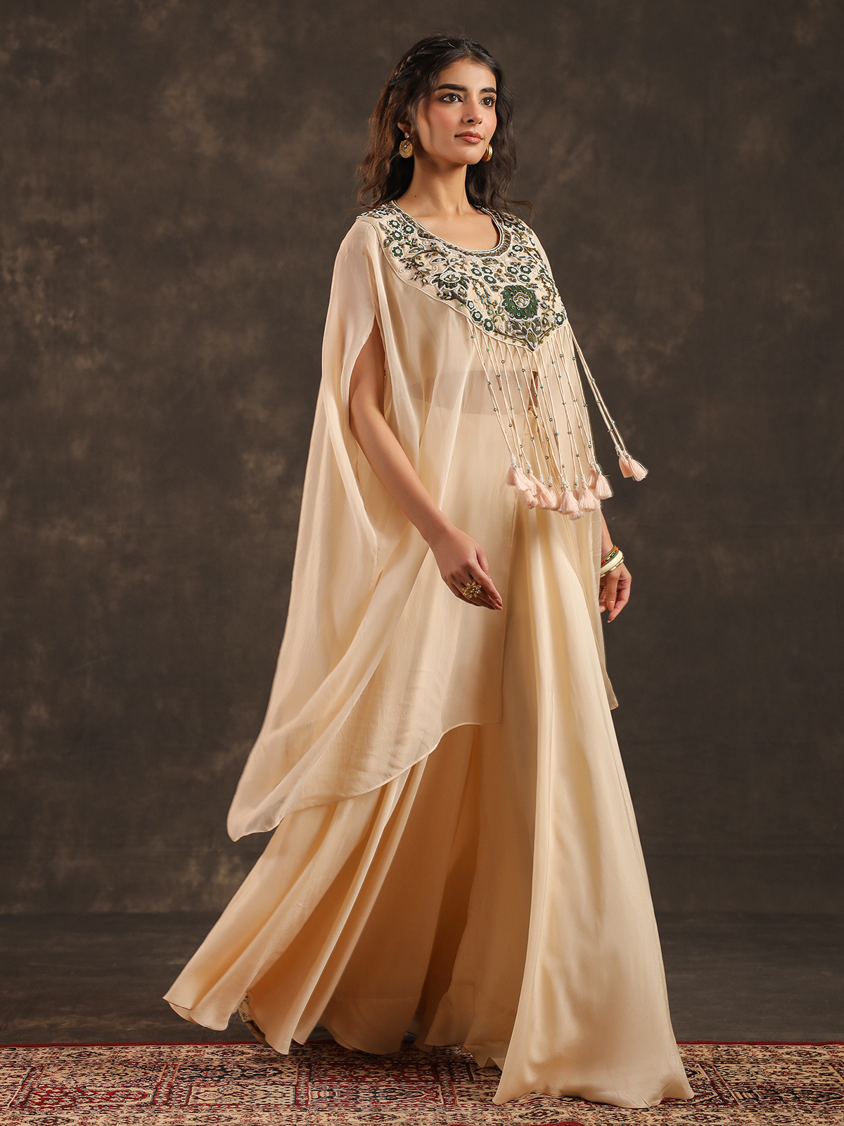 Soft and regal off white organza kaftan suit reflects graceful festive grandeur. The round neckline silhouette is beautifully adorned with thread, pearls, sequins and zardosi embellishments that create luxurious sparkle. Styled with flowing palazzo pants. The ensemble forms a sophisticated ethnic look perfect for weddings, sangeet celebrations and festive occasions.