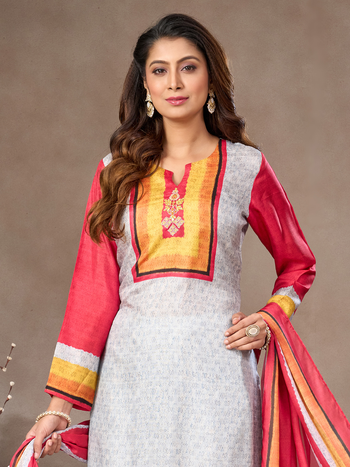 Off white and red silk come together in this festive suit, enhanced with traditional thread and aabla work. A sweetheart neckline and full sleeves complete the design, ideal for ceremonies or cultural occasions.
