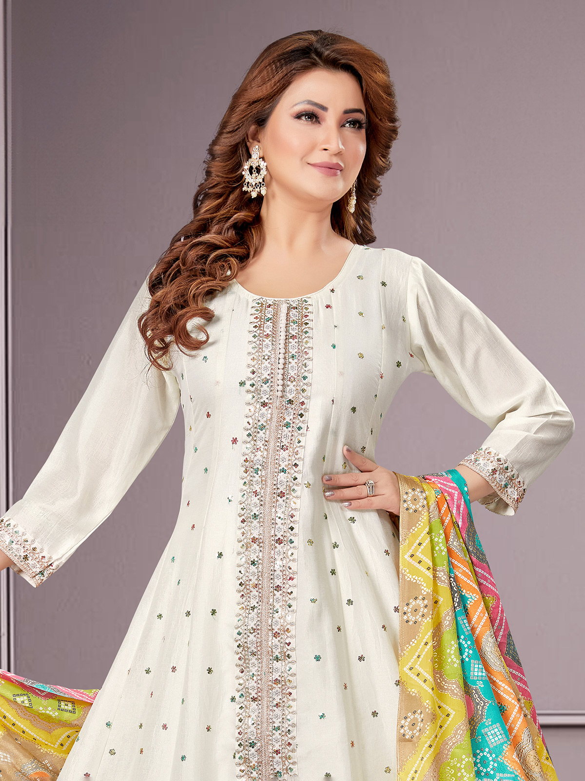Wear this lovely off-white silk salwar suit to show off your attractiveness. This costume was made with sequins, resham, and embroidery. It features quarter sleeves and a round collar. Includes a dupatta with a pattern.