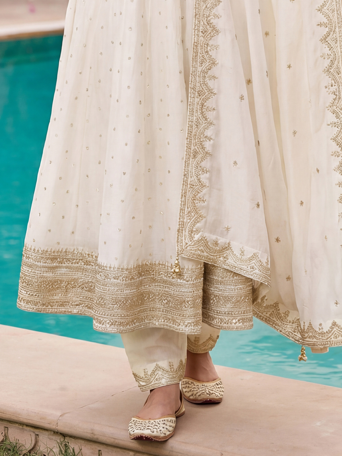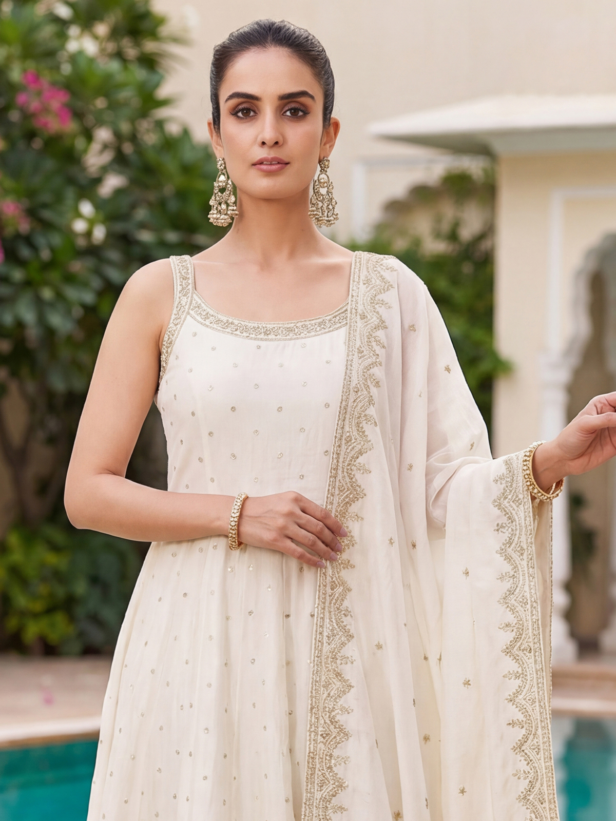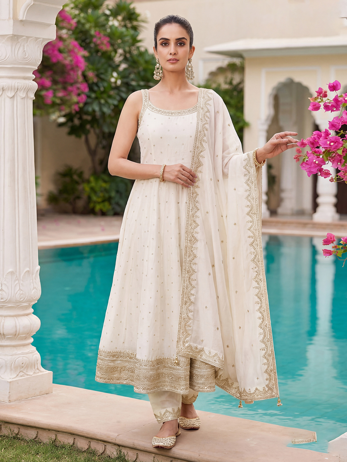 Crafted in elegant off white silk anarkali suit is adorned with resham and sequin work for graceful shimmer. Designed with a round neckline and sleeveless silhouette, it is paired with pants and a dupatta, perfect for weddings, sangeet and festive occasions.