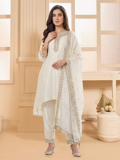 Off White Silk Designer Salwar Suit Paired With Dupatta
