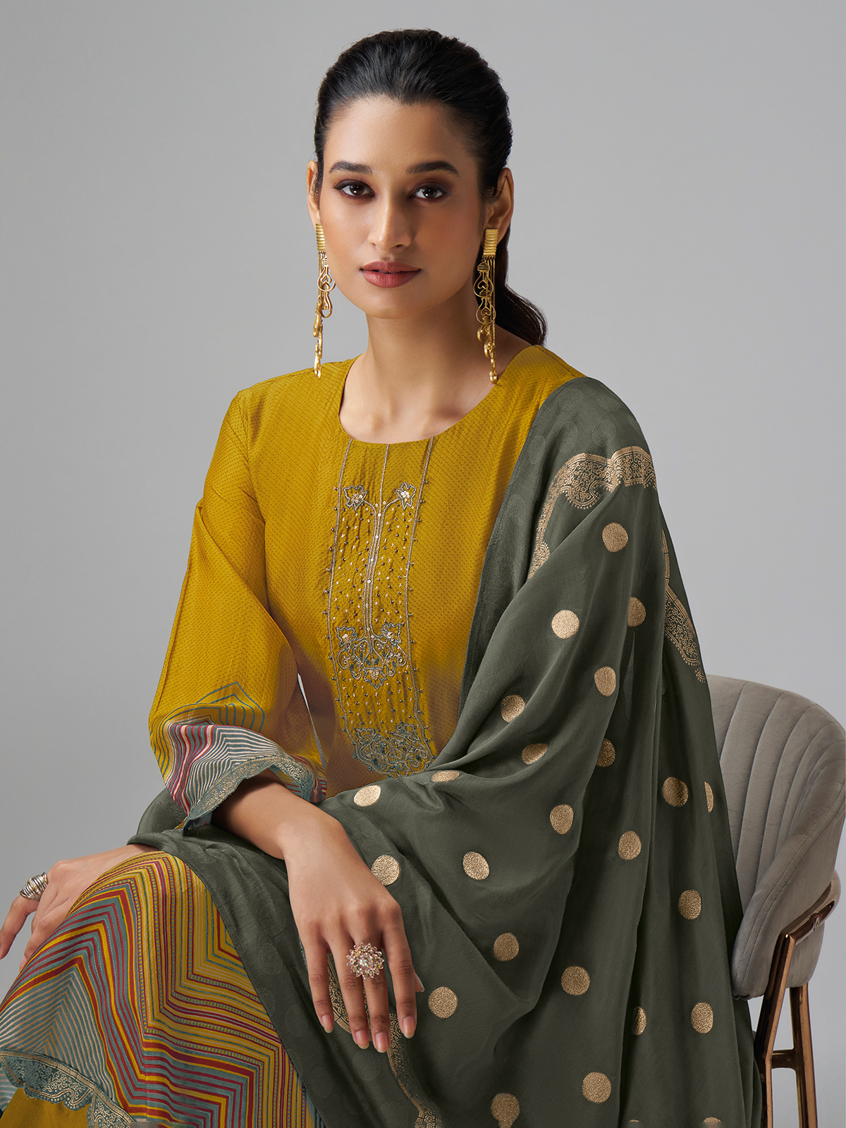 Shine bright in this vibrant olive salwar suit featuring artistic prints on soft tusser silk. The resham, sequins, and zari embellishments enhance its festive allure. Styled with a round neckline, three quarter sleeves, and a coordinating pant and dupatta.