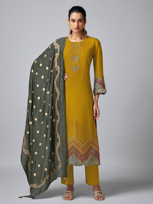 Olive Printed Tussar Silk Salwar Suit For Festive Wear