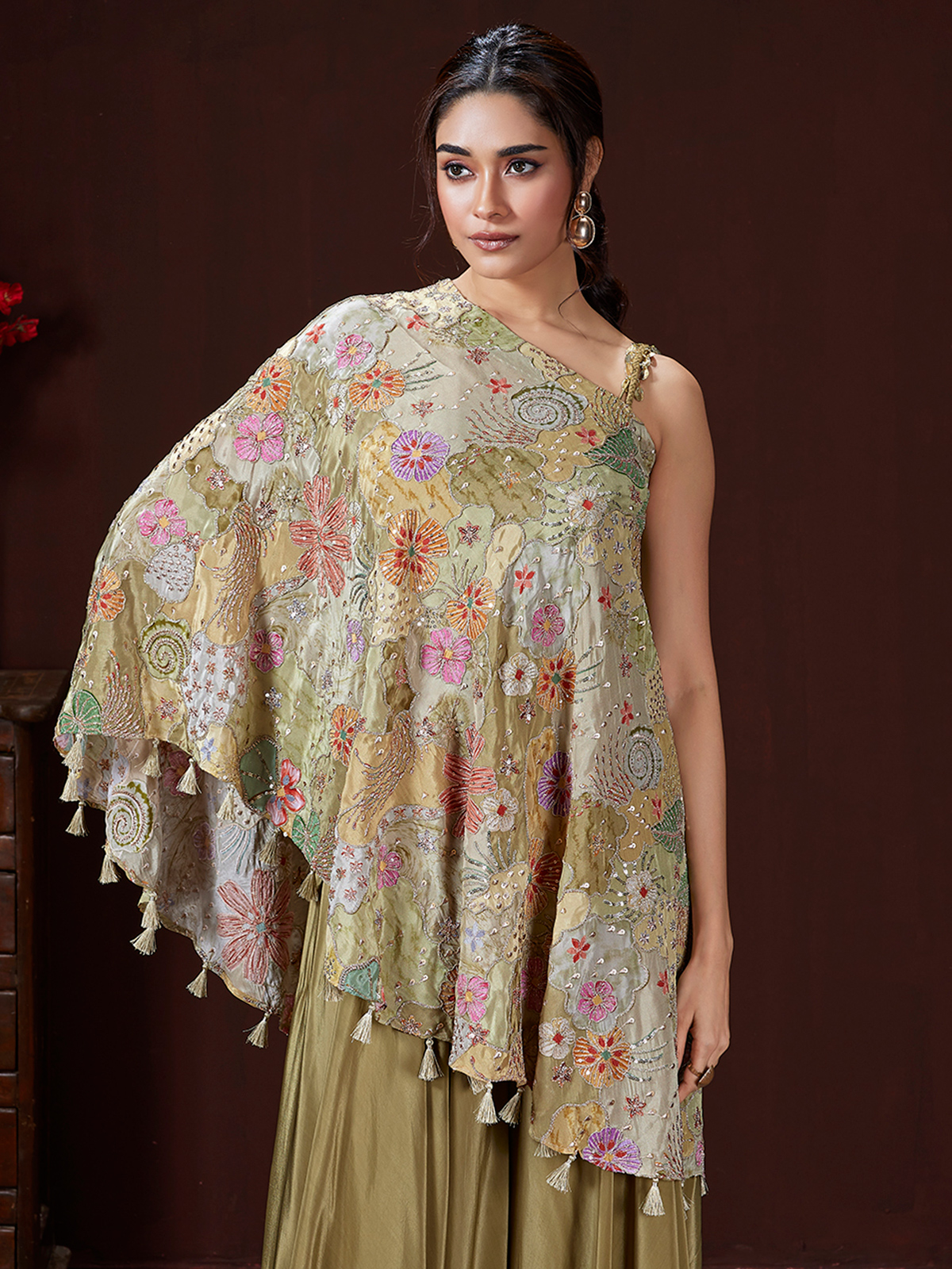 Wrap yourself in the warm charm of olive satin silk, its softness enriched with sequins, resham, and cutdana embellishments tracing delicate patterns. The palazzo pants sway with quiet elegance, completing a contemporary yet poetic festive look infused with gentle sophistication.