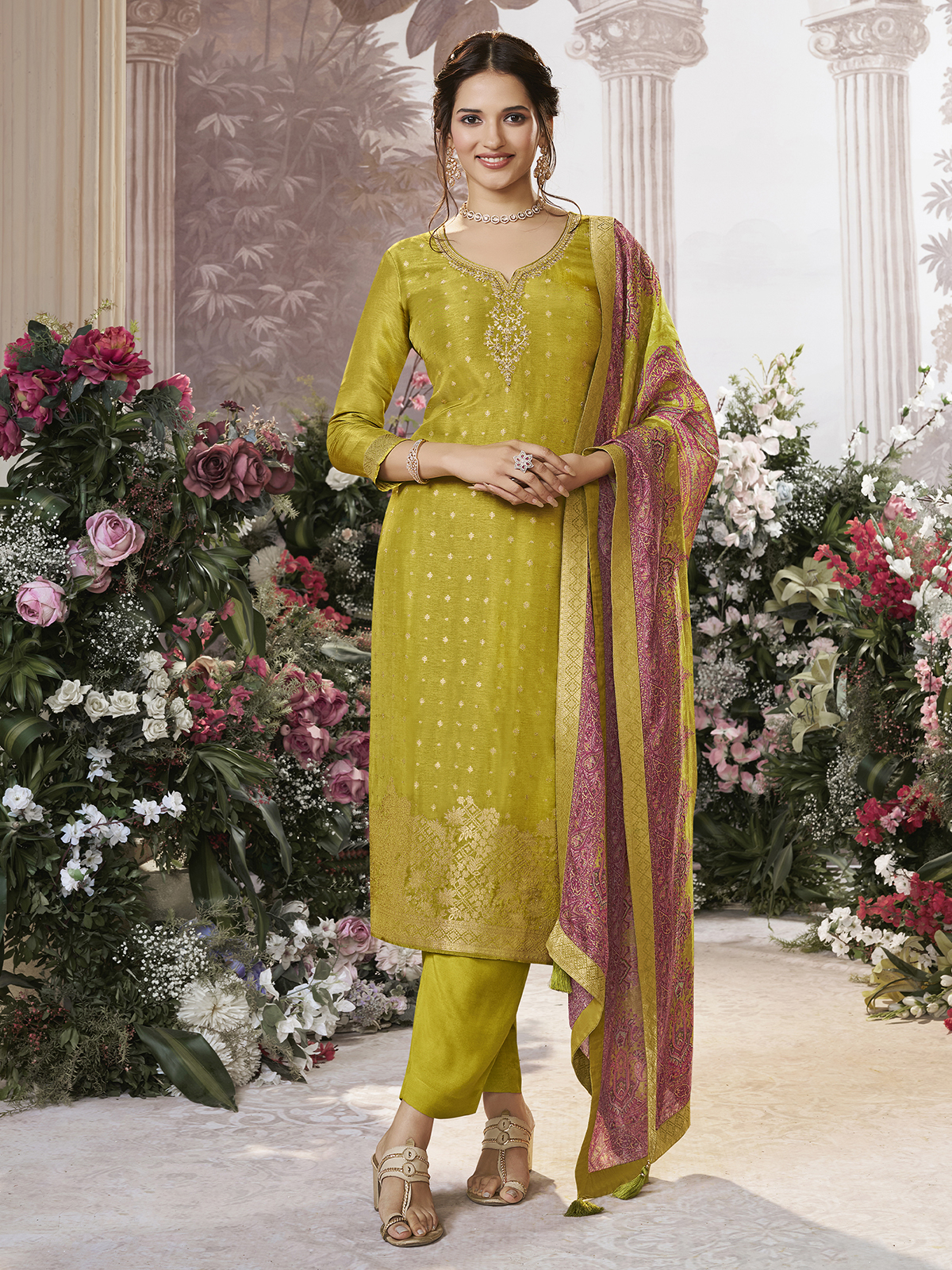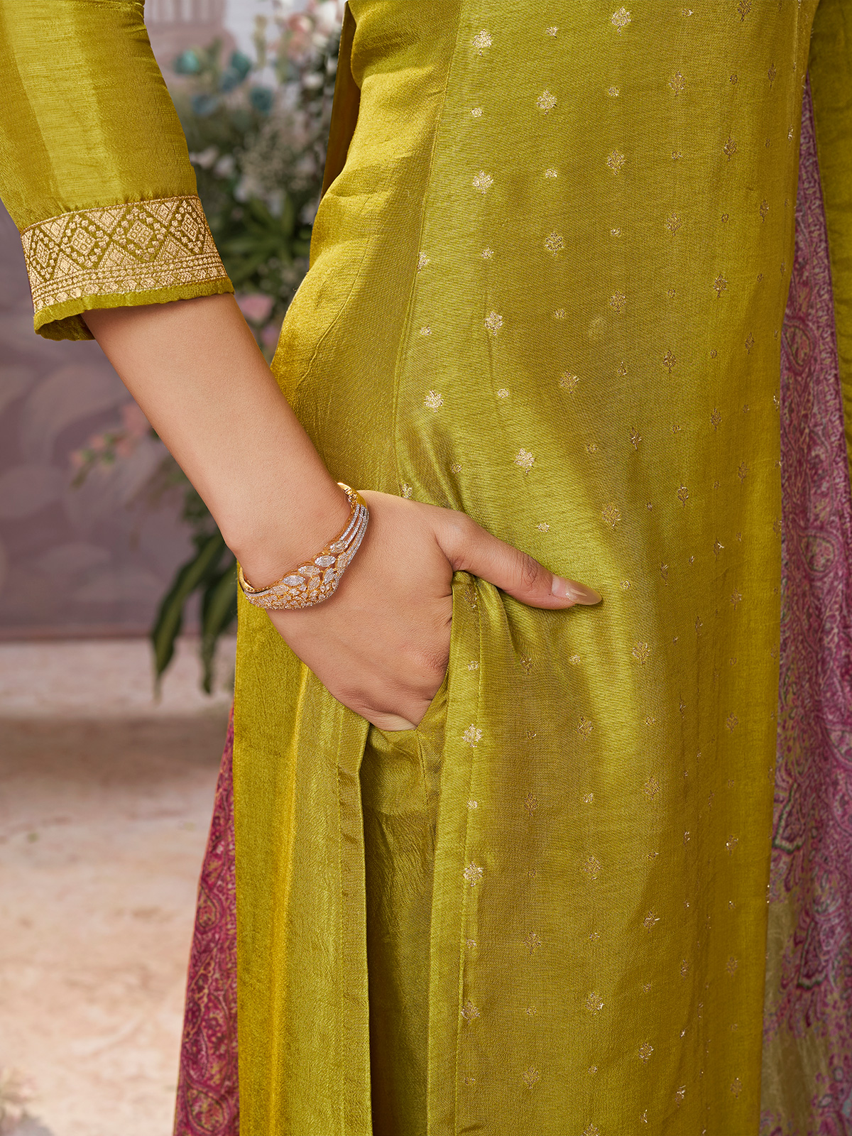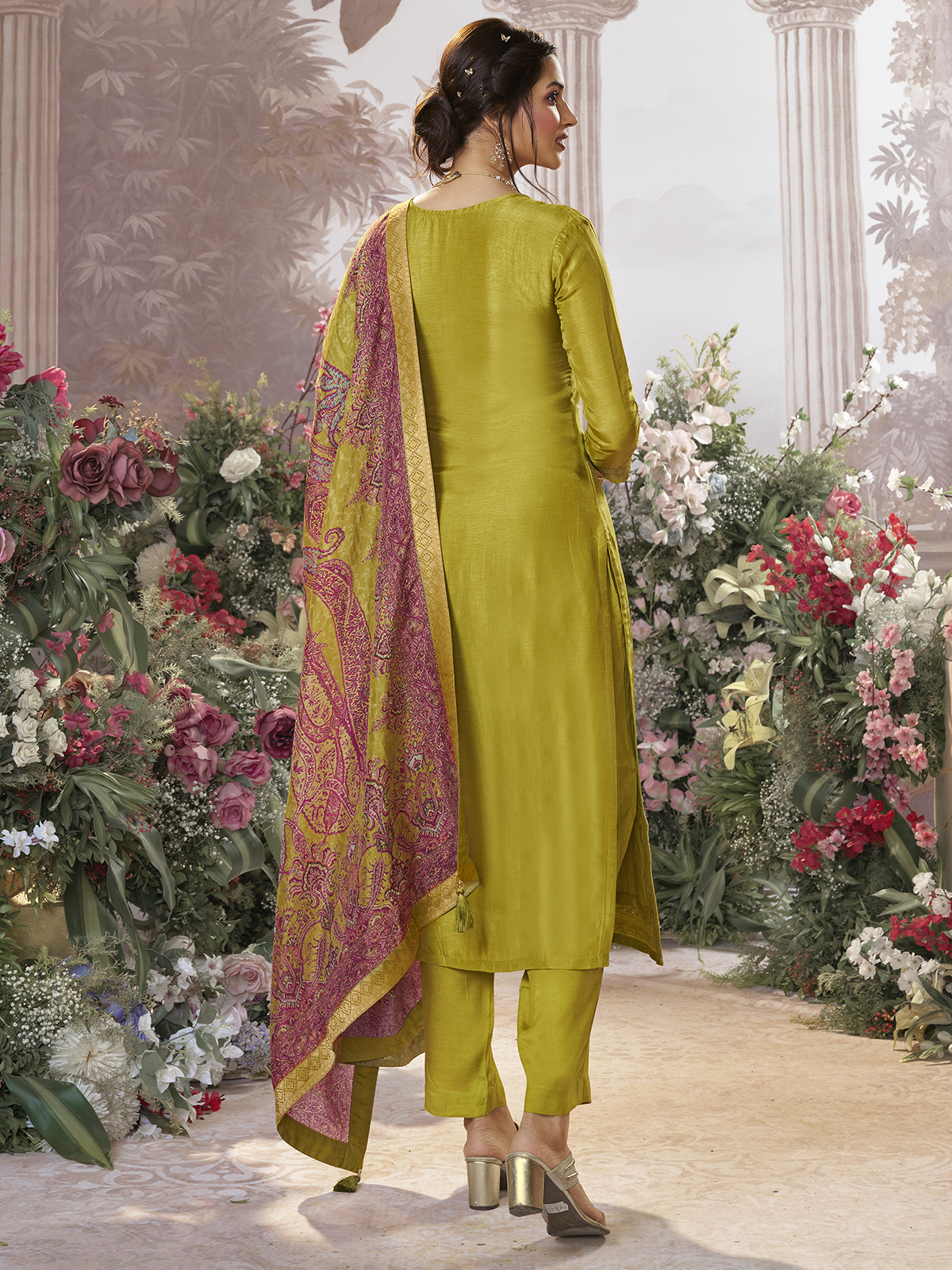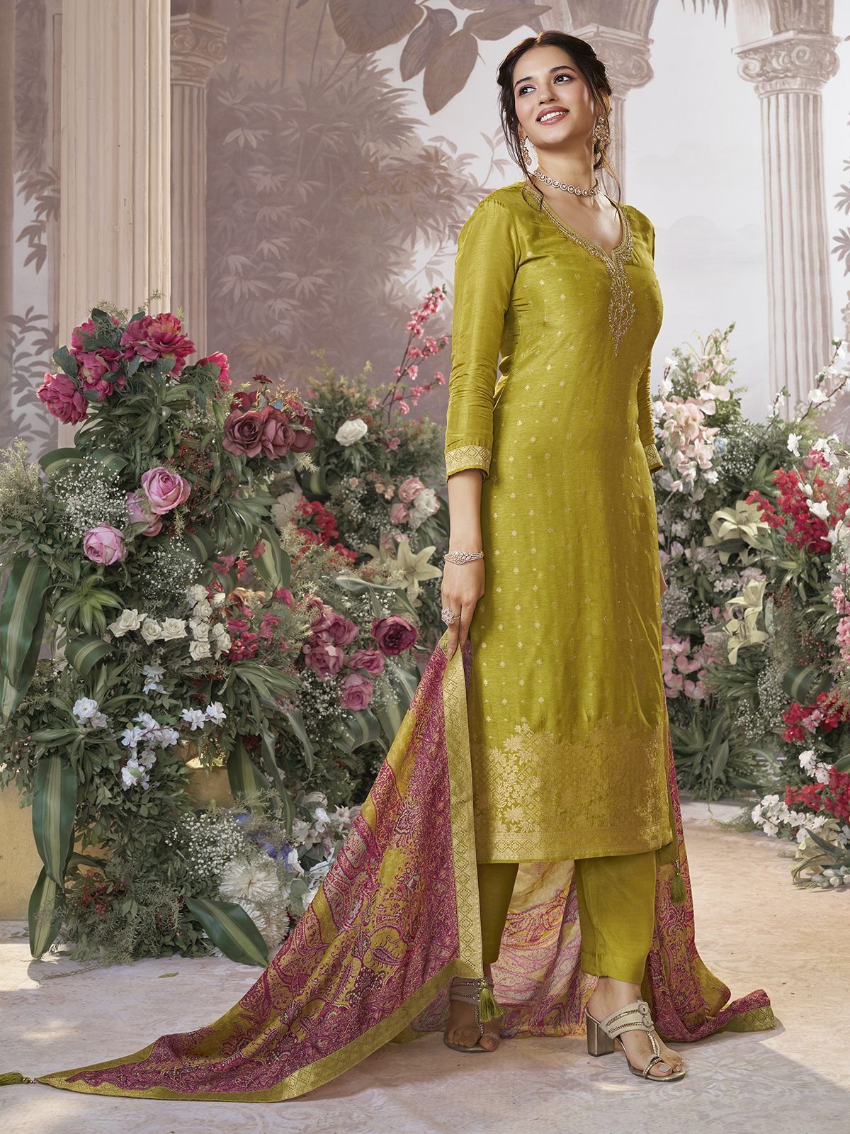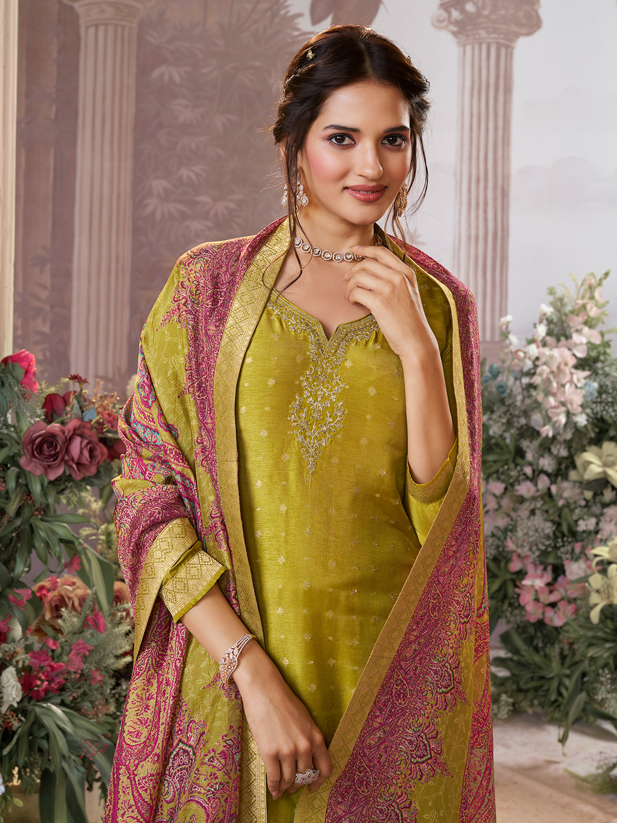 Olive Silk Salwar Suit With Elegant Printed Dupatta