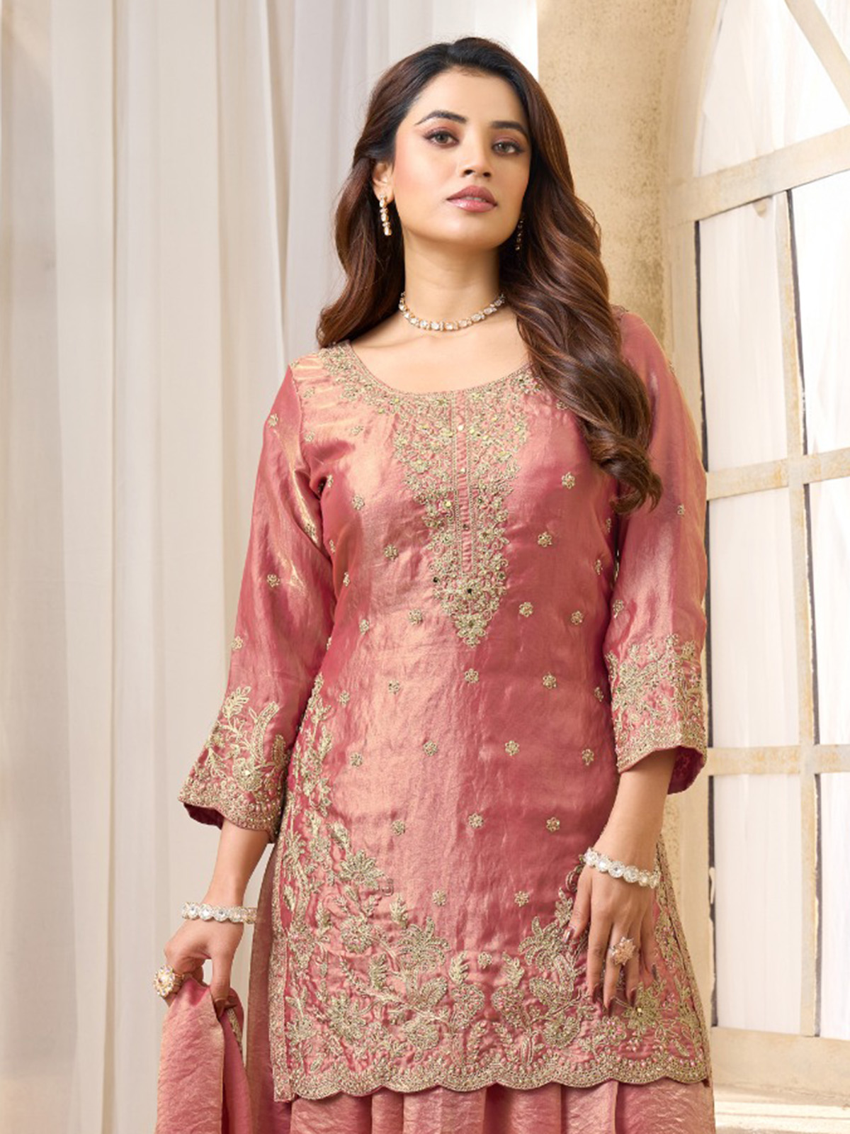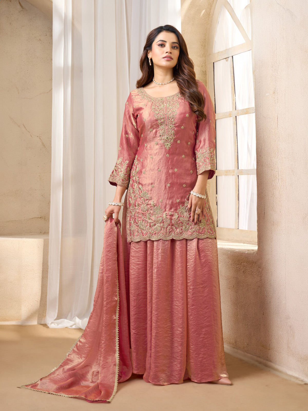 Elegant onion pink tones highlight this graceful chinon silk pakistani style palazzo suit. The kurti features a refined round neckline with quarter sleeves, beautifully embellished with thread, sequins, stone and mirror work. Styled with flowing palazzo bottoms and a delicate dupatta, the ensemble creates a sophisticated festive look perfect for weddings and receptions.