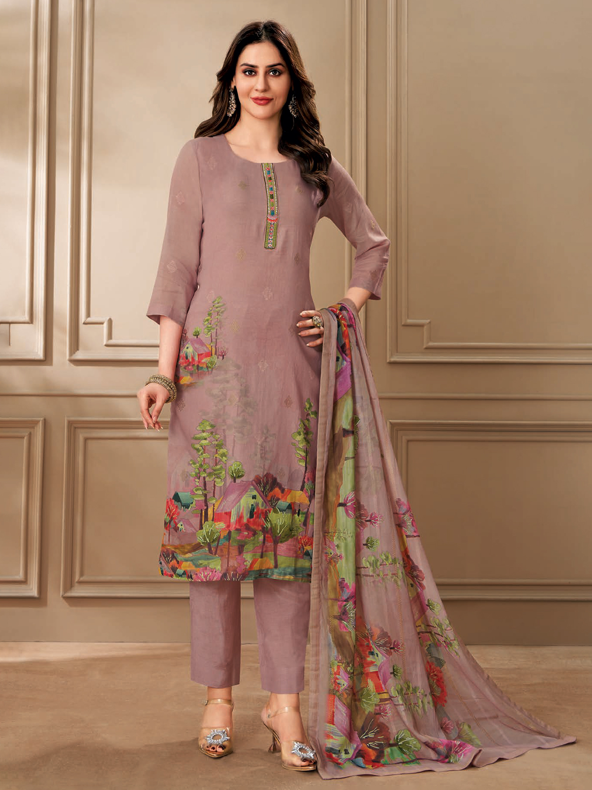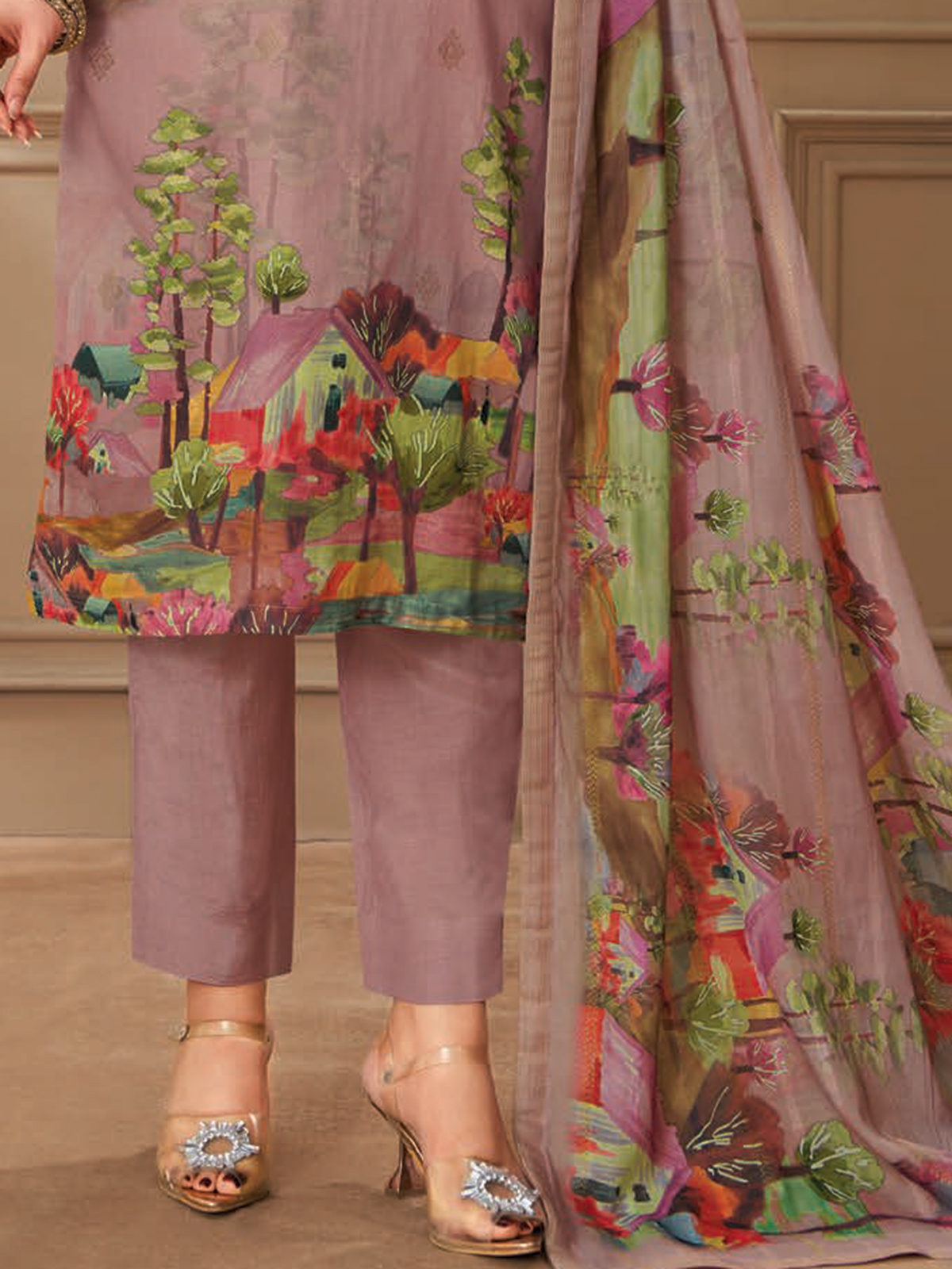 Step into tradition with grace in our onion pink printed cotton salwar suit. Crafted from premium cotton, this outfit features a round neckline and quarter sleeves. The matching pants and dupatta complete the look with effortless charm.