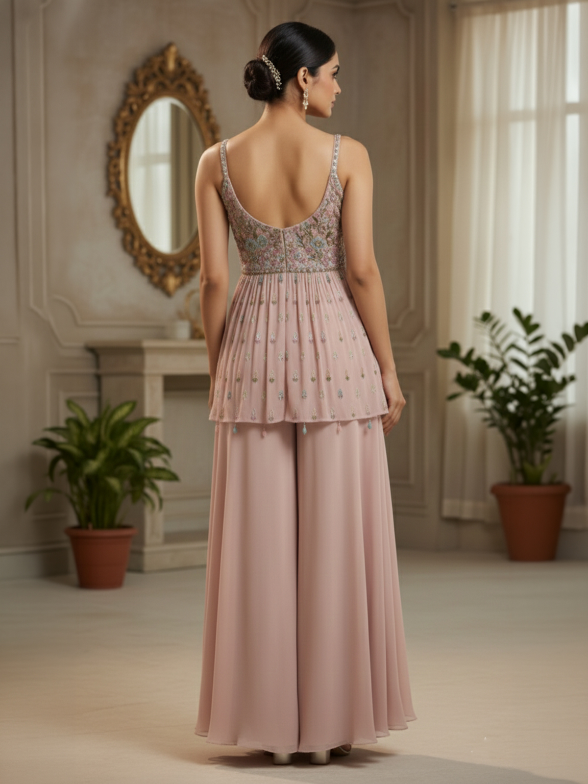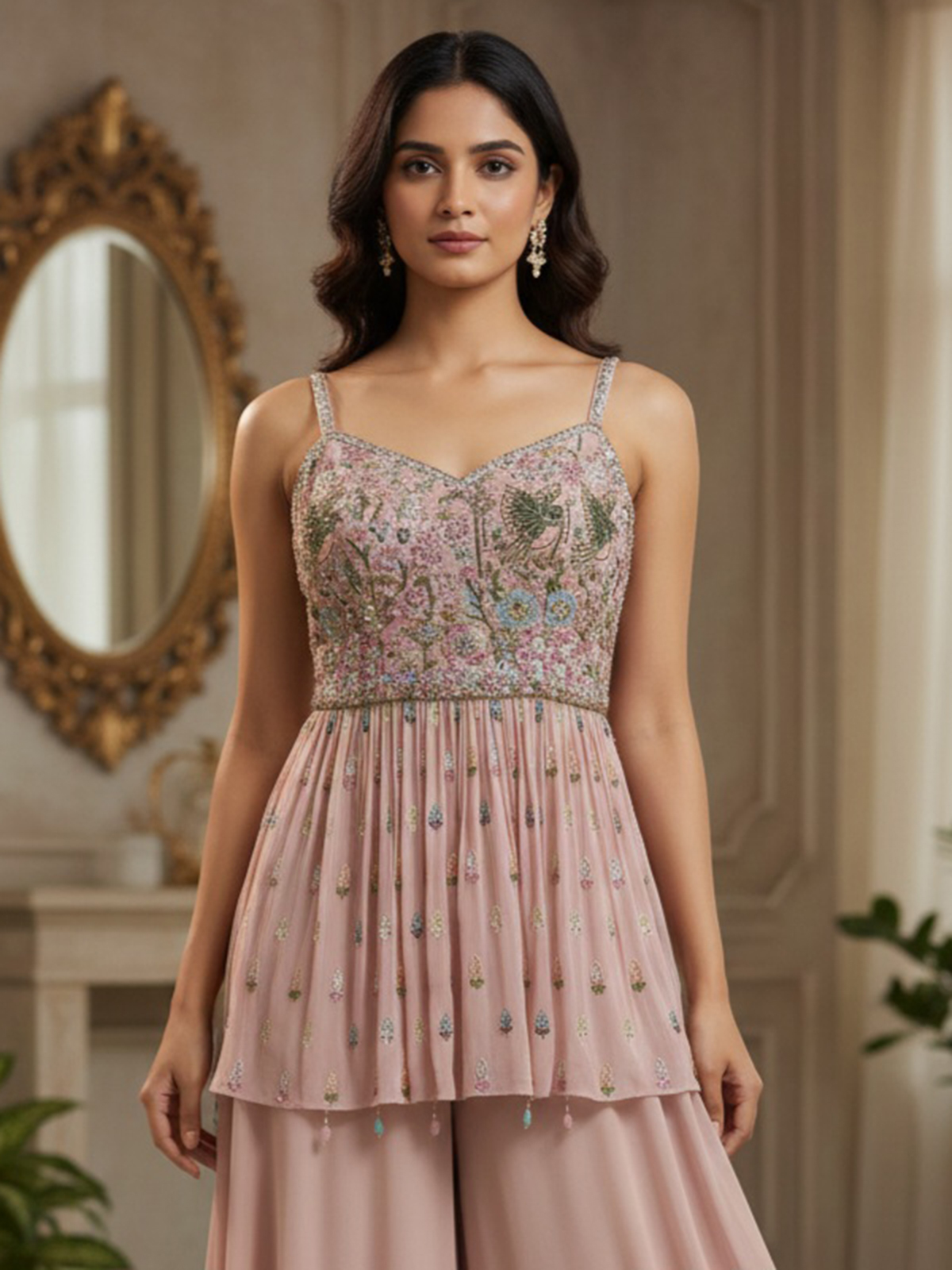 Soft and charming, this onion pink georgette palazzo suit blends delicate color with festive glamour. The sleeveless sweetheart neckline kurti is embellished with stone, beads, sequins, thread and cutdana work that adds graceful sparkle. Paired with a flowing palazzo, this ensemble is an elegant choice for weddings and receptions.