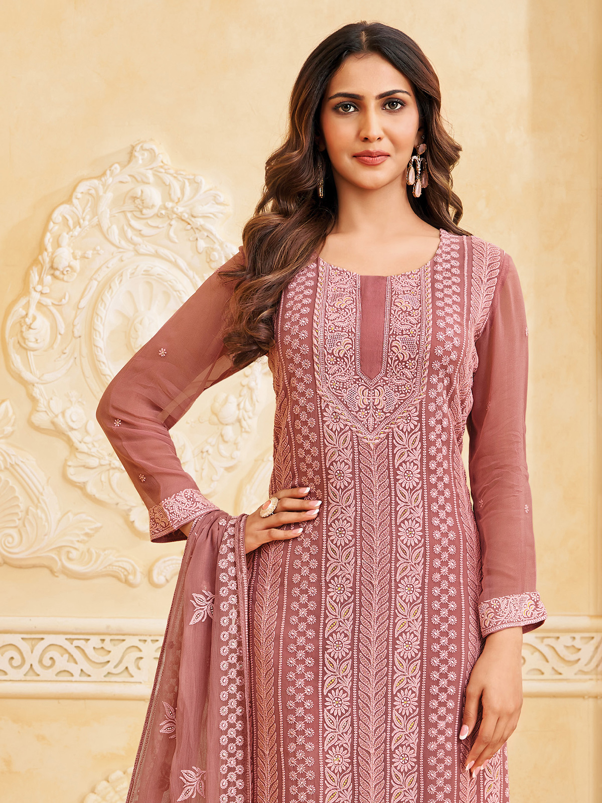 Radiating festive charm, this georgette salwar suit in soft onion pink exudes graceful allure. Intricate thread work delicately enhances the round neckline and full sleeves, while a flowing dupatta and sleek pants complete the ensemble. Perfect for festive gatherings, it blends tradition with timeless elegance.