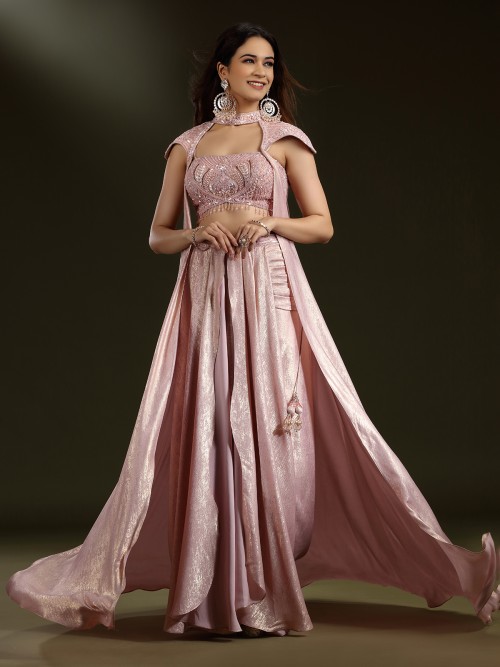 Embrace contemporary sophistication in this onion pink lycra Indo-Western suit. Adorned with dazzling cutdana, sequins, beads, diamond, and zari, it exudes modern charm with a traditional essence. The fluid drape enhances its luxurious silhouette, making it ideal for parties and receptions. A perfect balance of designer artistry and cultural elegance, this ensemble ensures you radiate refined beauty and captivating style at every occasion.