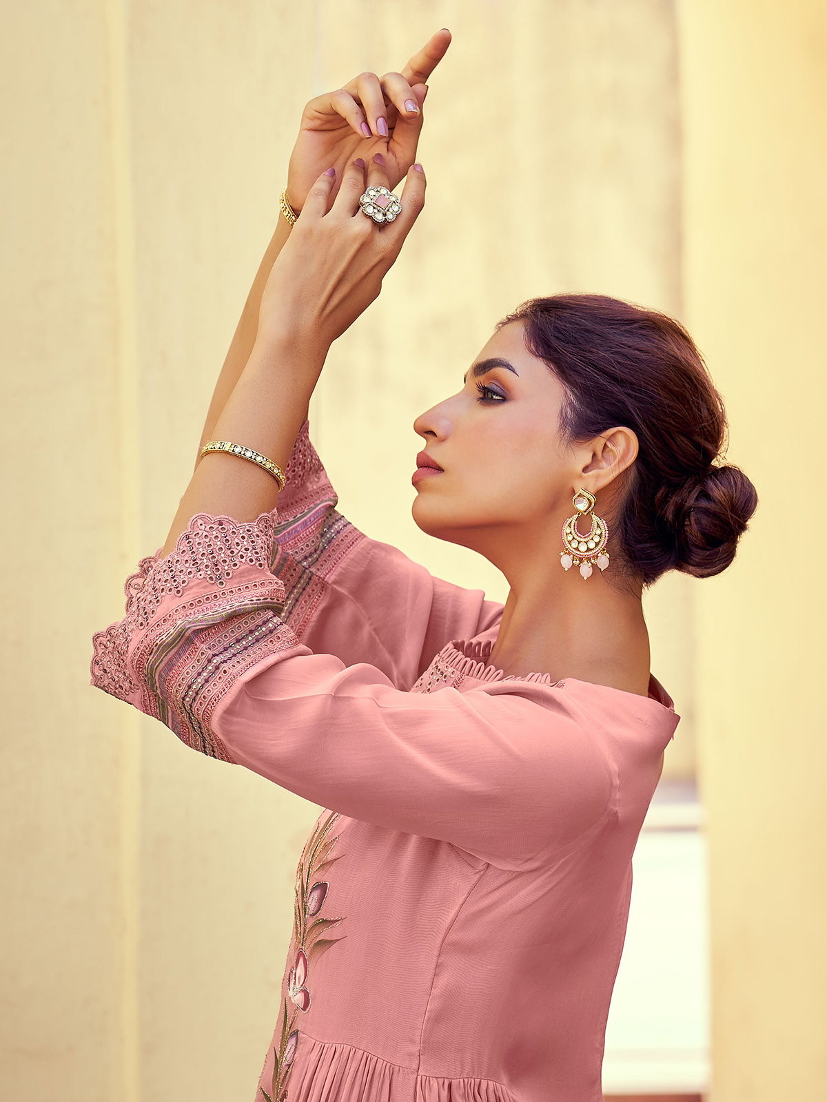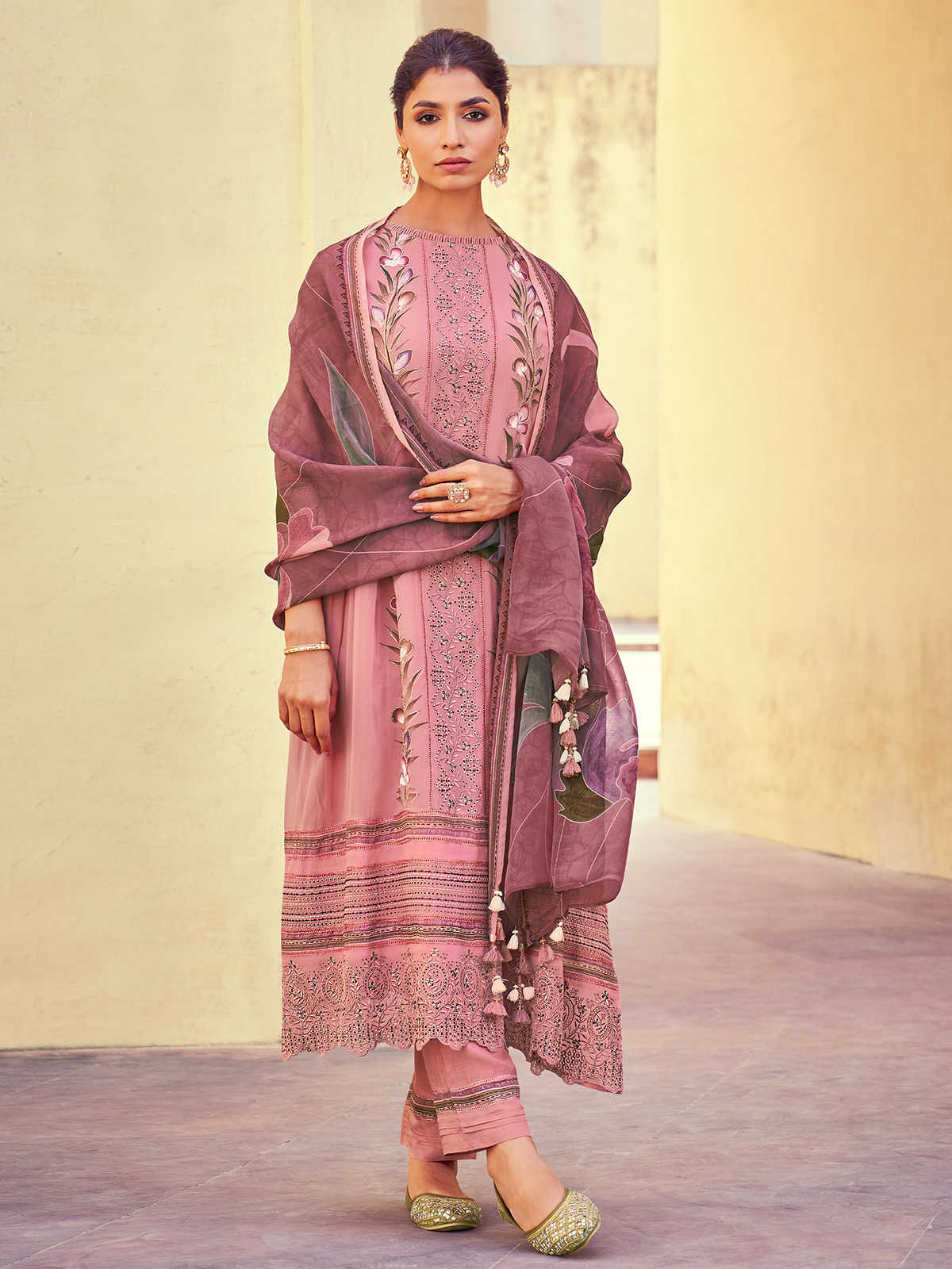 Glow in this soft onion pink salwar suit crafted from premium organza. Embellished with zari, sequins, and embroidery, the ensemble features a boat neck and three quarter sleeves. Completed with pants and a designer dupatta.
