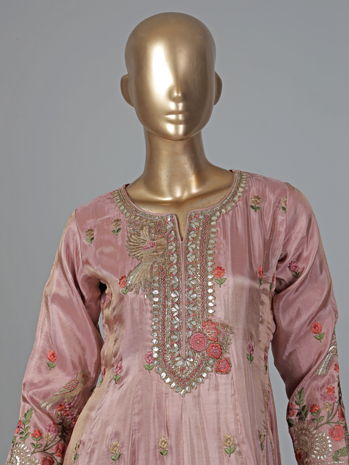 Soft onion pink silk anarkali suit. Adorned with embroidery, sequins, gota, cutdana, thread and zardosi work. The sweetheart neckline and full sleeves enhance its regal appeal, paired with pants and dupatta for celebrations.