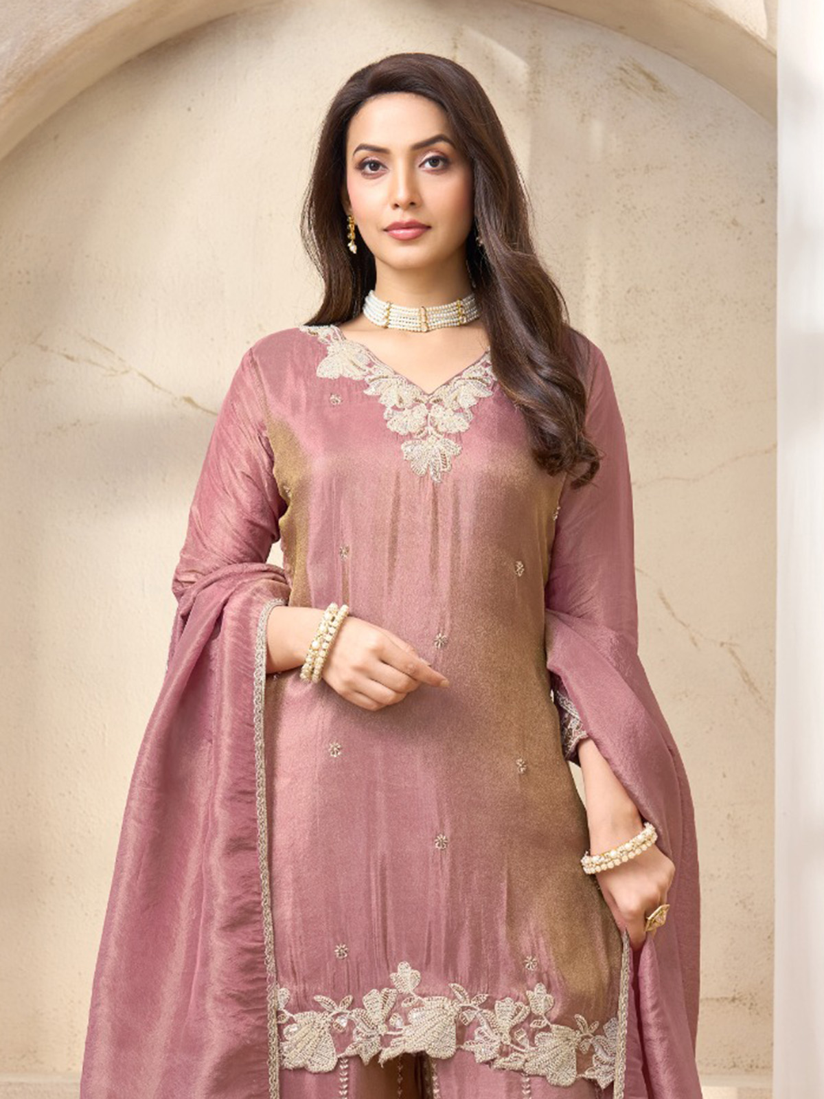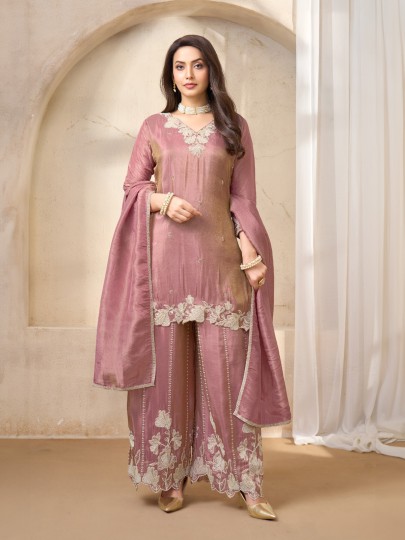 Graceful onion pink hues highlight this silk pakistani style palazzo suit designed for festive elegance. The kurti features a flattering V neckline with quarter sleeves, beautifully embellished with cutdana, sequins, beads and thread detailing. Styled with flowing palazzo pants and a delicate dupatta. The ensemble creates a refined ethnic silhouette perfect for celebrations.