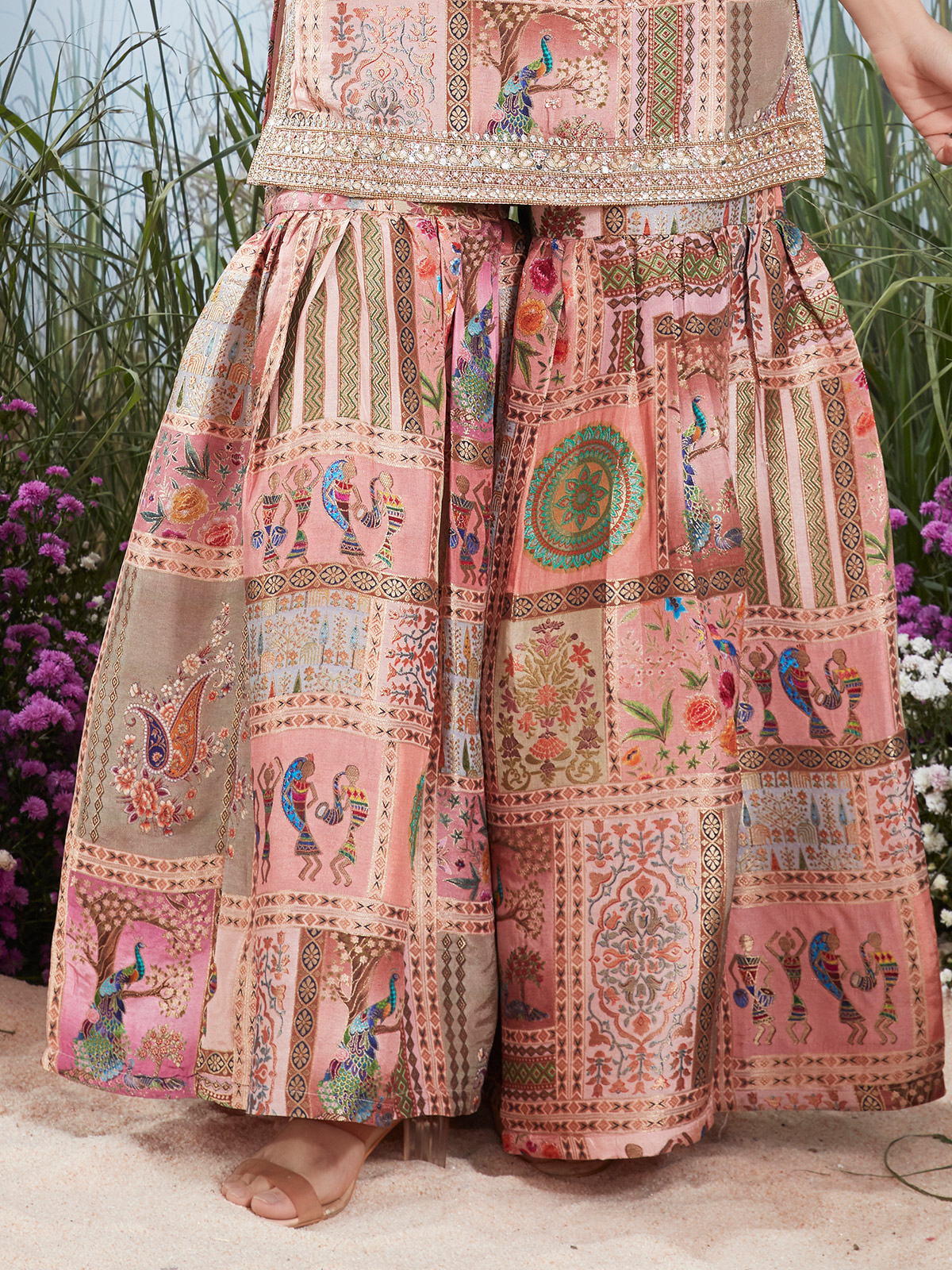 This printed silk outfit features resham embroidery enriched with sequins, beads, and cutdana artistry. Designed with a flattering V neckline and sleeveless cut, it pairs elegantly with a flared sharara. Ideal for wedding ceremonies and festive gatherings, it radiates feminine glamour.