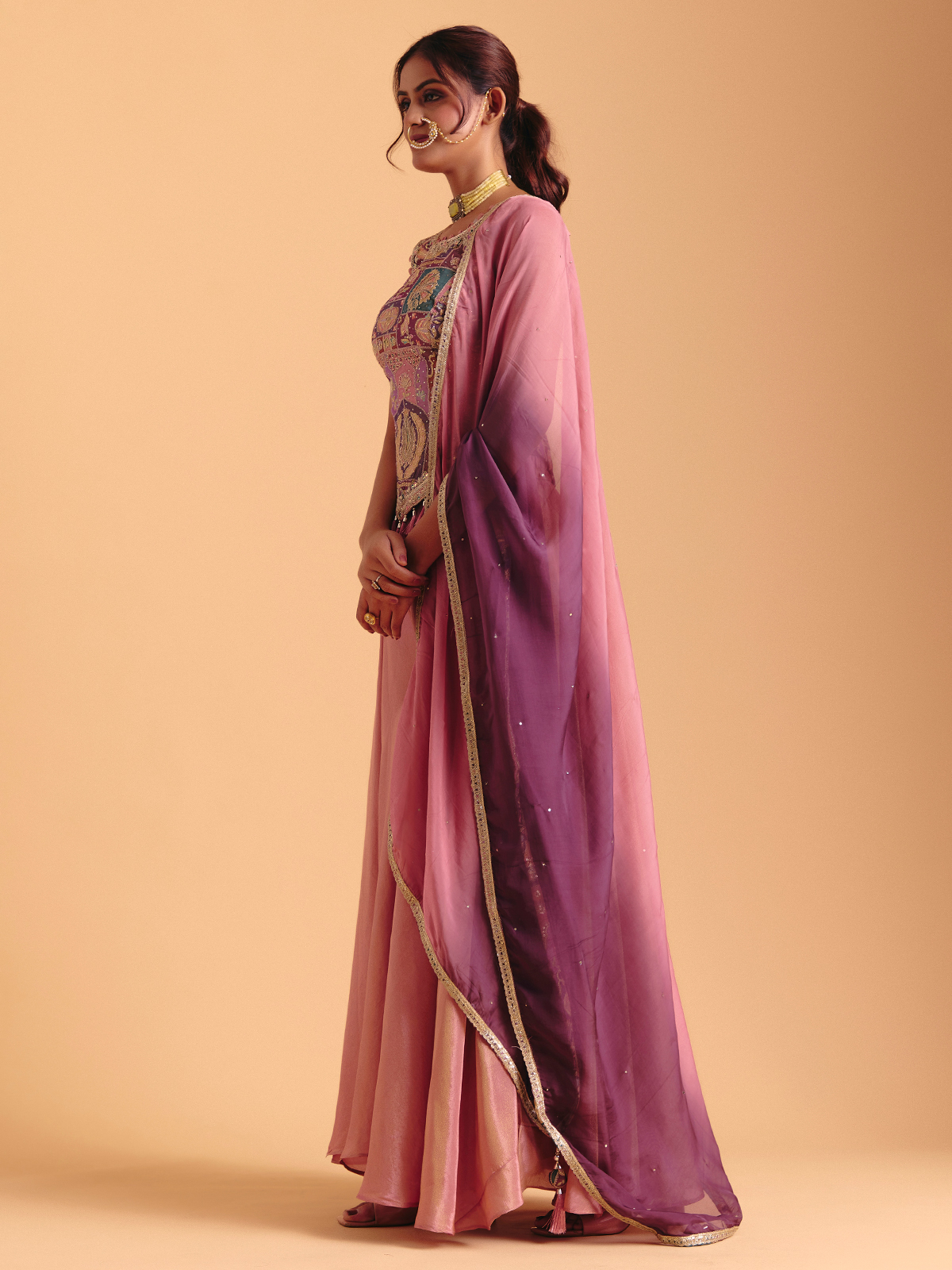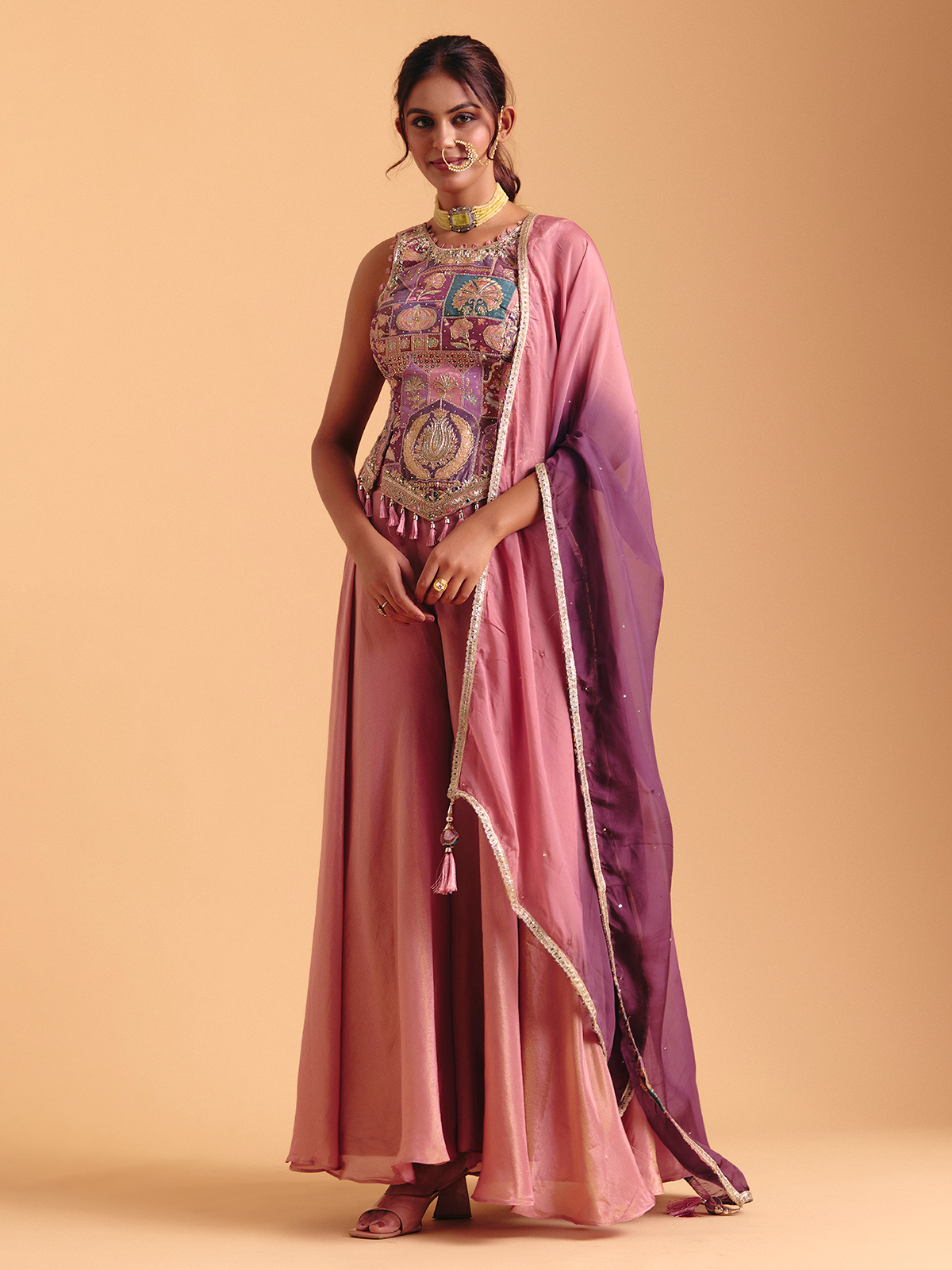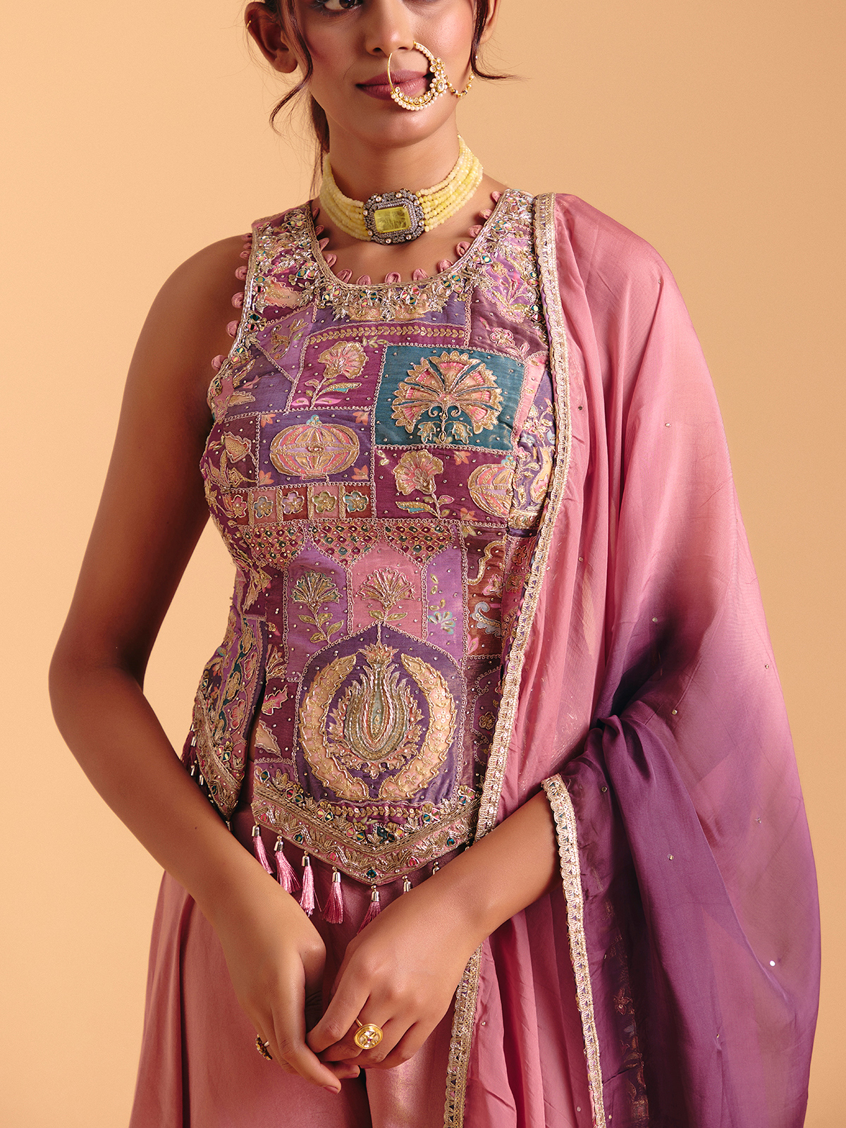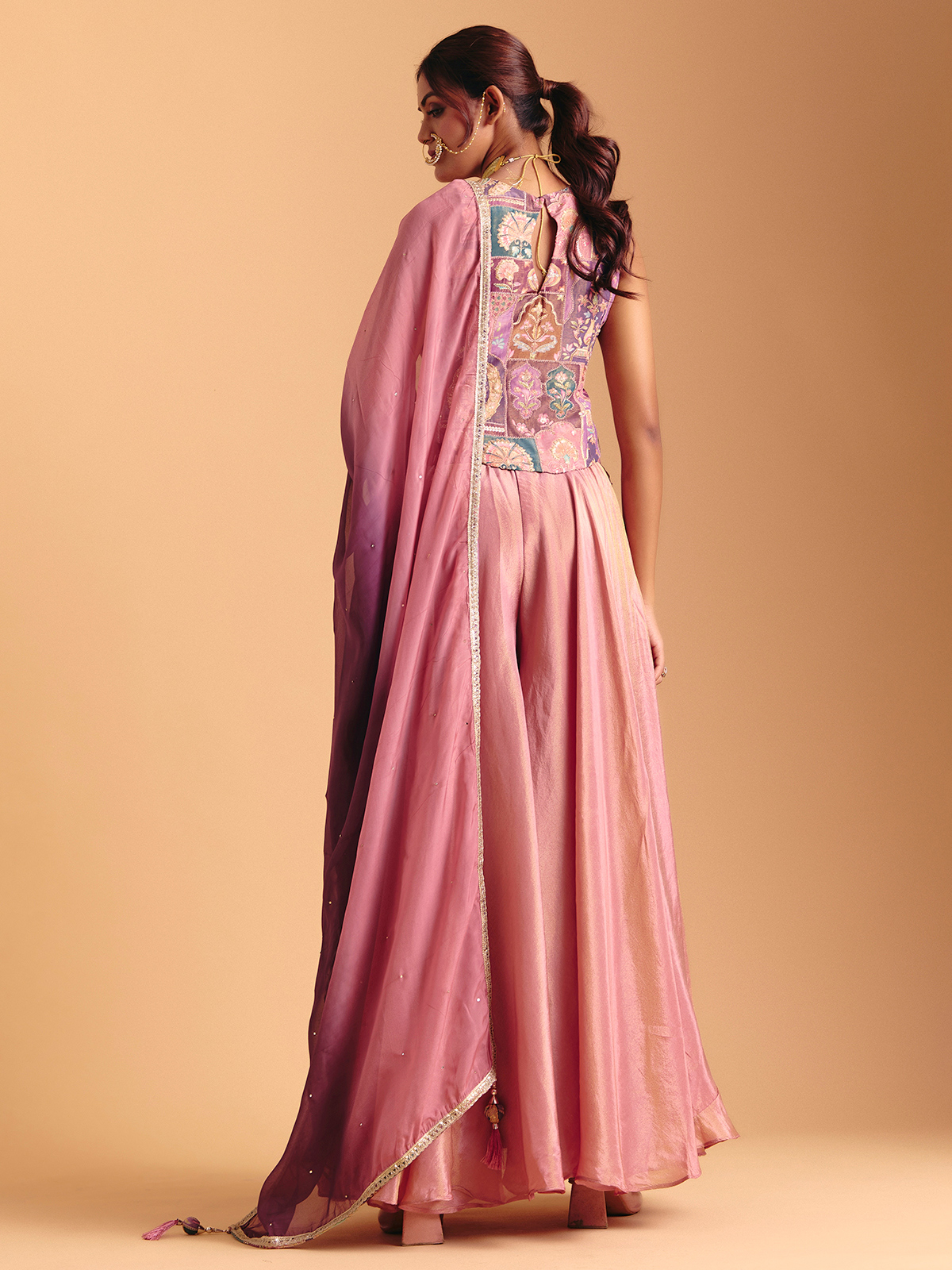 Satin silk in a refined onion pink shade lends a polished, radiant glow to this festive palazzo suit. Resham, sequins, stone, mirror, zardosi and cutdana embellish the round neckline and sleeveless finish with intricate brilliance. A fluid palazzo enhances comfort, while the coordinating dupatta completes its charming elegance.