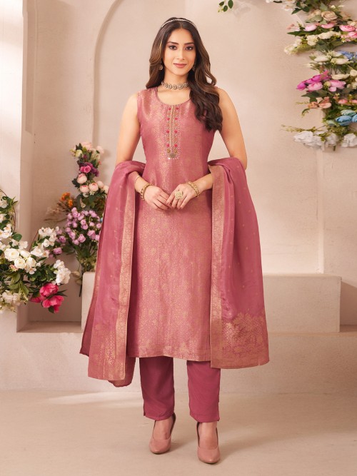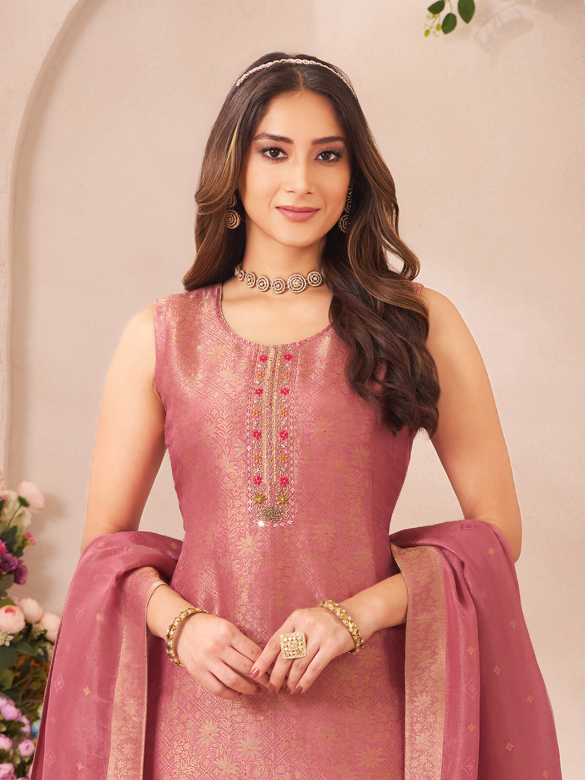 With delicate hues and intricate embellishments, this onion pink silk suit is adorned with mirror, sequins, cutdana, and zardosi work. The sleeveless cut and round neck offer elegance, while the pants and dupatta provide a balanced ethnic finish—perfect for sangeet or daytime events.