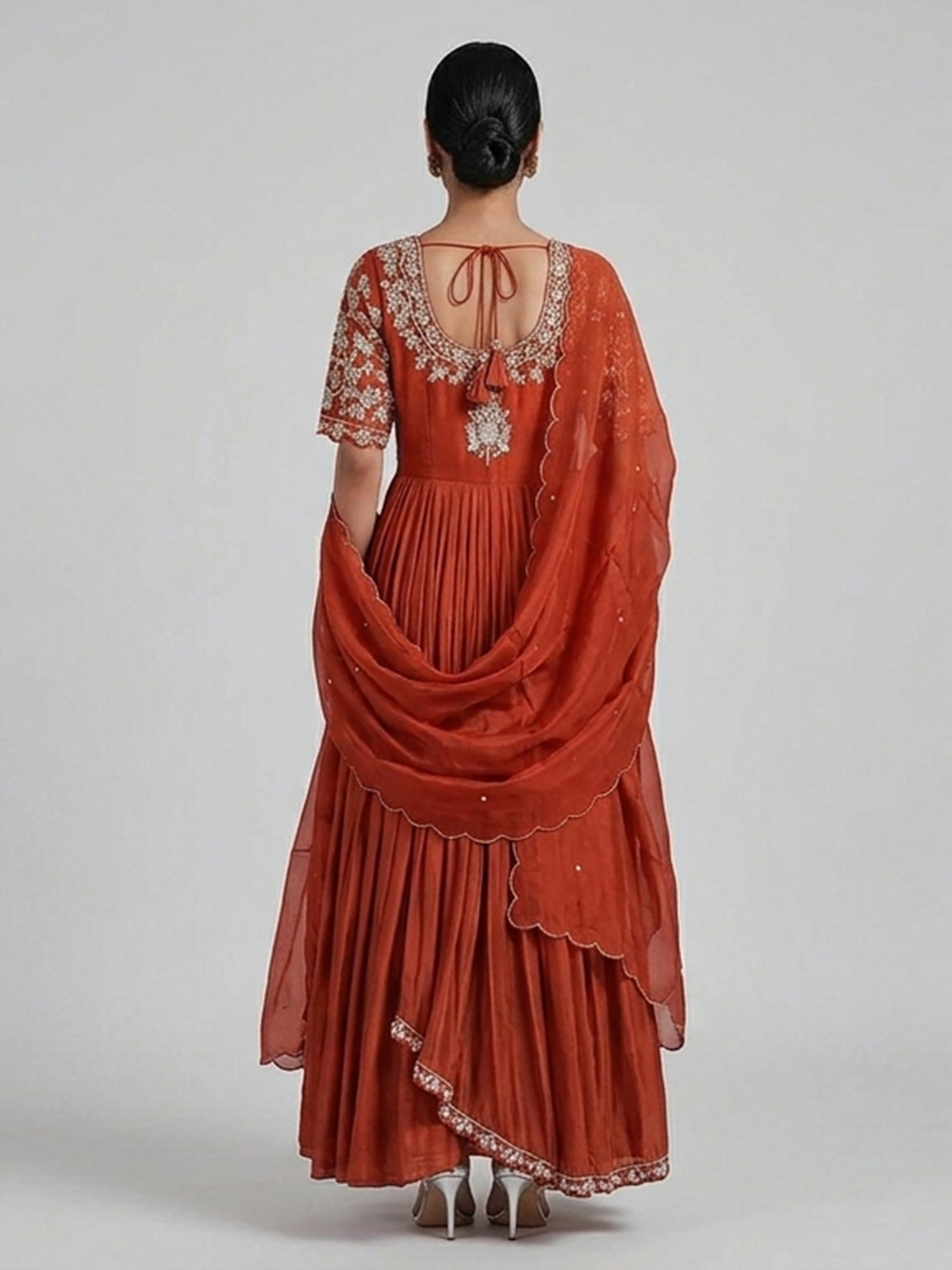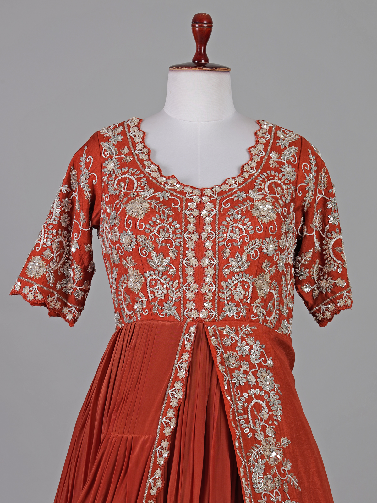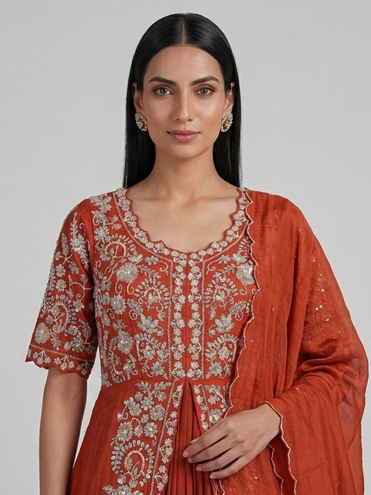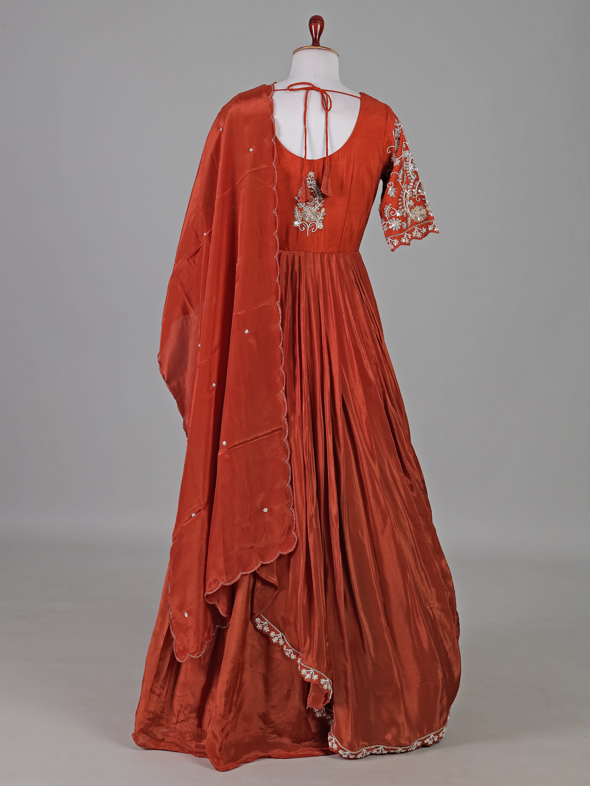 Vibrant orange bring festive warmth to this crepe silk anarkali suit designed for joyful occasions. Enhanced with cutdana, sequins and bead detailing. It sparkles with graceful brilliance. The round neckline and half sleeves add a classic touch. Paired with a dupatta, this designer ensemble is ideal for weddings, sangeet and celebrations, blending radiant charm with elegant ethnic sophistication.