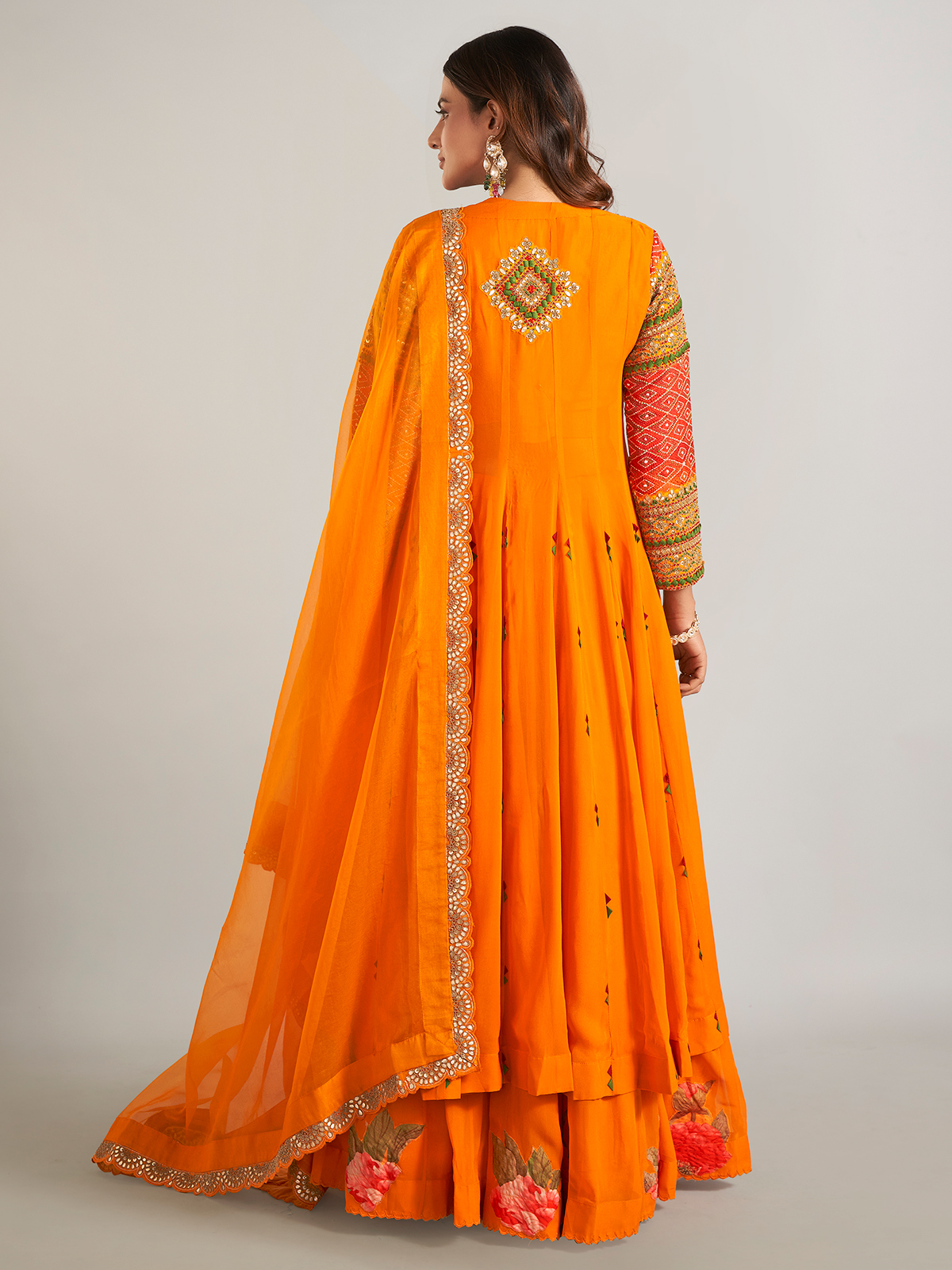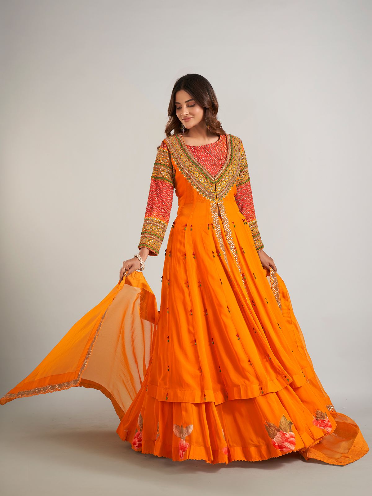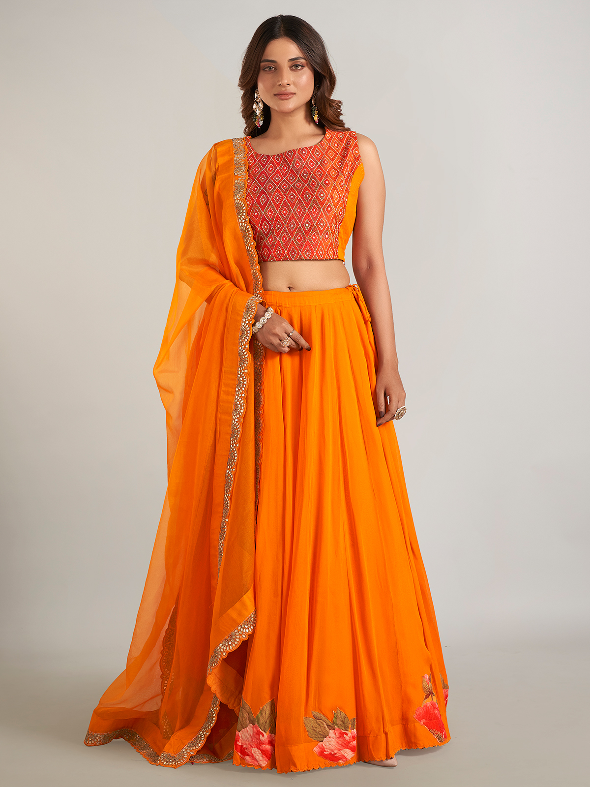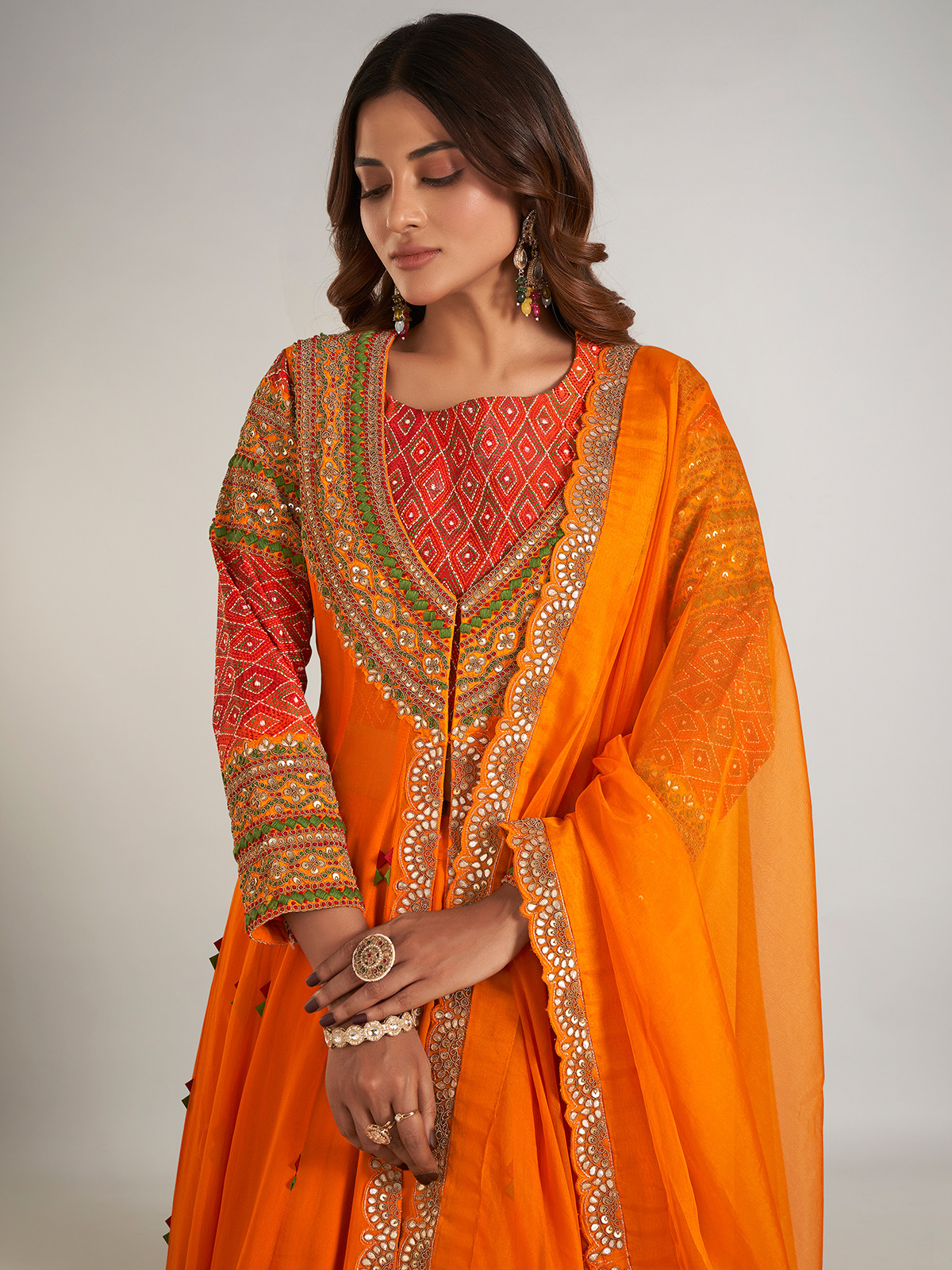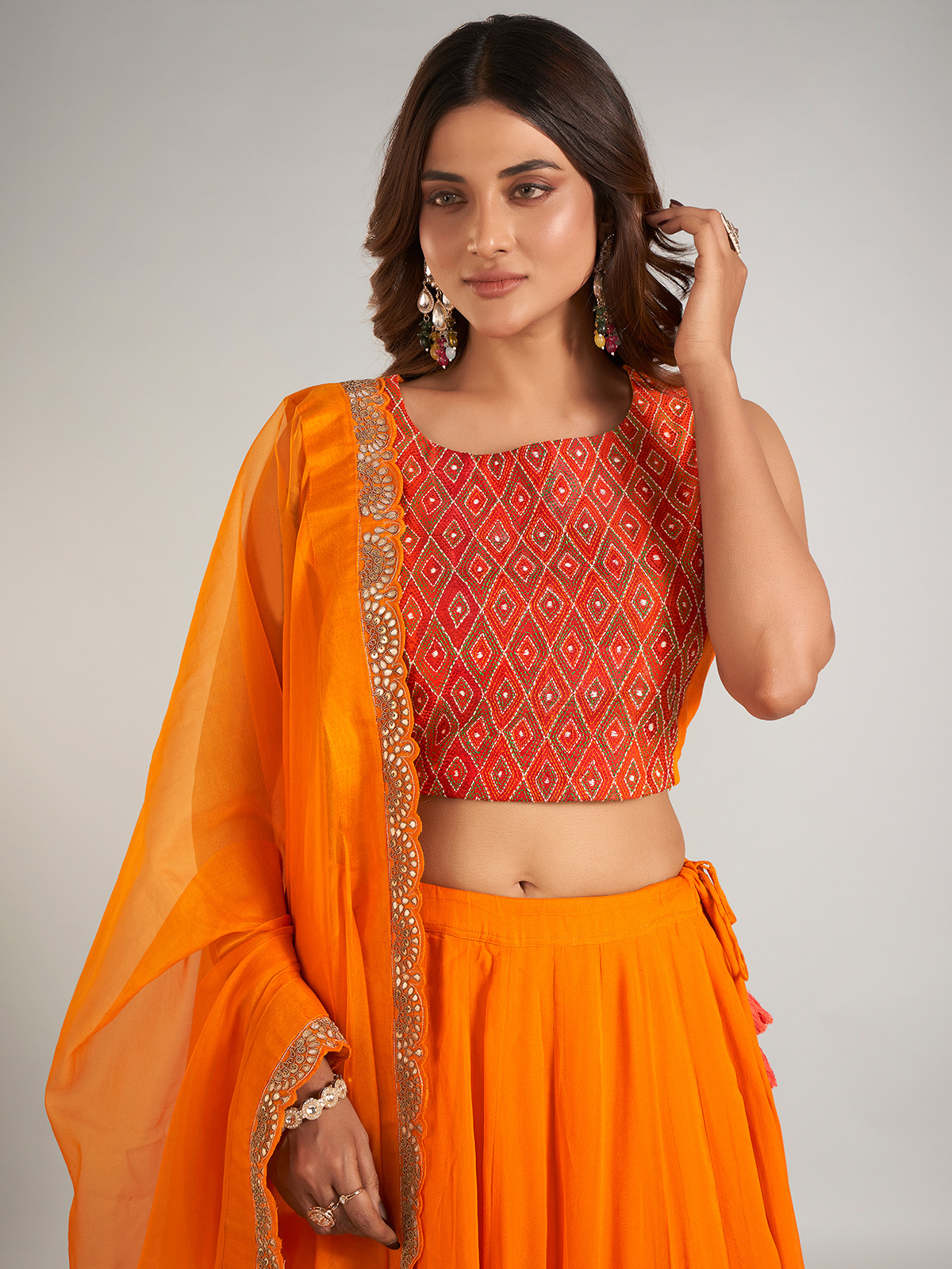 Stand out at any wedding celebration with this striking orange georgette jacket-style lehenga suit. Enhanced with zardosi, thread, gota, and sequins work, it is paired with a dupatta to complete the look.