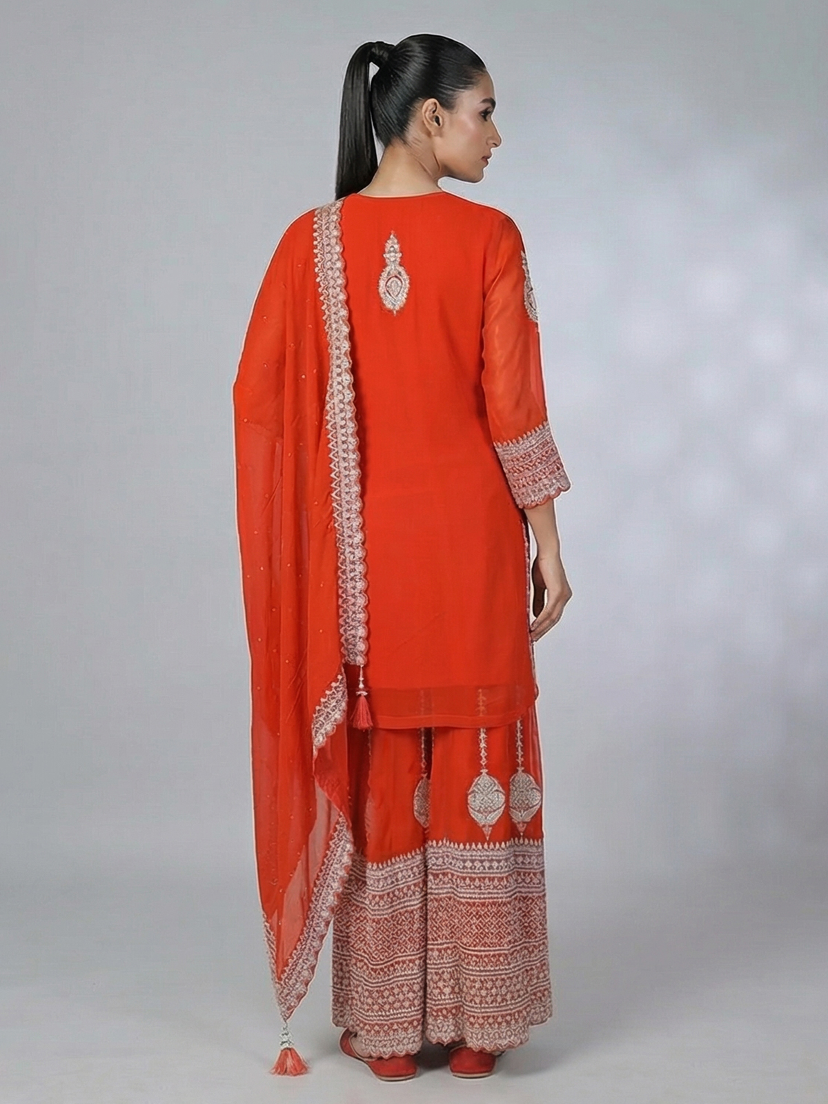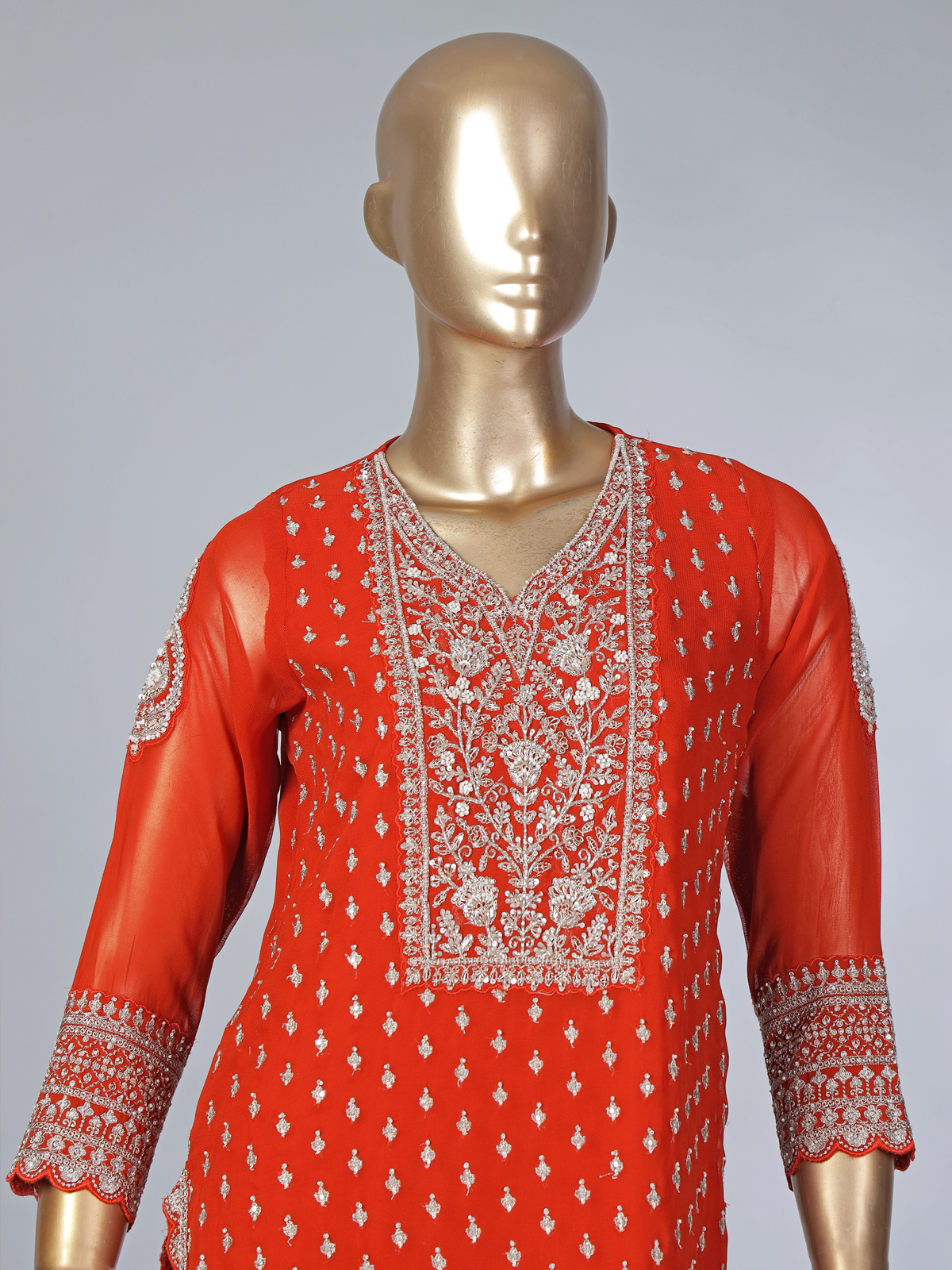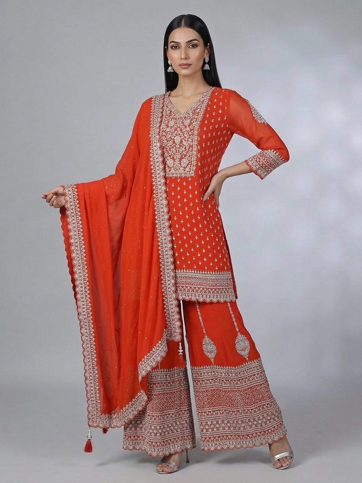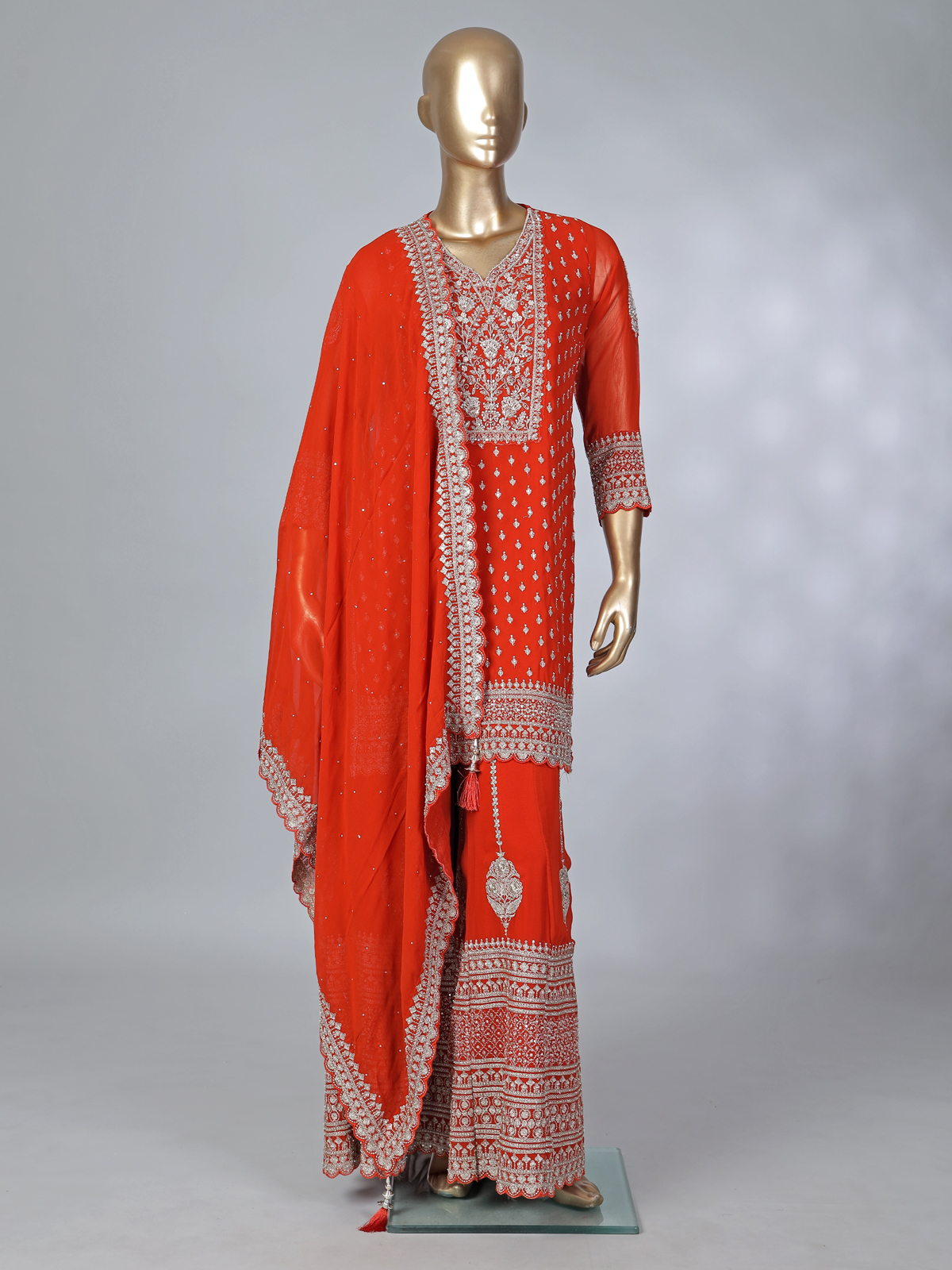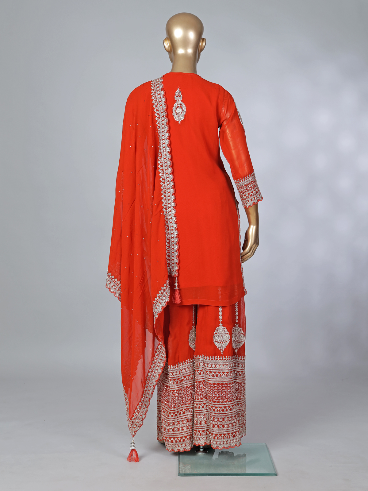 Orange Georgette Pakistani Style Palazzo Suit With Embellishments