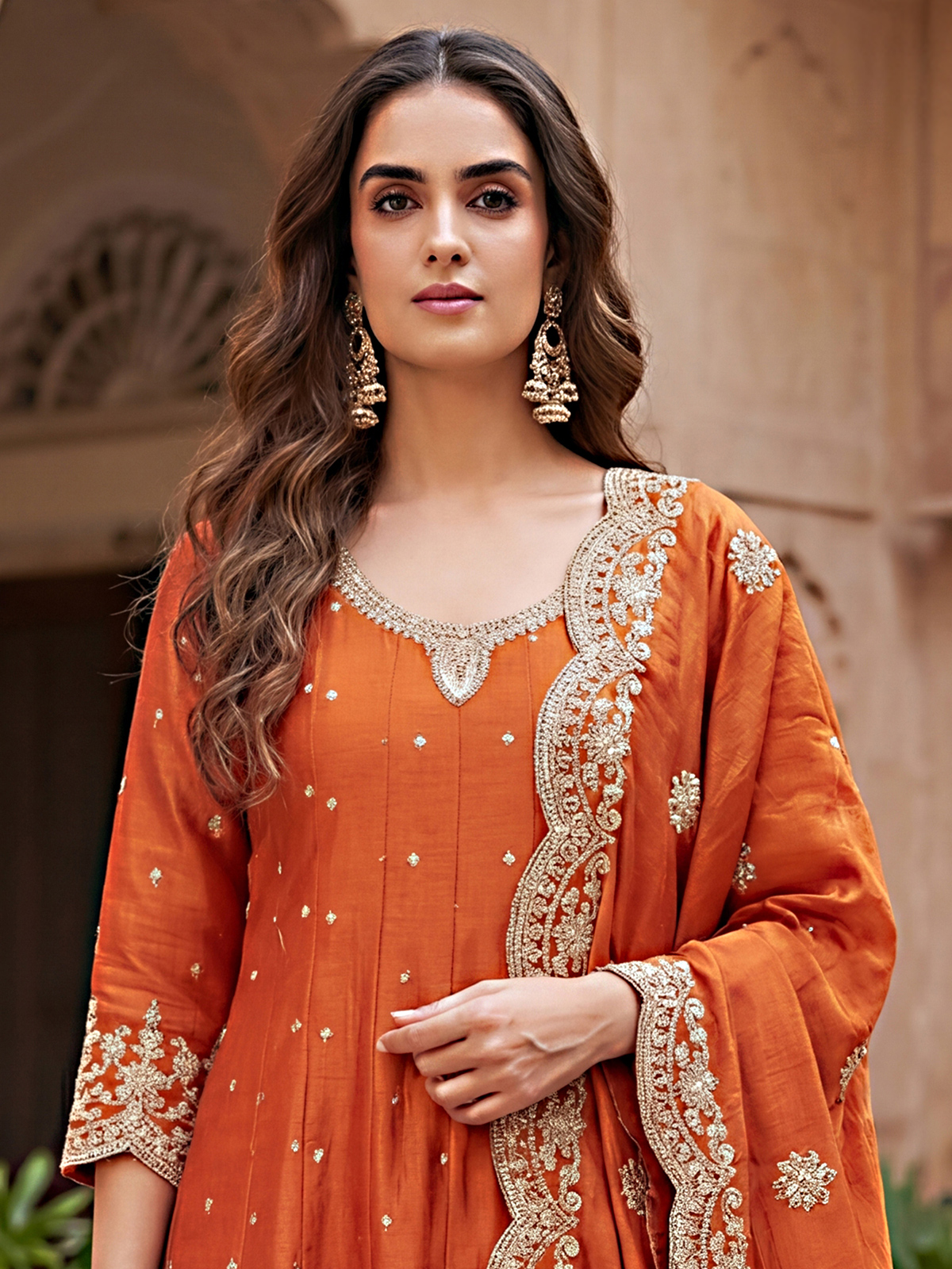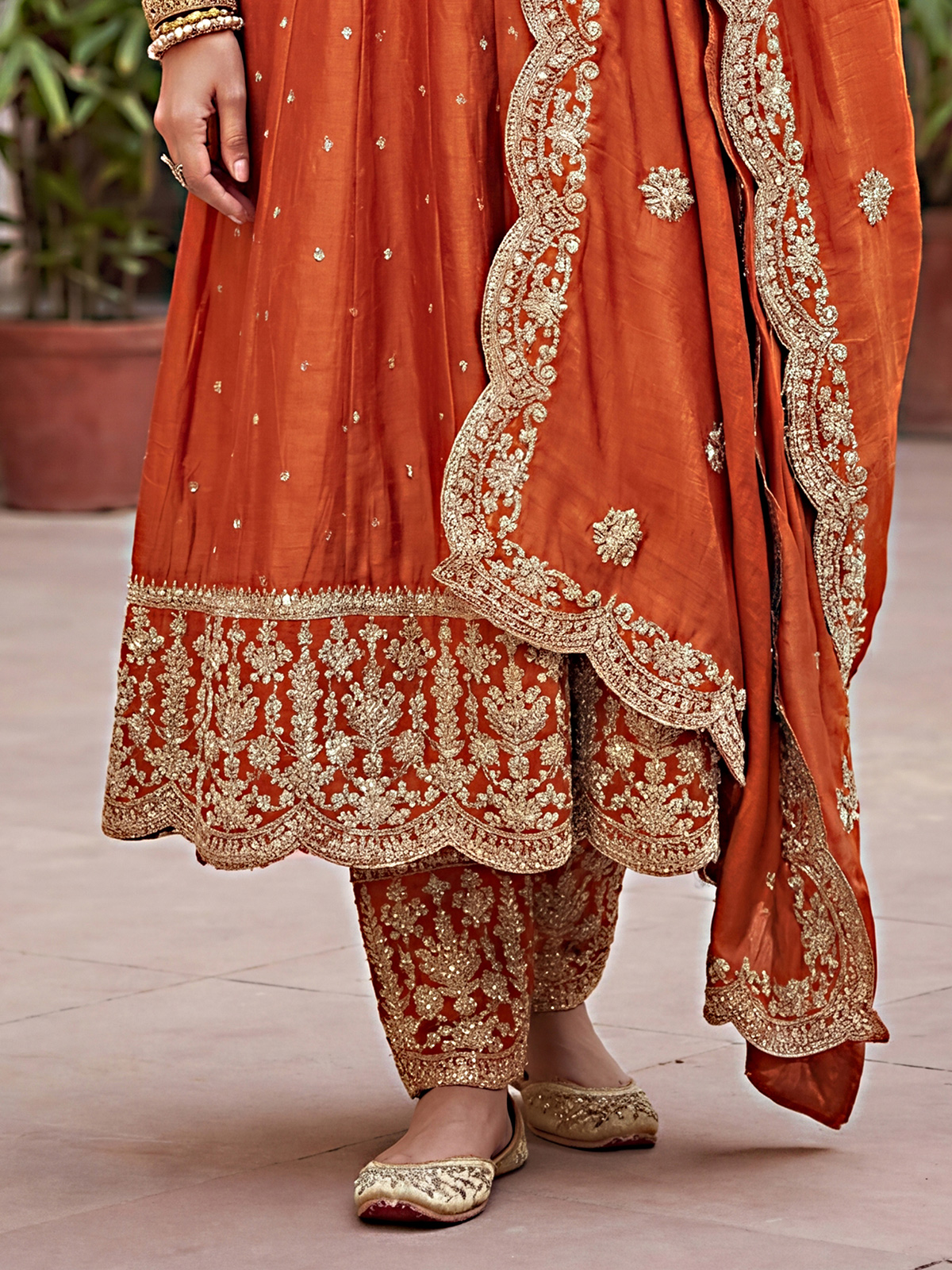 Crafted in vibrant orange silk, this Pakistani style Anarkali suit is adorned with cutdana, resham and sequin detailing. Designed with a round neckline and quarter sleeves, it is paired with a pant and dupatta for elegant festive occasions.