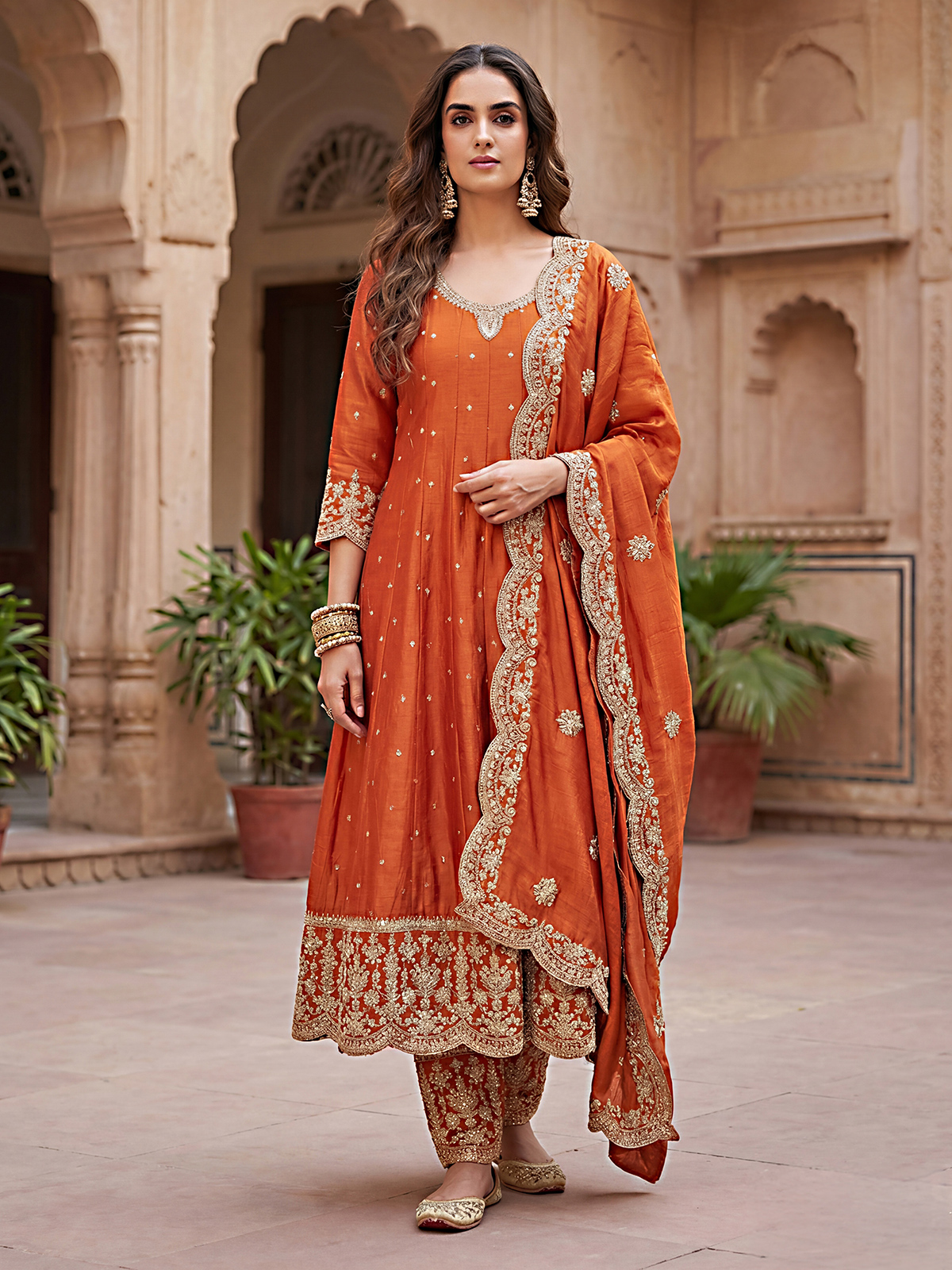Orange Pakistani Anarkali Style Silk Salwar Suit