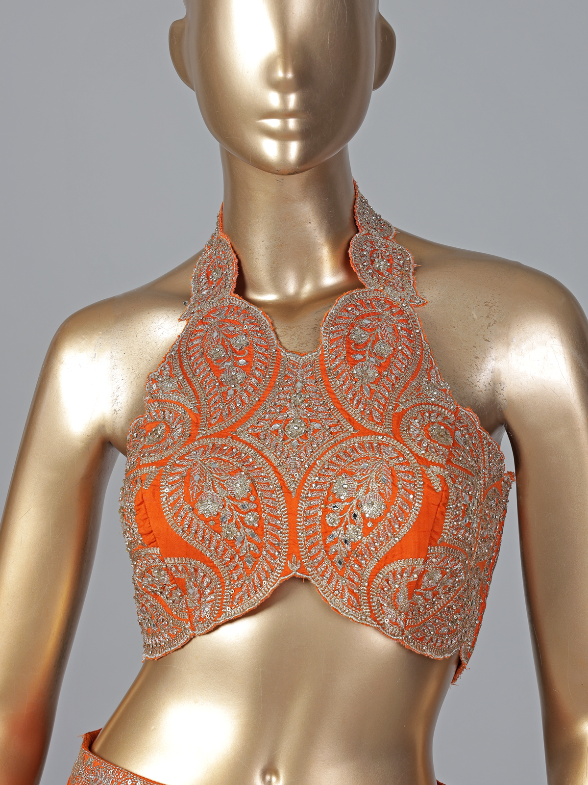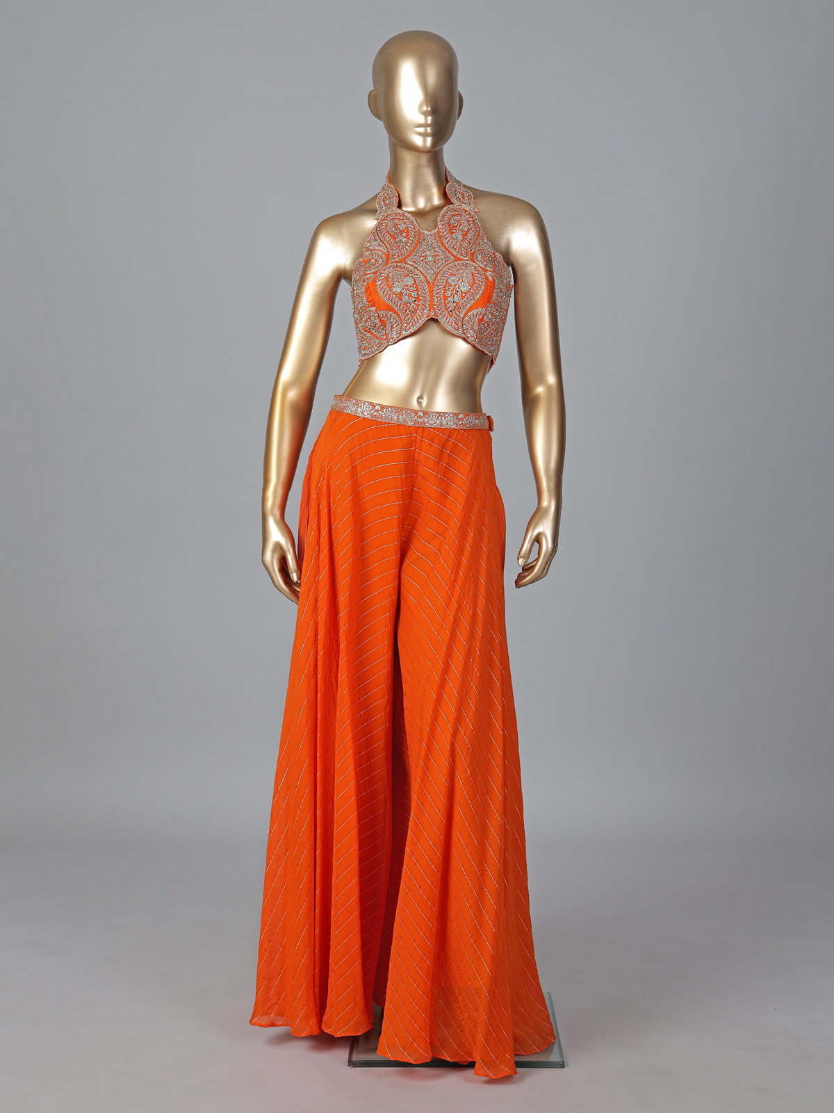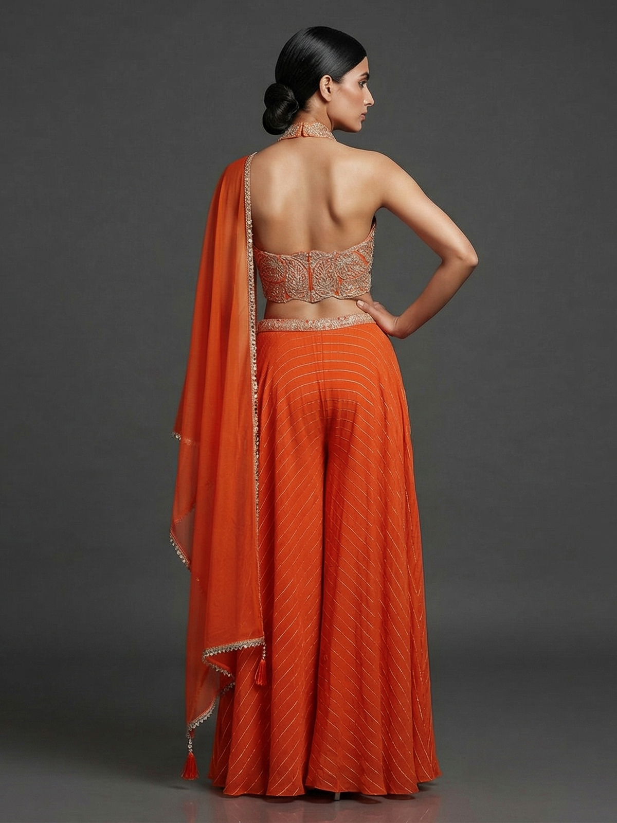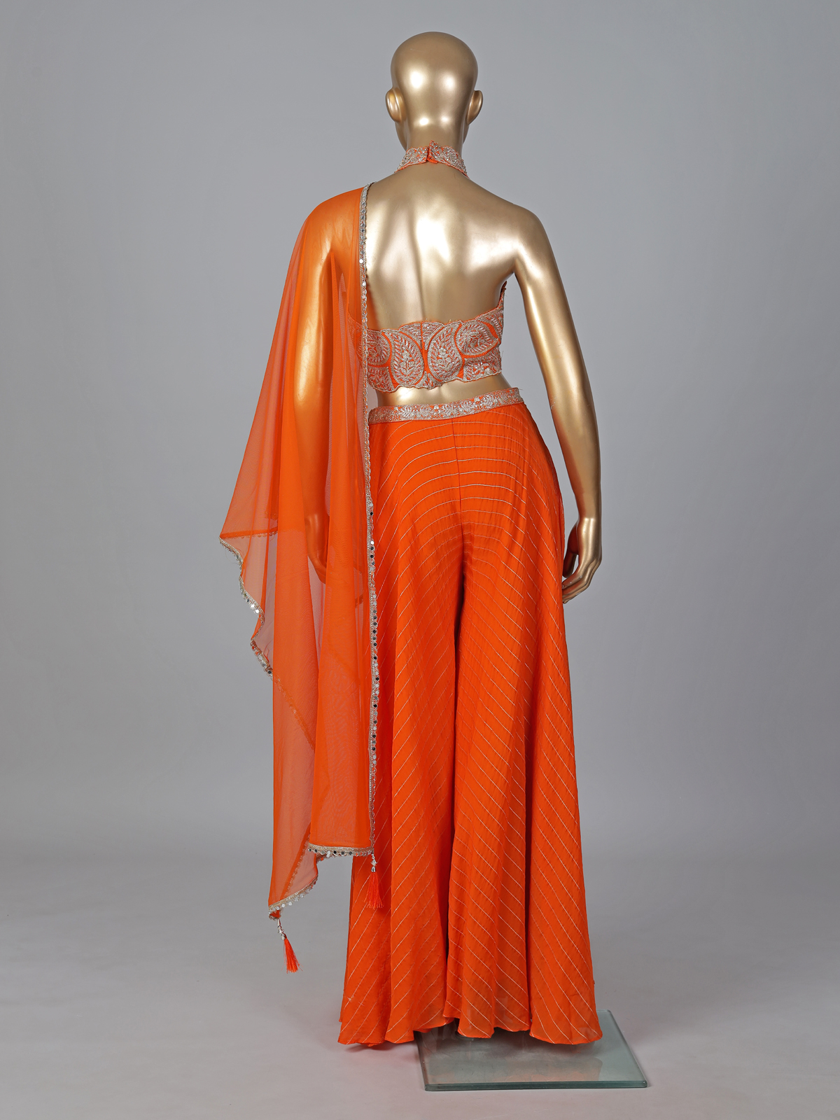 Trendy and eye-catching, this orange printed georgette Indo-western palazzo suit is adorned with mirror, zari and sequins work. Designed with a halter neckline and sleeveless cut, it is paired with a dupatta for a chic festive look.