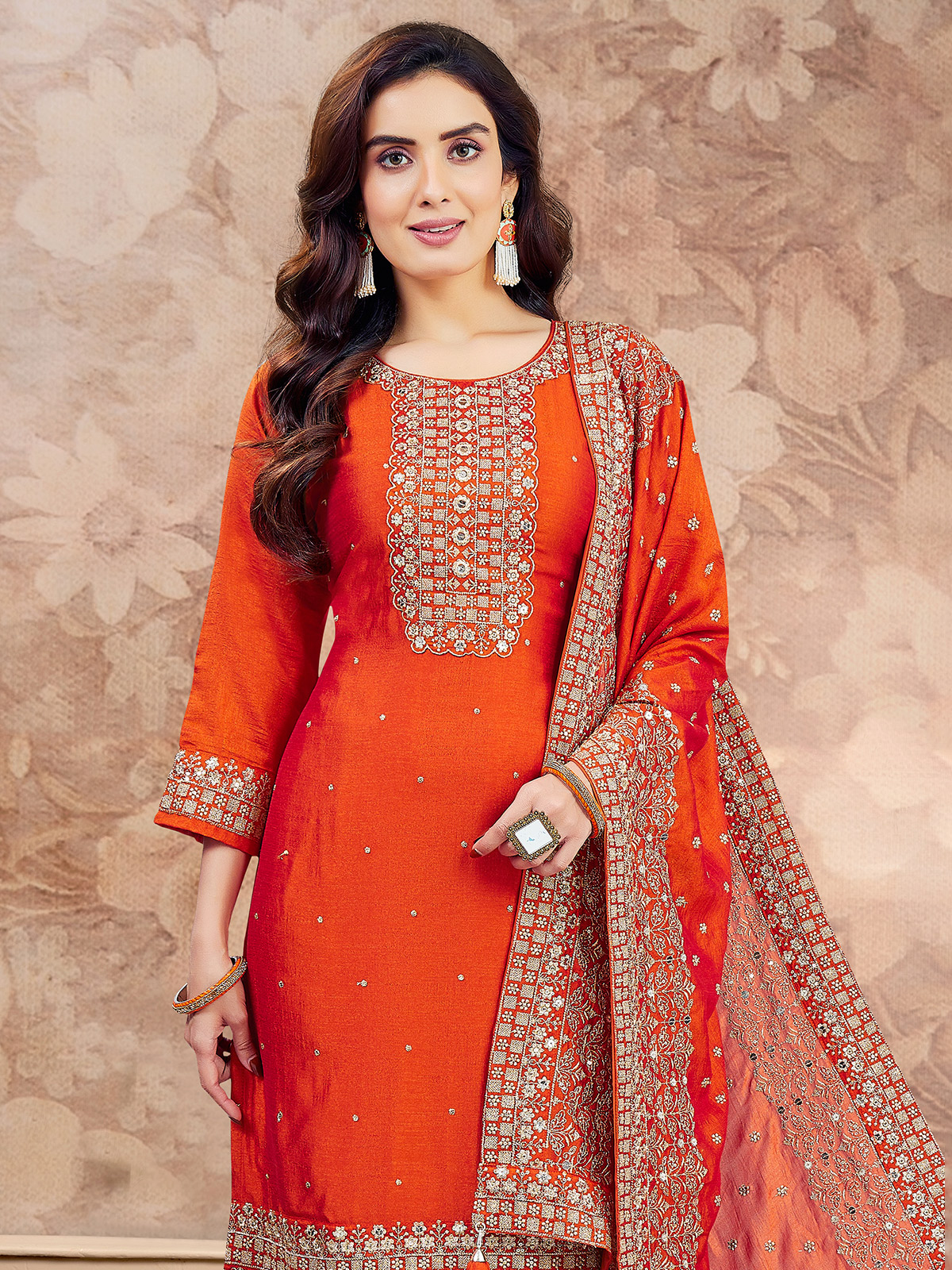 For a classic look, opt for this orange silk salwar suit with exquisite resham and sequins detailing. The round neck and quarter sleeves pair perfectly with pants and a dupatta.