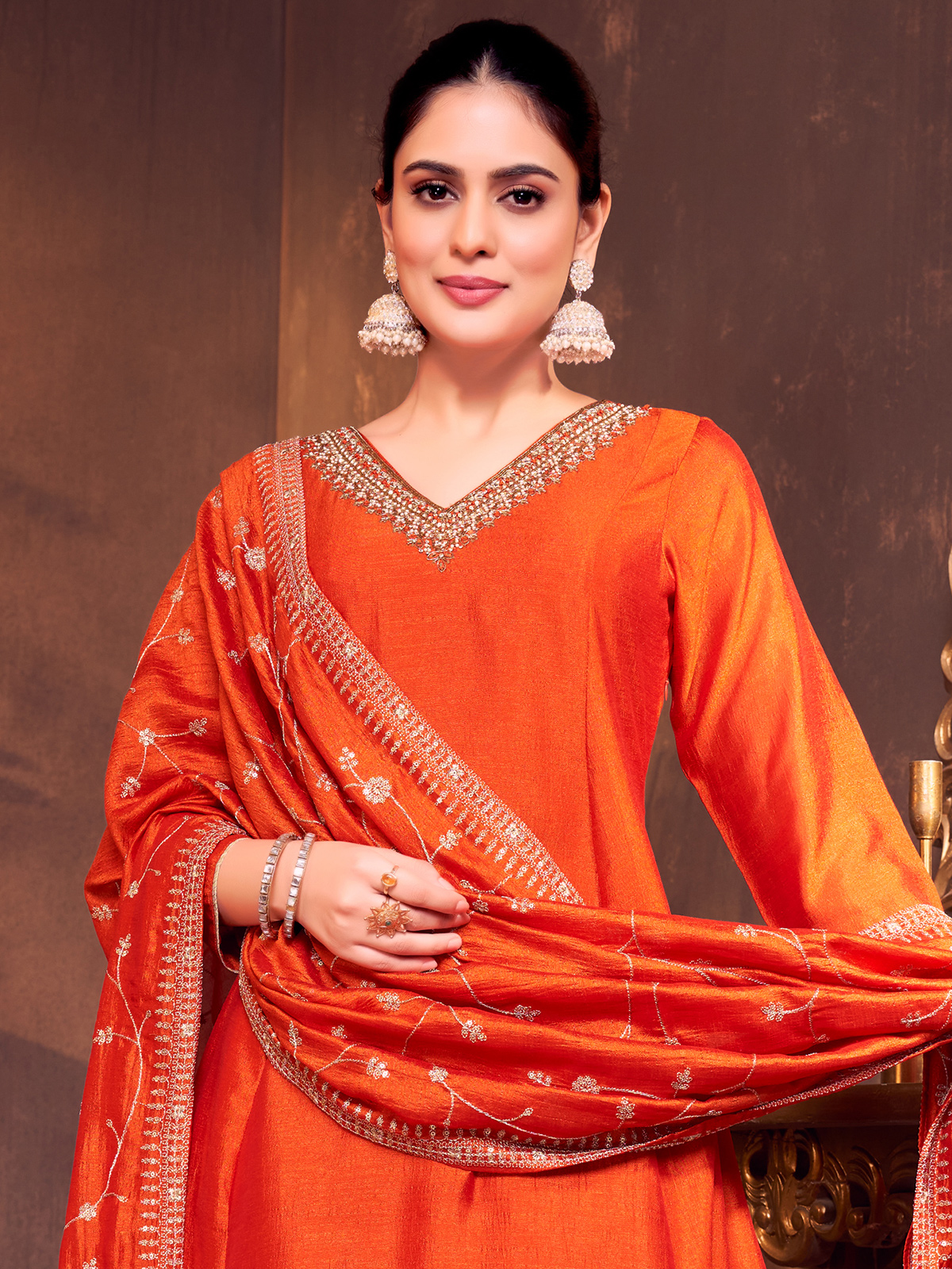 Grace your celebrations in this radiant orange silk salwar suit, highlighted with aabla, beads, resham, and sequins. Designed with a V-neckline and quarter sleeves, it comes with a dupatta and pant. Perfect for weddings and festive occasions, this ensemble blends shimmering accents with timeless elegance for a graceful ethnic charm.