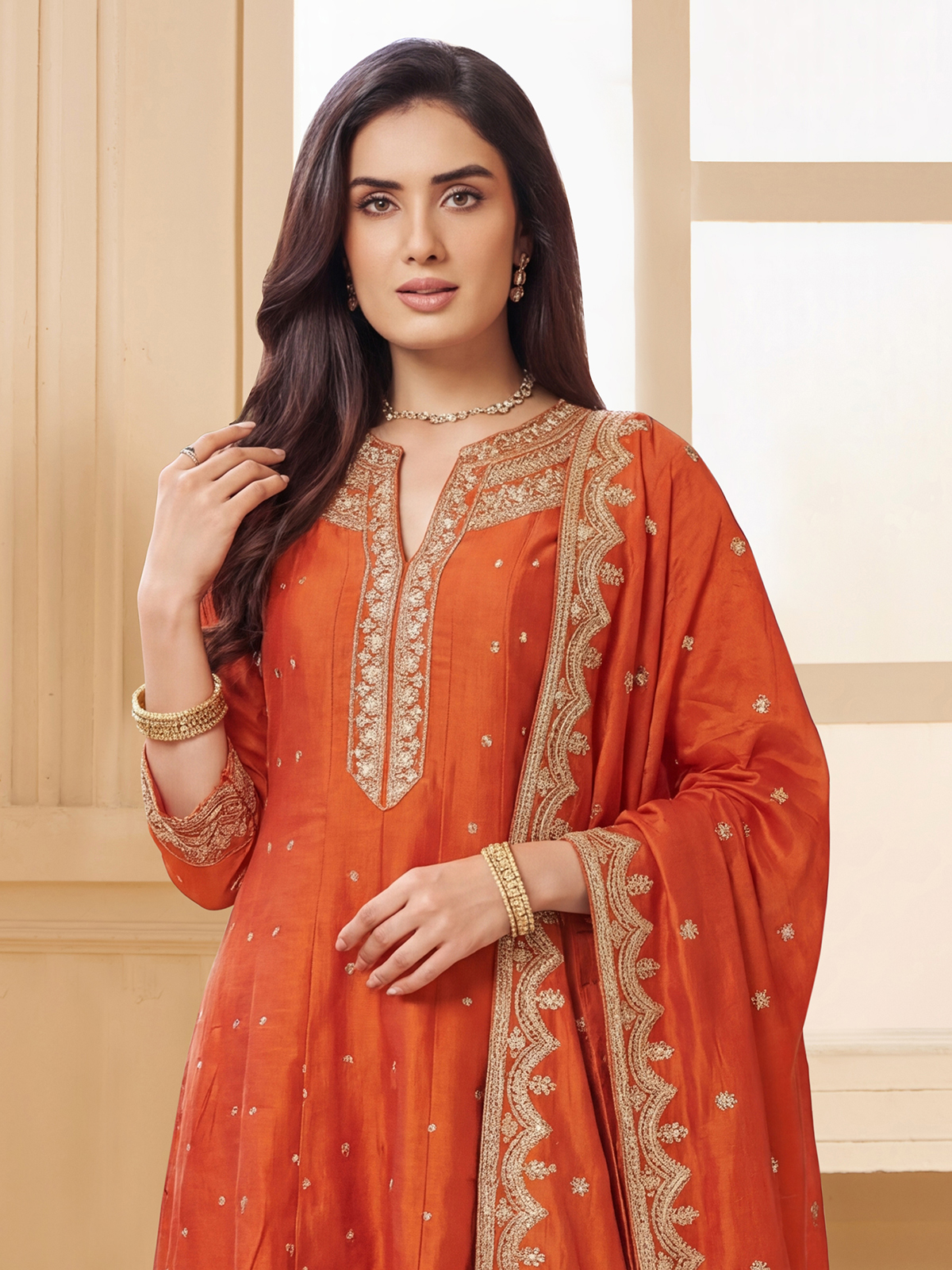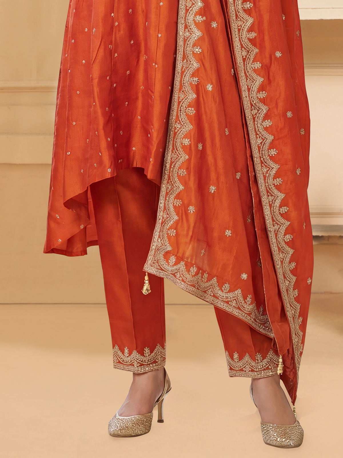 Crafted in rich orange silk designer suit. Features elegant embroidery and sequin detailing for festive charm. Styled with a stand collar and quarter sleeves. It offers a refined silhouette. Paired with comfortable pants and a coordinated dupatta, it is perfect for weddings, sangeet and festive celebrations.