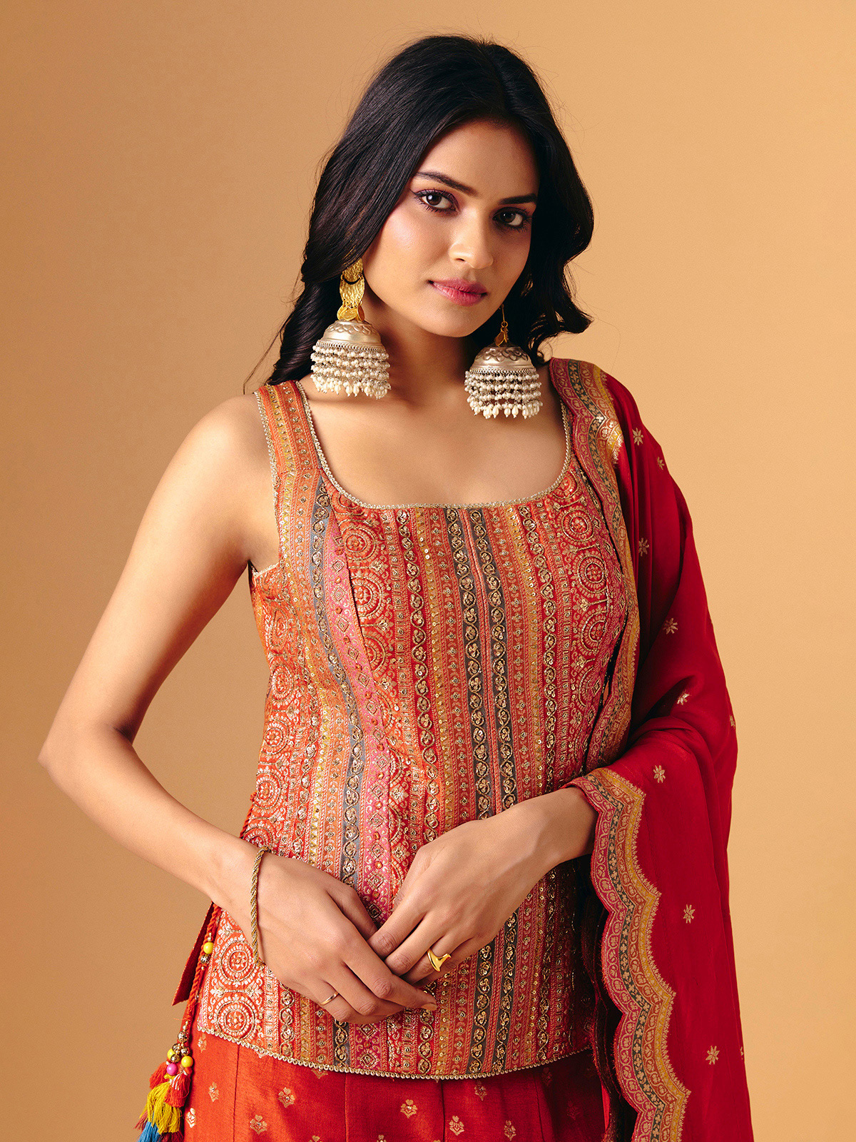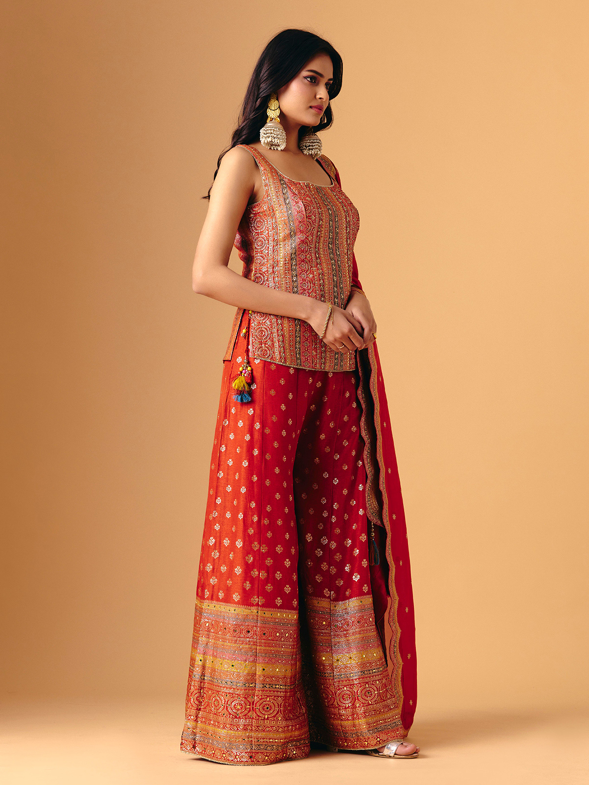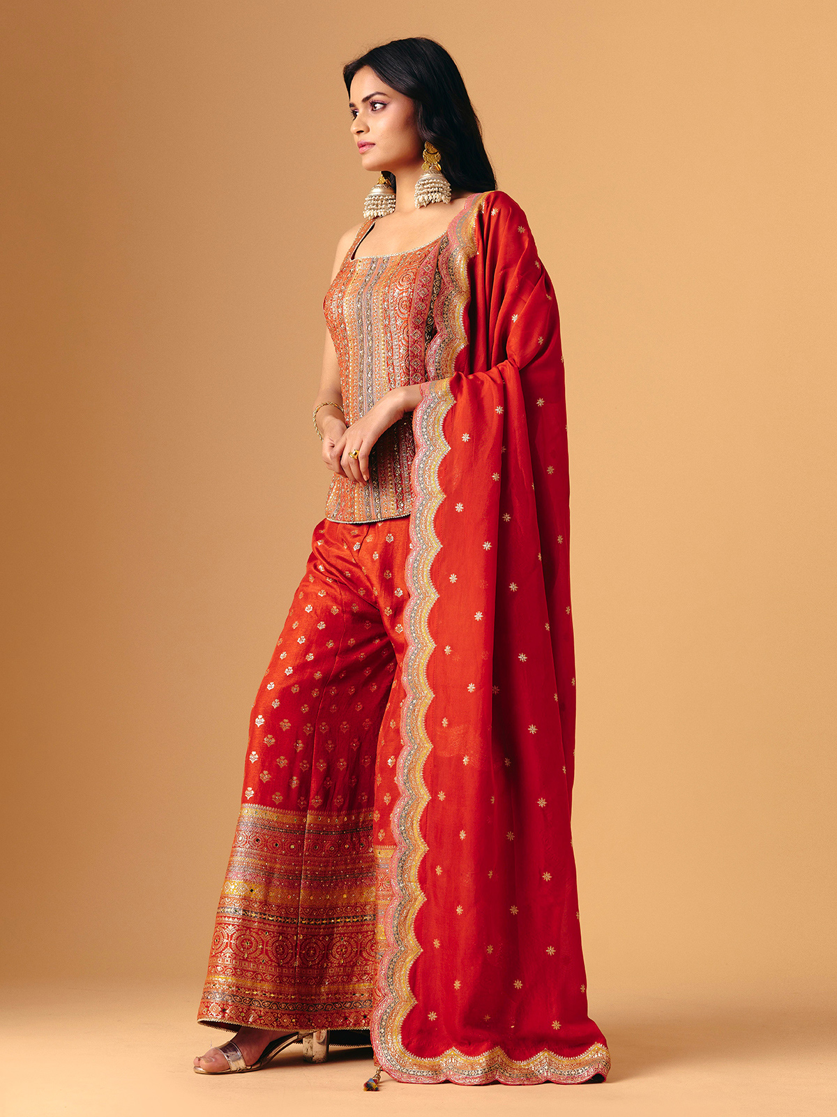 Vibrant orange silk highlights this sleeveless palazzo suit with mirror, zari, sequins, and cutdana embellishments. Square neckline adds contemporary charm, while flared palazzo bottoms move fluidly. Paired with a coordinating dupatta, it exudes festive grandeur, artisanal shimmer, and bold elegance, ideal for wedding, reception, and sangeet occasions.
