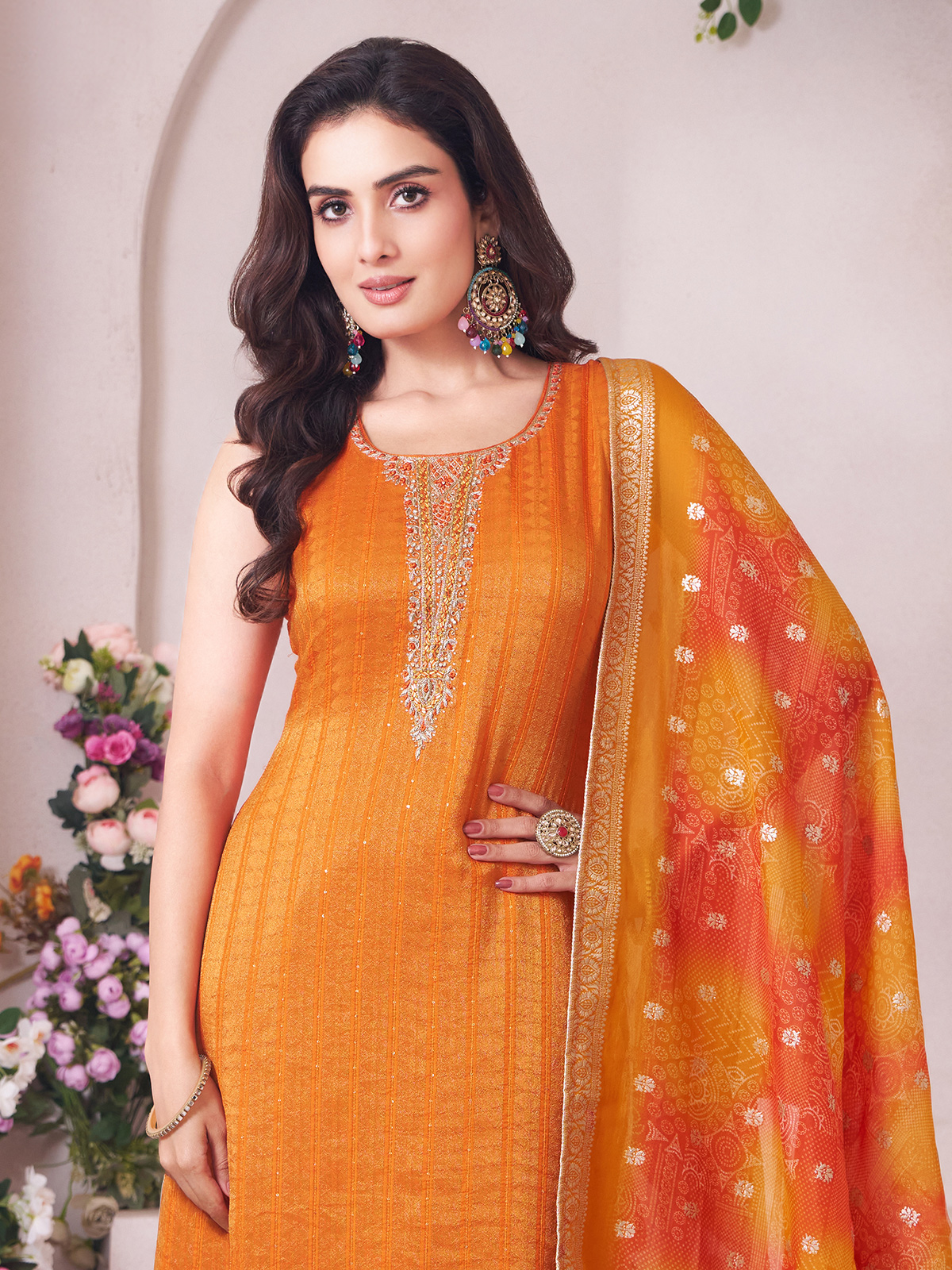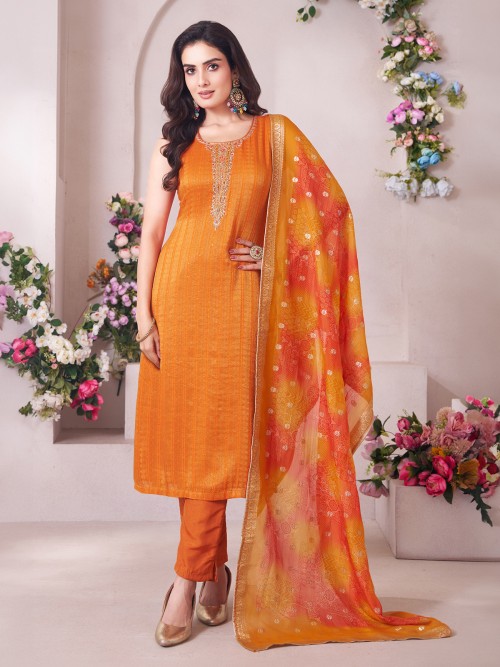 Drape yourself in vibrant elegance with this orange silk suit, highlighted by detailed zardosi, mirror, sequins, cutdana, and thread work. Its sleeveless straight-cut silhouette with a round neckline pairs perfectly with pants and a dupatta—making it ideal for festive events and traditional gatherings.