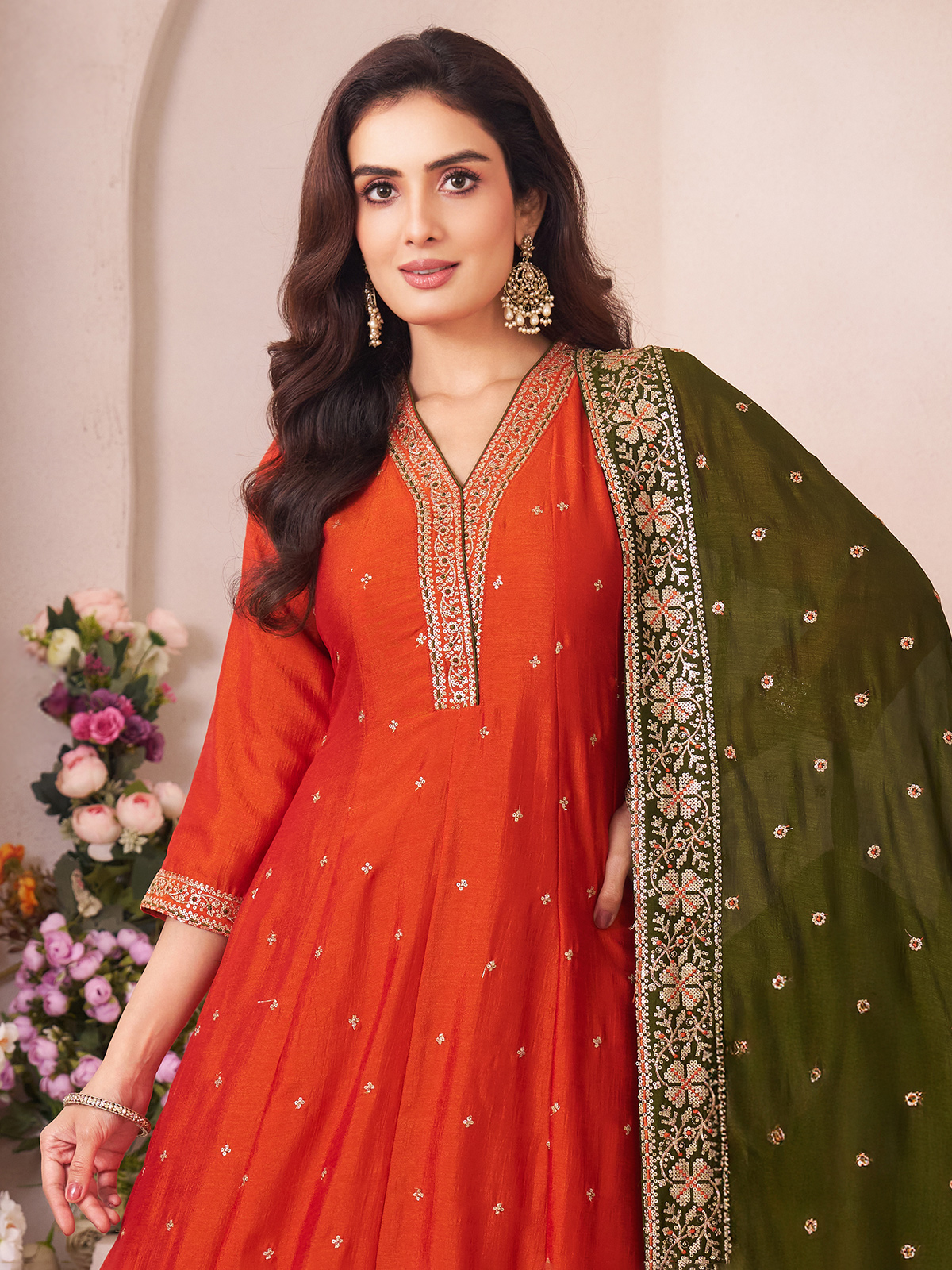 Highlighting your regal elegance, this orange silk anarkali suit beautifully flatters every silhouette with its rich appeal. Crafted with a stylish V-neck and quarter sleeves, it showcases intricate resham and sequins work for a festive glow. Perfect for festive gatherings, weddings and sangeet functions, it is complemented with a pant and dupatta for a graceful statement.