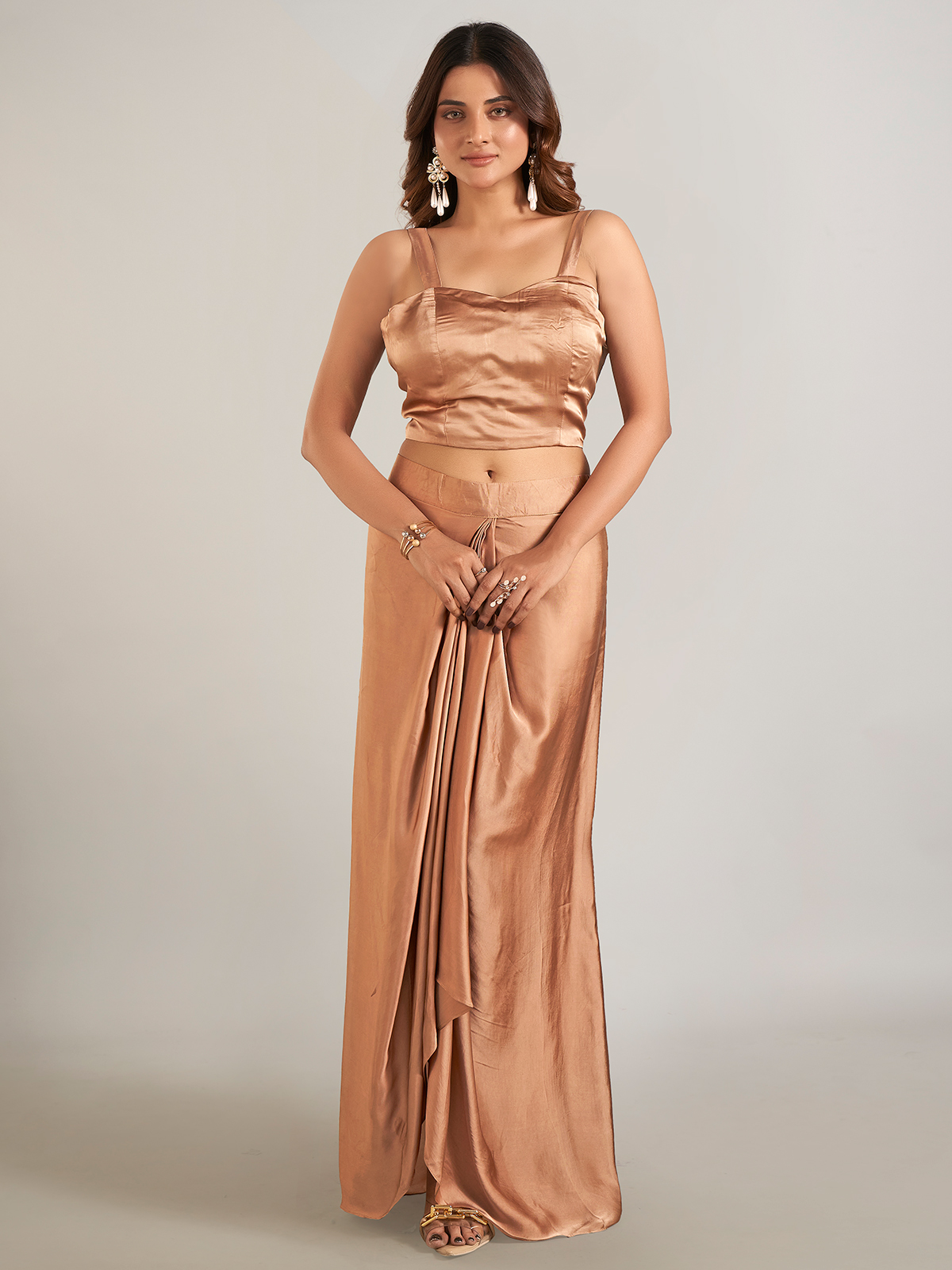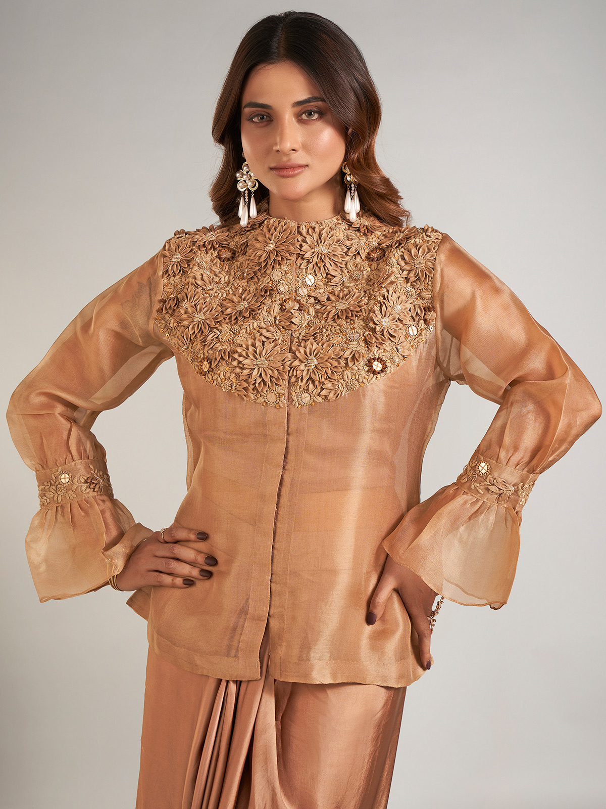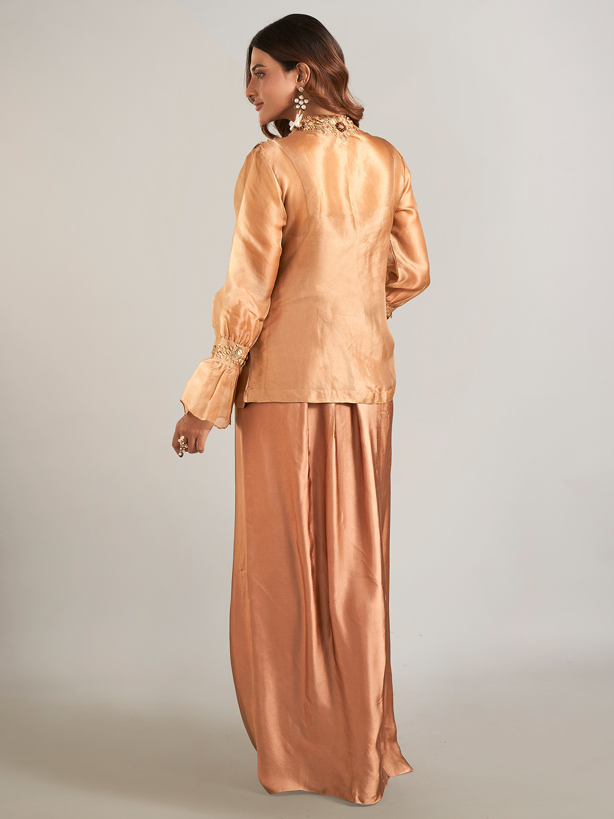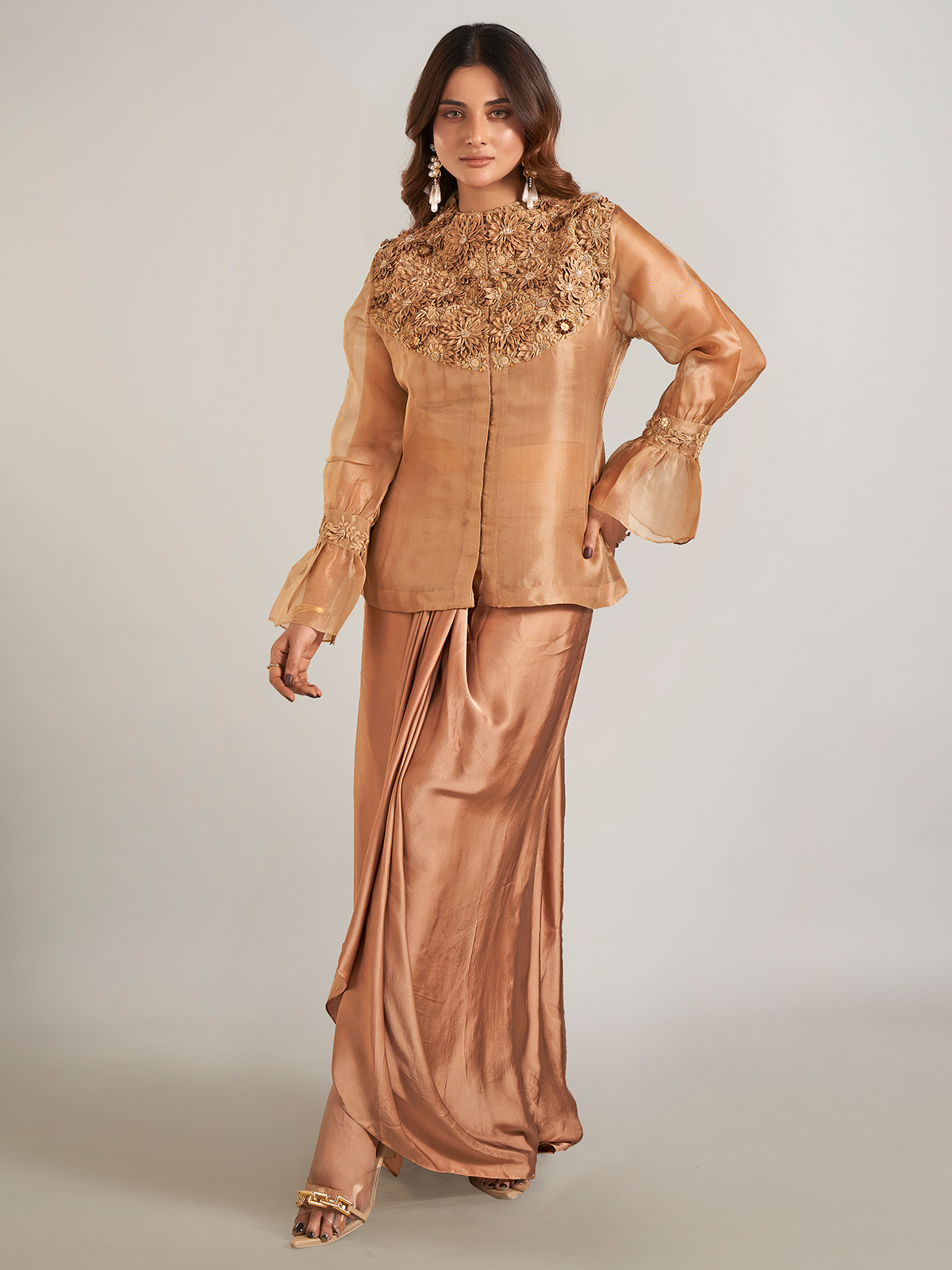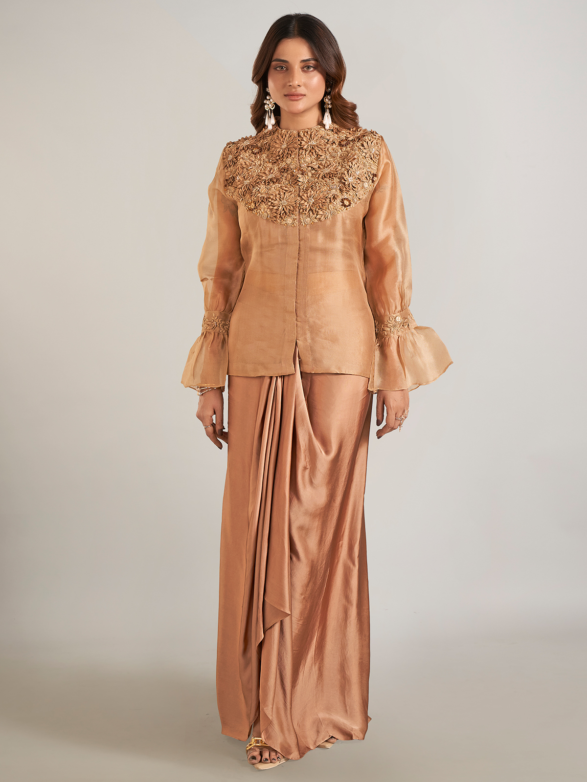Ideal for party ceremonies, this pastel brown satin silk indowestern suit is beautifully adorned with intricate embroidery, thread, sequins, and cutdana work. It boasts a round neckline and full sleeves for a polished look.
