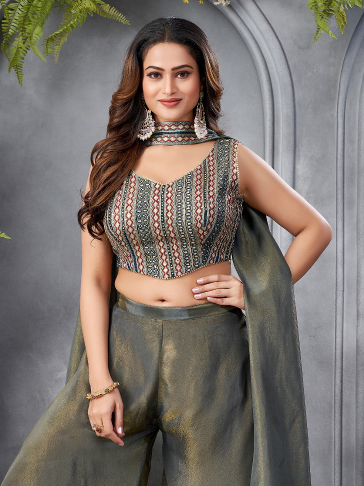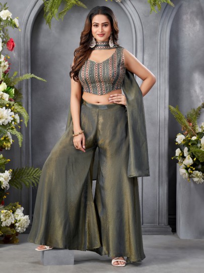 Subtle sophistication defines this pastel grey silk palazzo suit crafted with refined festive charm. The sleeveless kurti features a delicate sweetheart neckline highlighted with thread work, shimmering sequins and gota accents. Styled with comfortable palazzo pants and a graceful dupatta, the ensemble forms an elegant ethnic silhouette ideal for weddings, receptions and festive evening celebrations.