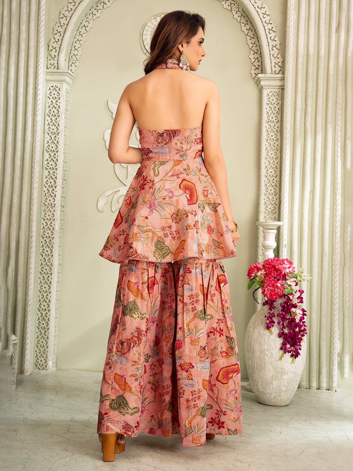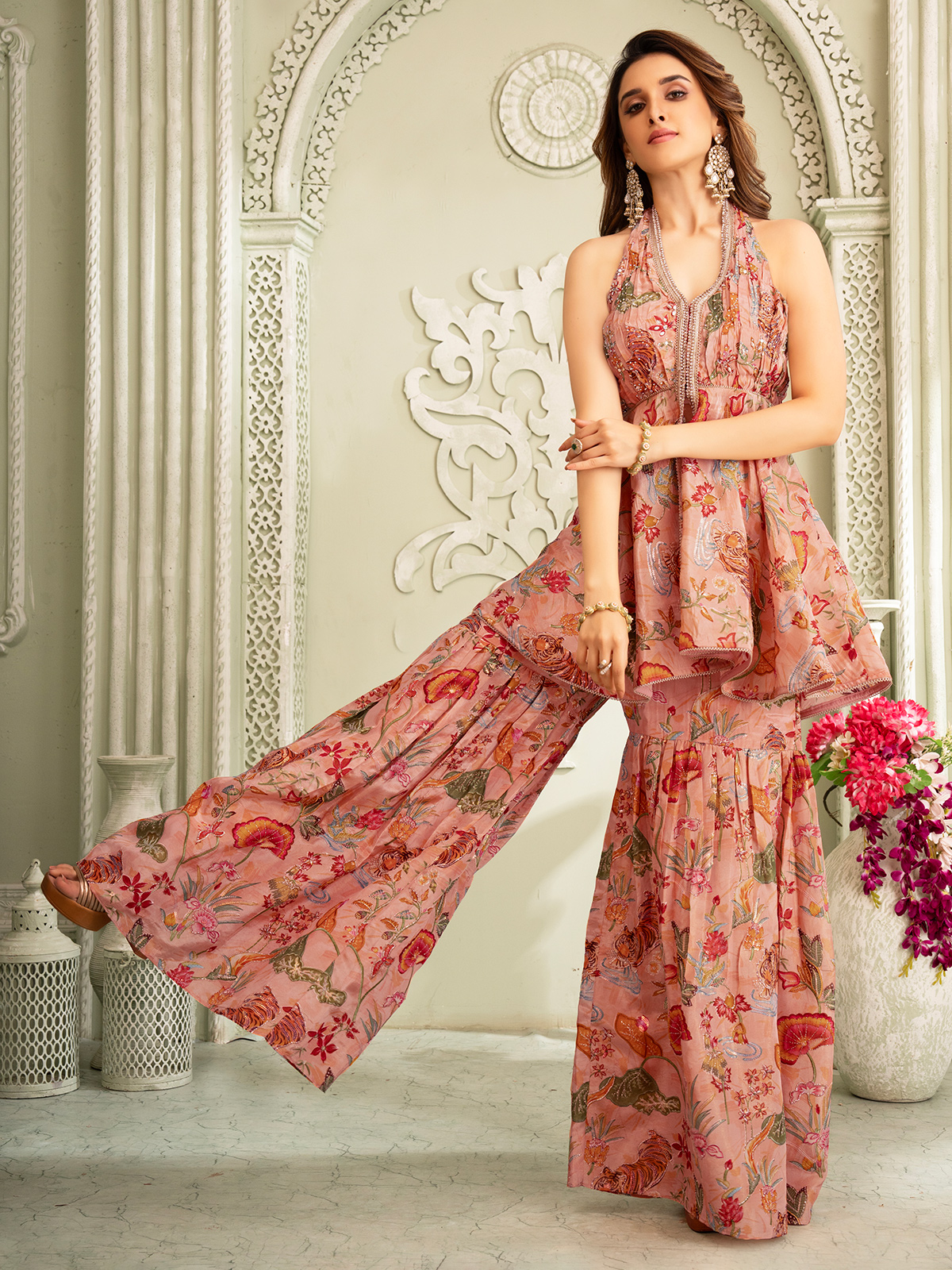 Pastel Peach Silk Sharara Suit With Designer Print Detailing