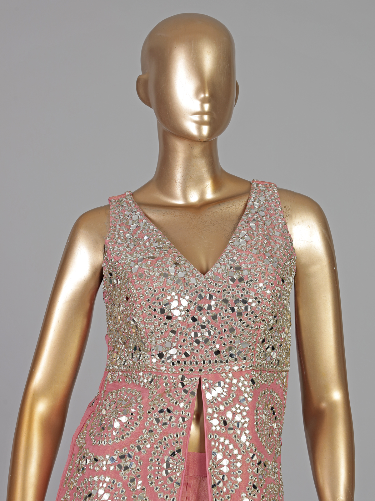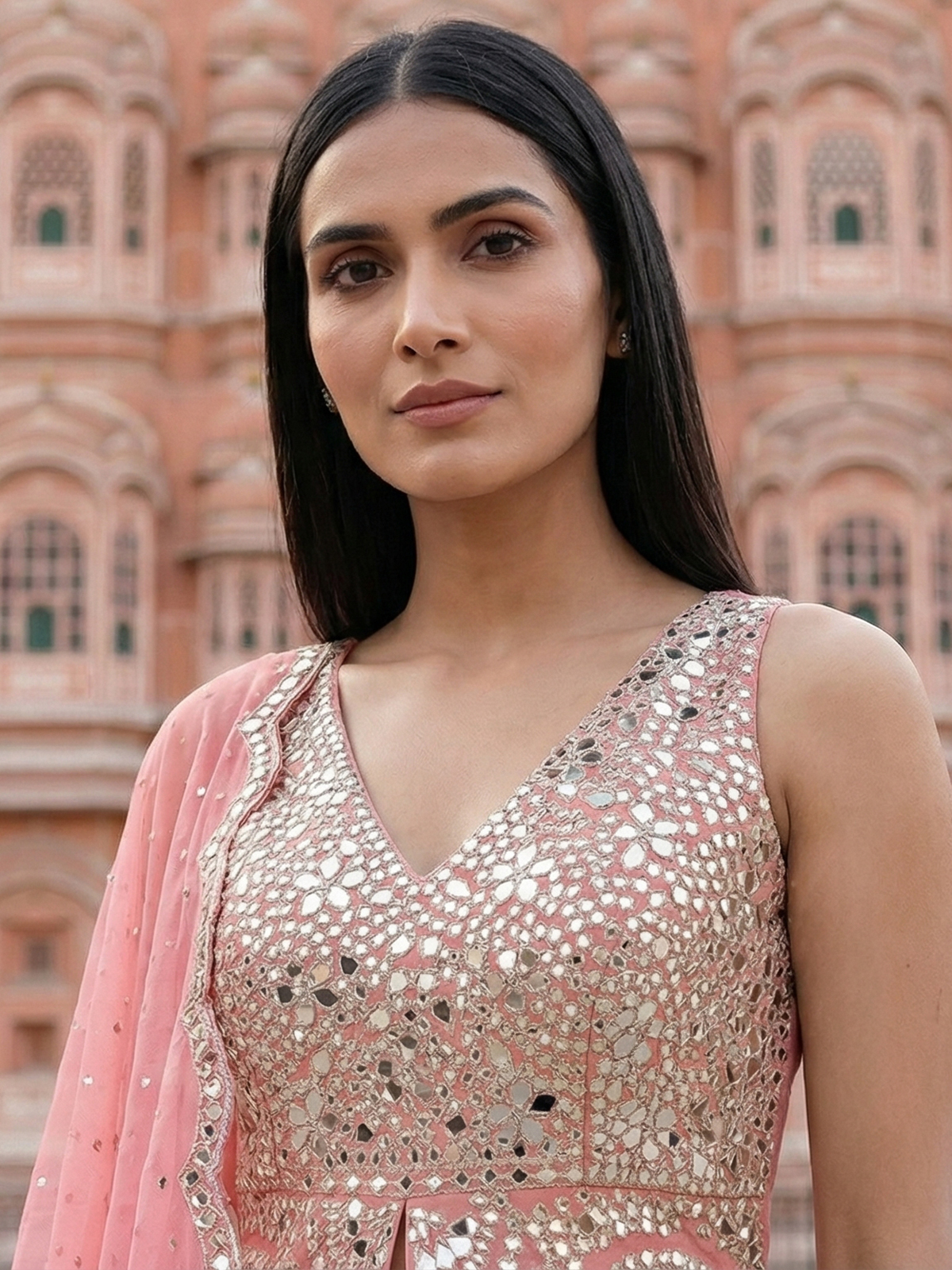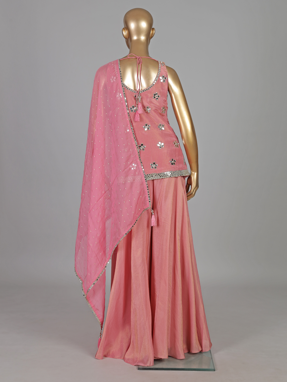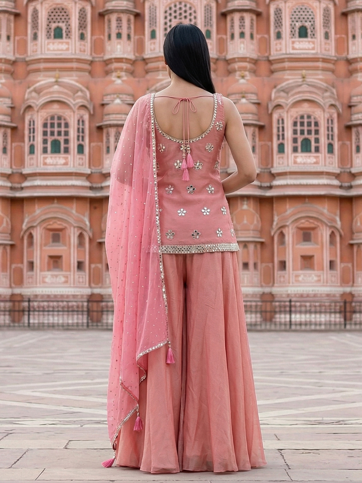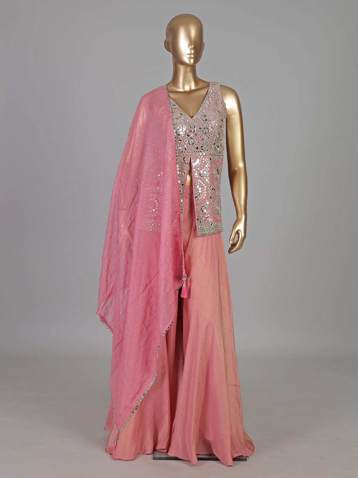 Soft pastel pink tones highlight this silk palazzo suit. Designed for elegant celebrations. Adorned with aabla and diamond embellishments. It radiates delicate sparkle. The V neckline and sleeveless silhouette enhance its graceful charm. Paired with a dupatta and palazzo. It is perfect for weddings and festive occasions.