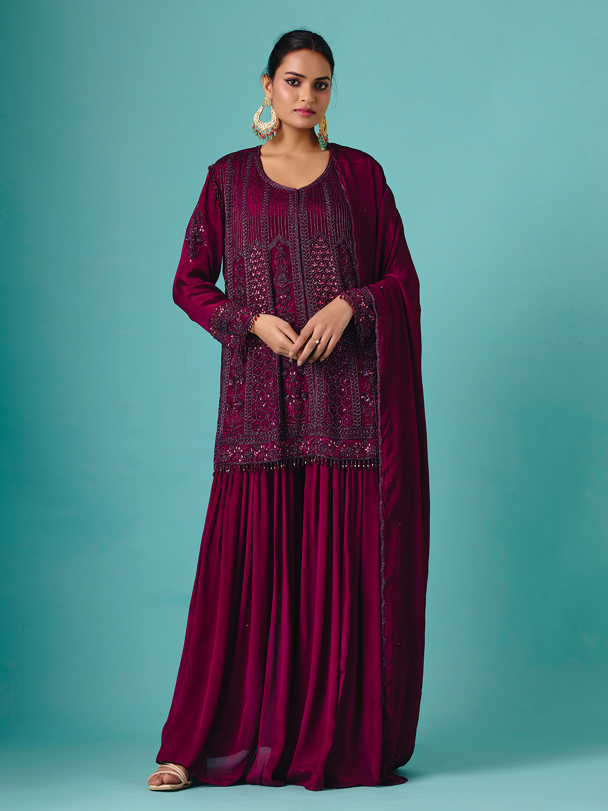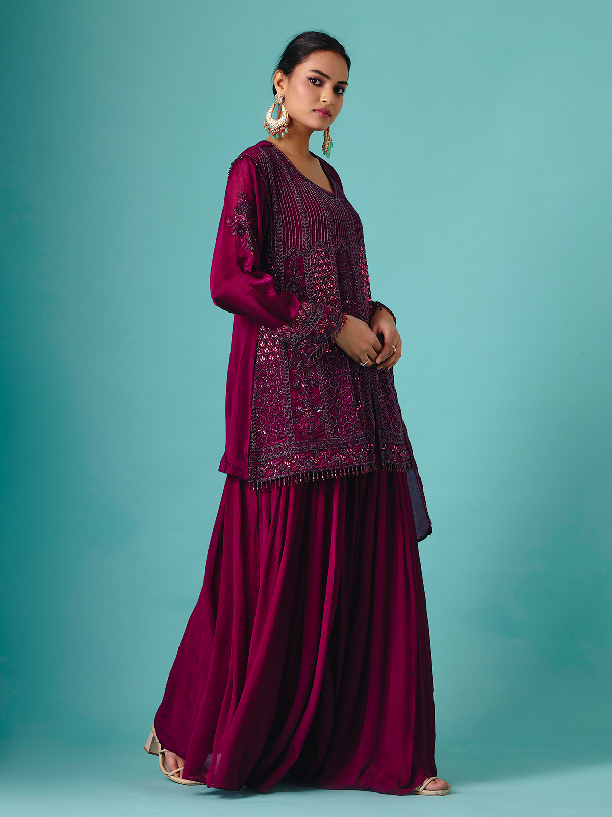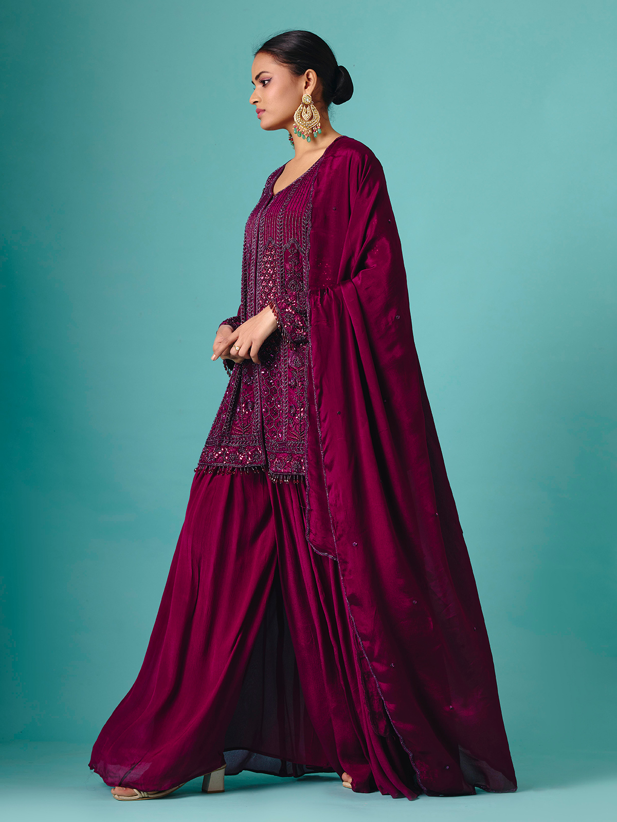 Soft pastel purple georgette silk shapes this palazzo suit, embellished with heavy cutdana, beads, and embroidery detailing. Full sleeves enhance the regal silhouette, while the flowing palazzo bottoms create effortless grace. Completed with a matching dupatta, this design radiates elegance for wedding and reception occasions, blending luxurious shimmer with delicate festive artistry.