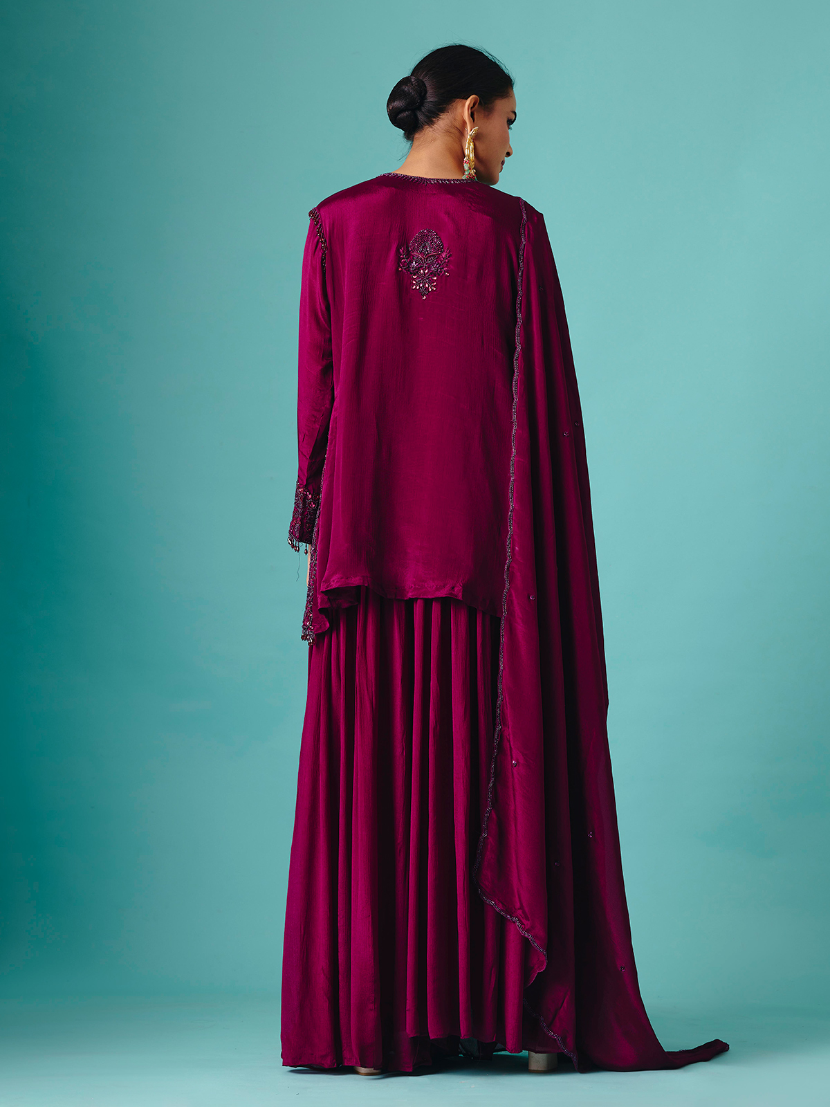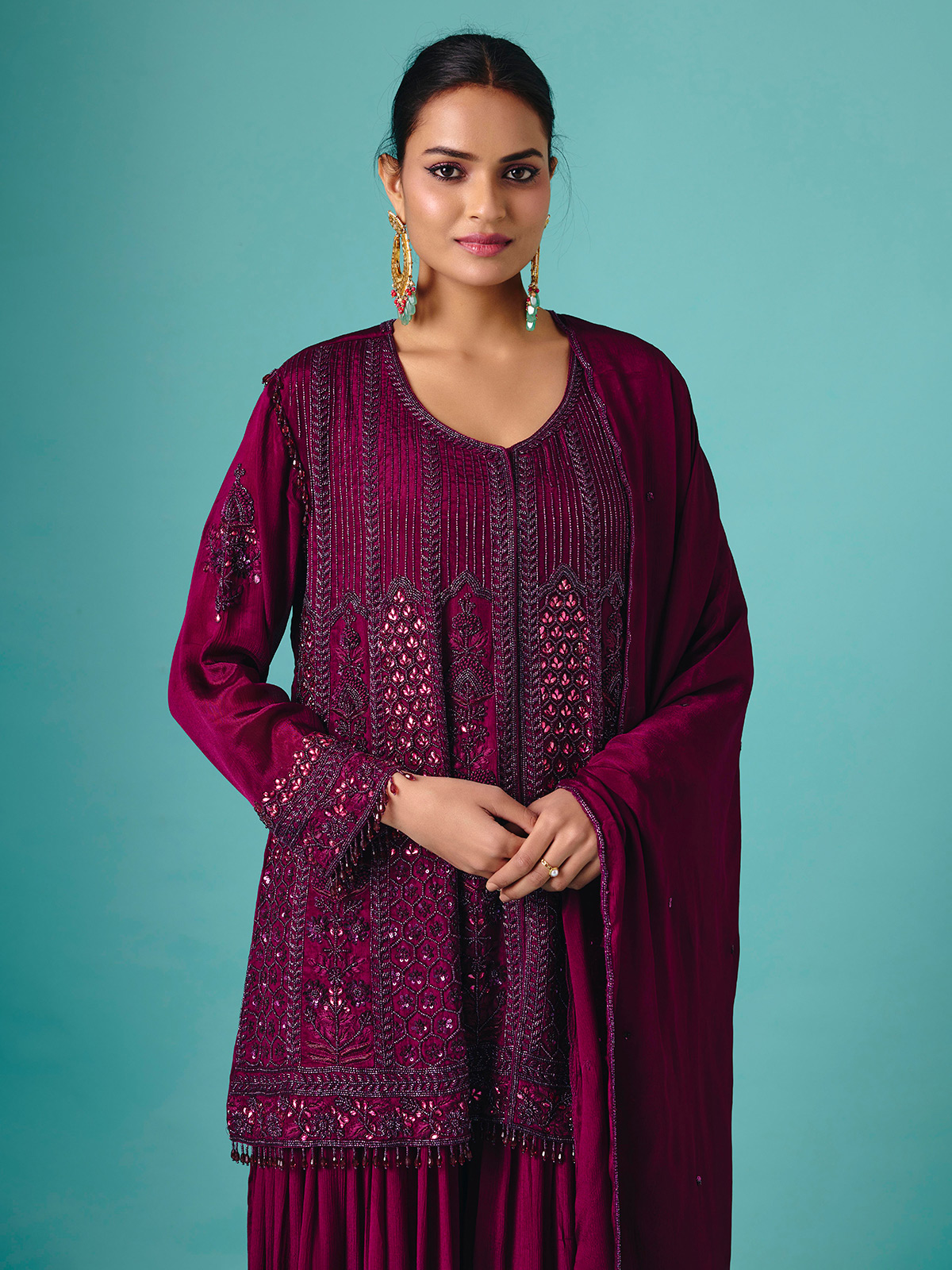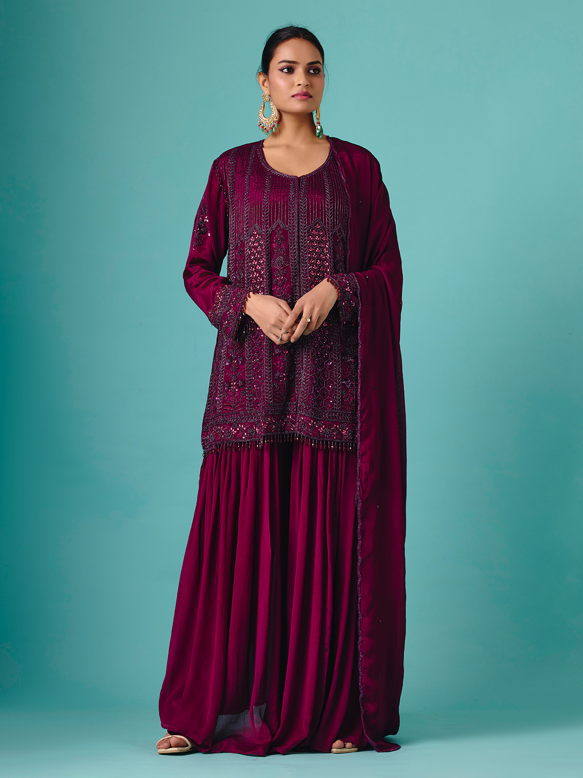 Soft pastel purple georgette silk shapes this palazzo suit, embellished with heavy cutdana, beads, and embroidery detailing. Full sleeves enhance the regal silhouette, while the flowing palazzo bottoms create effortless grace. Completed with a matching dupatta, this design radiates elegance for wedding and reception occasions, blending luxurious shimmer with delicate festive artistry.