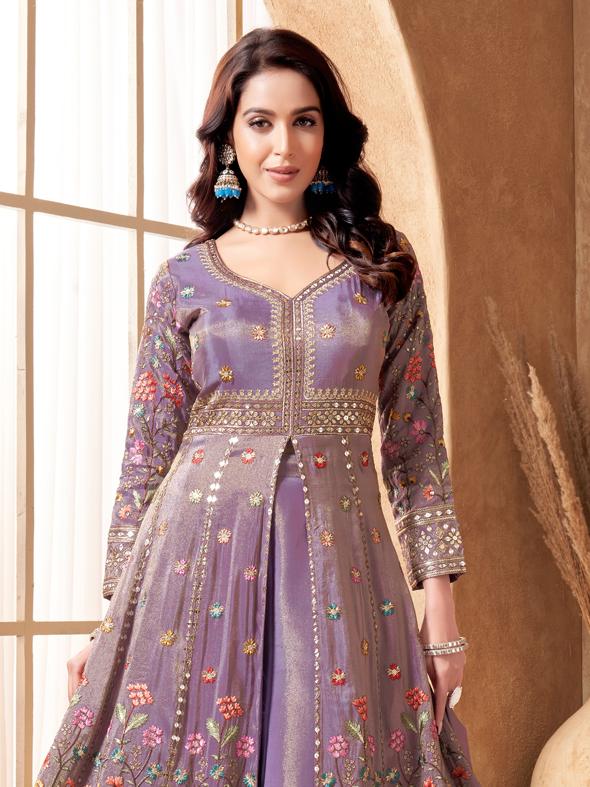 A pastel purple silk anarkali adorned with embroidery and sequins work. Styled with a sweetheart neckline and quarter sleeves, it comes with a dupatta and palazzo, perfect for festive and wedding celebrations.