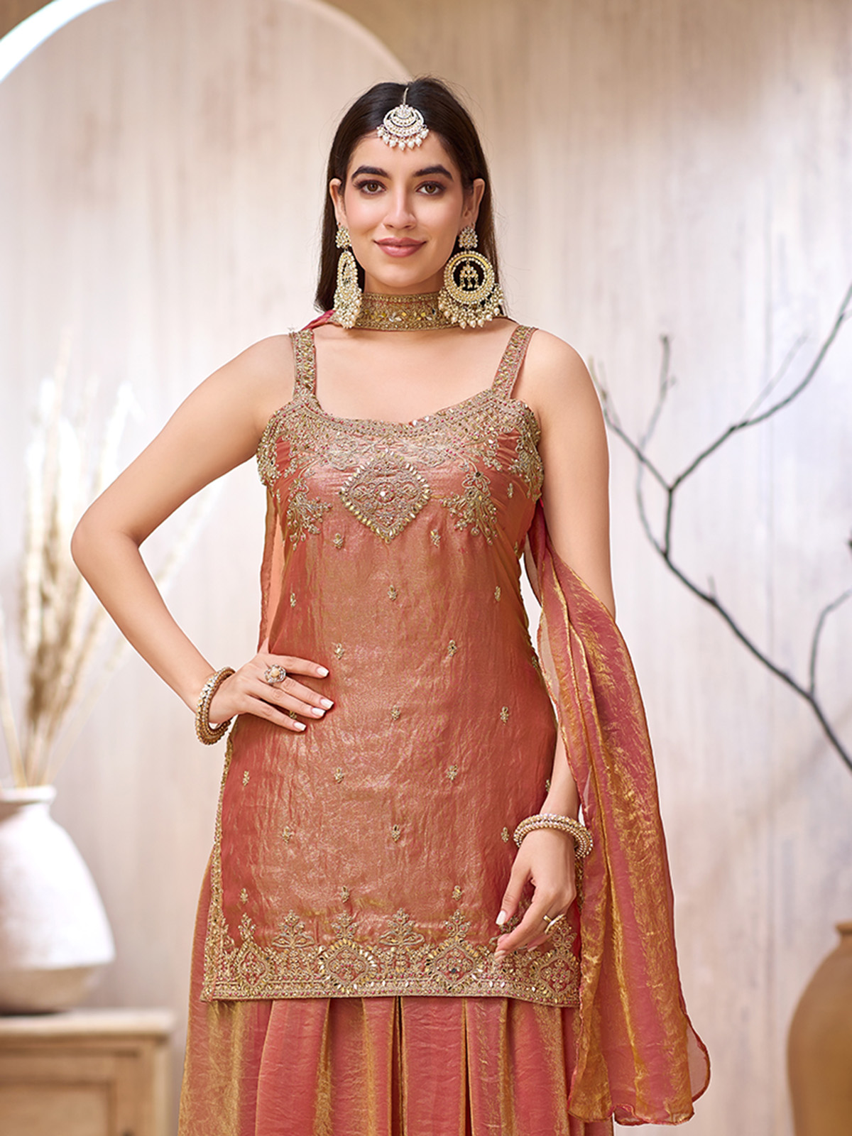 Soft peach hues bring graceful charm to this chinon silk punjabi style palazzo suit. The sleeveless kurti features a refined round neckline enhanced with thread, diamond, stone and mirror embellishments. Paired with comfortable palazzo bottoms and a flowing dupatta, the ensemble creates a sophisticated festive look perfect for weddings, receptions and celebratory gatherings.