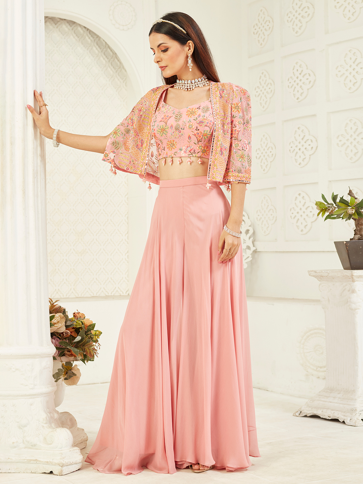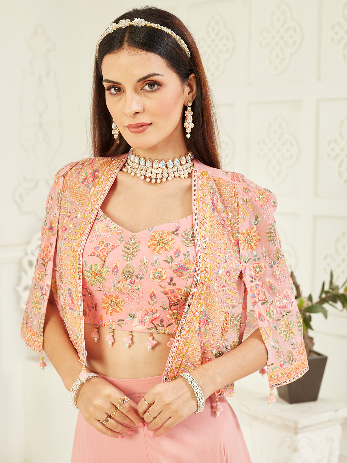 Radiate festive allure in this peach georgette jacket palazzo suit, shimmering with resham, mirror, cowrie shells, cutdana, stone, and sequins artistry. The graceful jacket drape paired with soft-flowing palazzos reflects timeless elegance a perfect harmony of modern charm and traditional splendour for weddings and joyous celebrations.