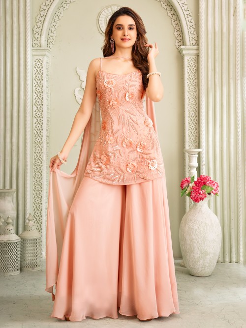 Peach Georgette Palazzo Suit Featuring Bead And Sequin Accents
